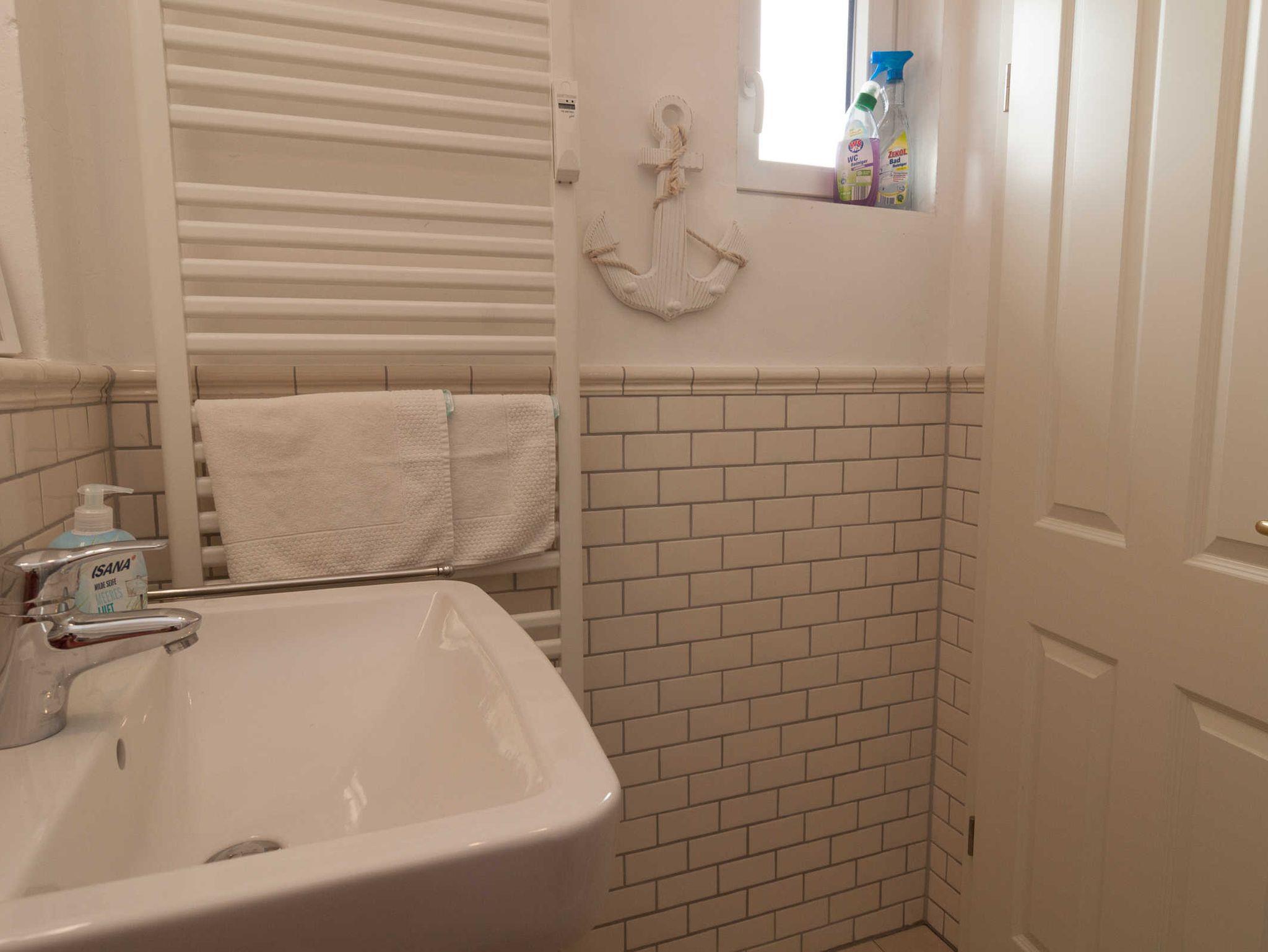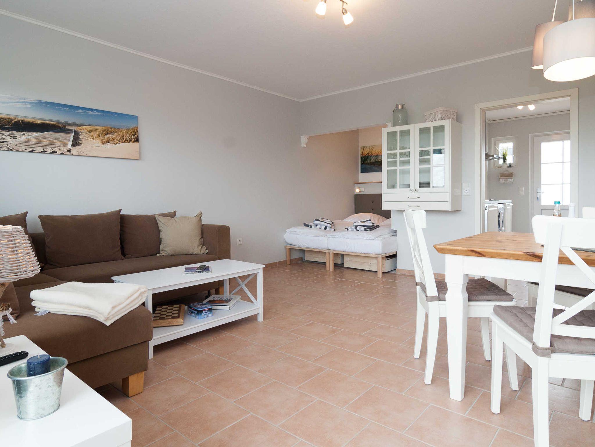 Moderne und helle Ferienwohnung mit einem Duschbad und einer separaten Küchenzeile. Im Wohnraum befinden sich eine gemütliche Sofaecke mit Flachbildschirm und einem gemütlichen Essbereich. Vom Doppelbett können Sie auch die abendlichen Nachrichten im Fernsehen genießen.