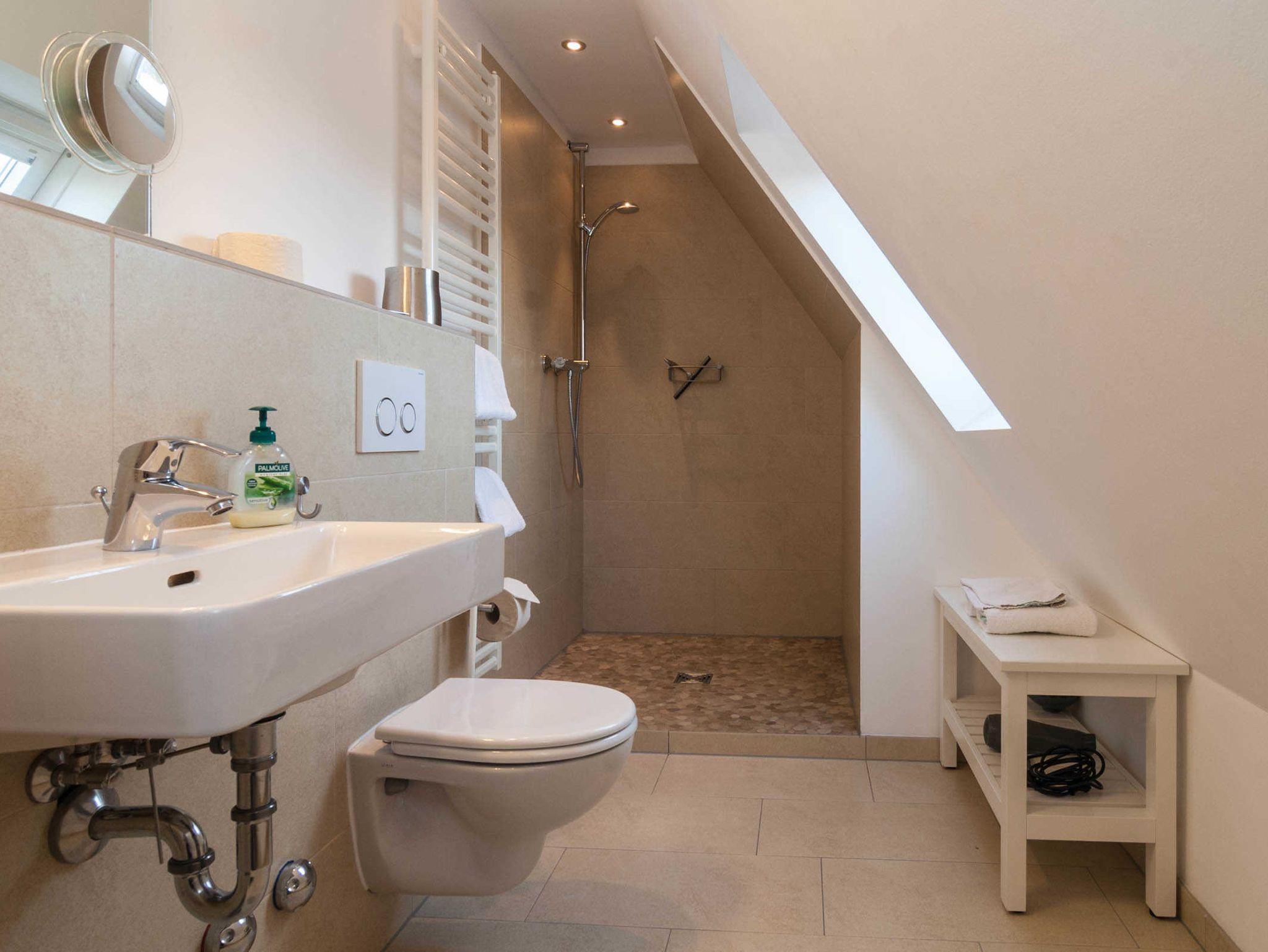 Im Obergeschoss/Dachgeschoss finden Sie 3 Schlafzimmer mit Doppelbetten und ein Schlafzimmer mit 2 Einzelbetten, sowie ein Duschbad und ein weiteres kleines Wohnzimmer, welches als Fernsehzimmer genutzt wird.