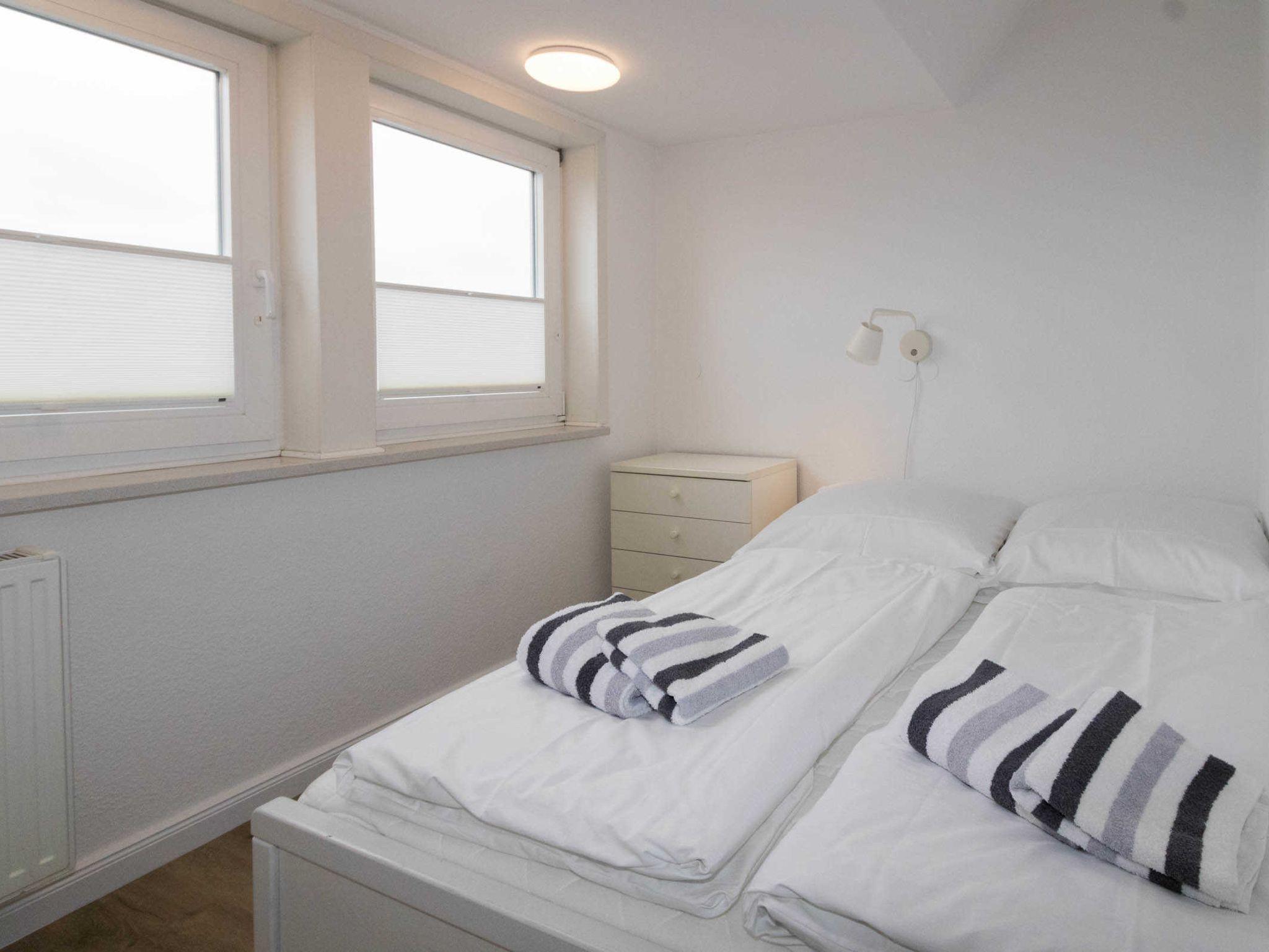 Die Wohnung 2 verfügt über einen kombinierten Wohn-Schlafraum mit einem Schrankbett. Die kleine Küchenzeile ist vom Wohnraum optisch abgetrennt und hat einen 2-Platten-Herd, Mikrowelle und Kühlschrank mit Gefrierfach. Das Schrankbett im Wohnbereich kann einzeln ausgeklappt werden. Der Esstisch ist für 4 Personen ausgerichtet. Zur Wohnung gehört noch ein weiteres kleines Zimmer mit 2 Einzelbetten, für die 3. und 4. Person.