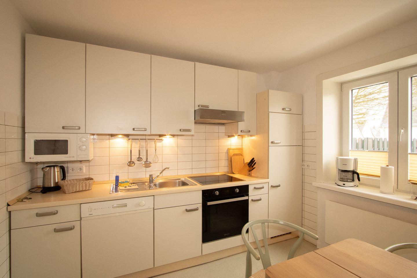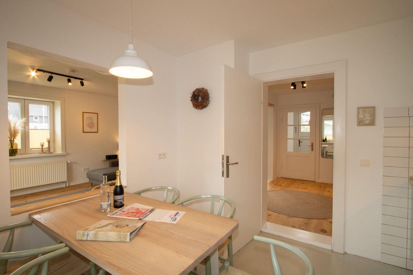 Im Haus erwarten Sie ein Wohnzimmer mit Sofaecke, Sofa, Sesseln, TV mit Satellitenanschluss sowie Radio und WLAN. Der separate Küchenbereich mit Esstisch ist funktional ausgestattet und verfügt über Ceranherd, Backofen, Mikrowelle, Spülmaschine, Kühlschrank mit Gefrierfach, Wasserkocher, Toaster, Kaffeemaschine und Küchenutensilien. Ein Essbereich ergänzt das Raumangebot und schafft angenehme Bedingungen für gemeinsame Mahlzeiten.