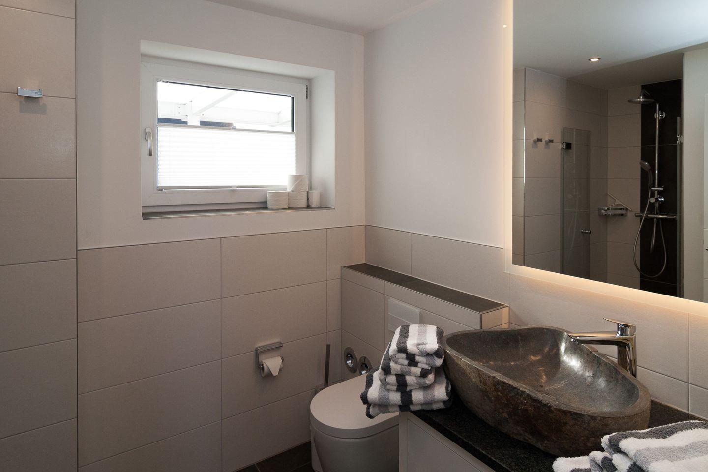 Nach Westen liegt das Schlafzimmer mit großem Doppelbett, Kleiderschrank, Kommode, TVSAT und Terrasse mit Holzboden und Gartenmöbeln, ein zweites Fenster liegt Richtung Norden. Direkt neben dem Schlafzimmer befindet sich das große, helle, hochwerig ausgestattte DuschbadWC mit großem Fenster Richtung Westen