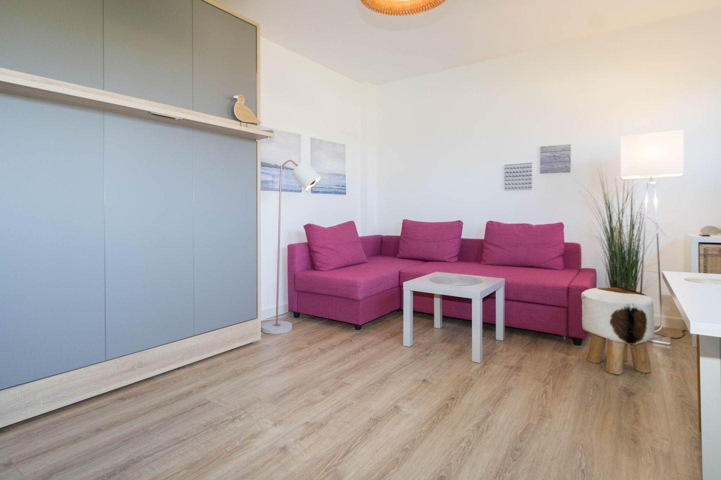 Mit viel Liebe und Sorgfalt haben die Eigentümer diese gemütliche Wohnung eingerichtet. Sie ist aufgeteilt in einen kombinierten Wohn-Schlafraum, eine kleine seperate Küche und ein Innen liegendes Duschbad. Die neue Küche ist mit einem Geschirrspüler, einer Mikrowelle sowie einem 2-Platten Herd ausgestattet. Der Wohn-Schlafraum verfügt über eine kleine Essecke, eine gemütliche, ausziehbare Sofaecke und einem Schrankbett mit einer Liegefläche von 1,40 Breite x 2,00 Länge mtr. Neben einem Flat-Screen-Fernseher steht Ihnen auch ein DVD-Player und eine kleine Stereoanlage zur Verfügung.