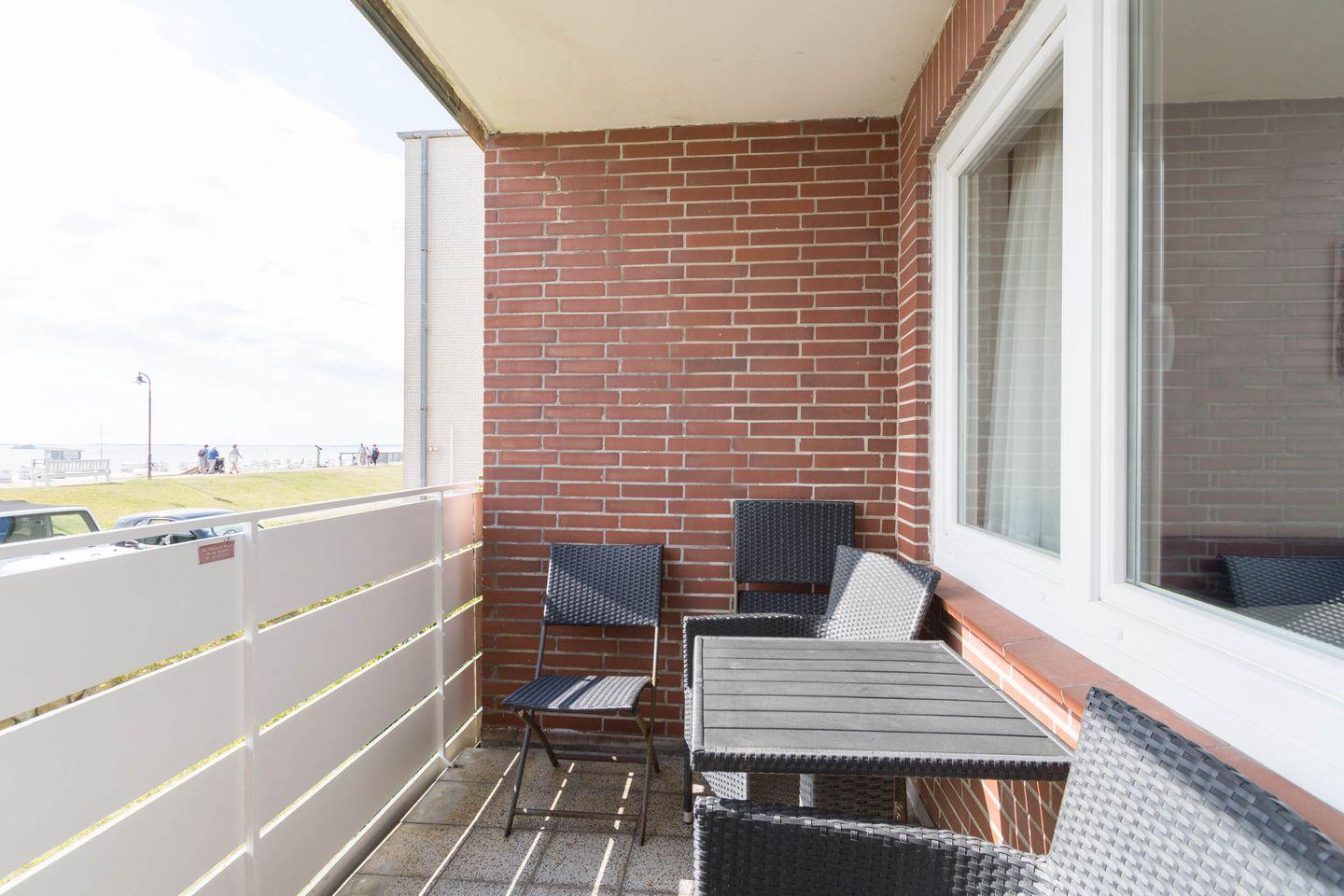 Zur Wohnung gehören zwei Schlafzimmer, eines ist mit Doppelbett und eines mit zwei einzelnen, eingebauten Kojenbetten eingerichtet. Das Duschbad verfügt über eine eigene Waschmaschine. Der Wohnraum bietet einen fantastischen Blick und hat eine Sitzecke direkt am Panoramafenster. Der Essplatz im Wohnbereich hat Platz für 6 Personen. Neben dem Flatscreen-Fernseher ist auch WLAN vorhanden. Vom Wohnbereich aus gelangen Sie auf den Ostbalkon, der mit Balkonmöbeln ausgestattet ist. Die Küche bietet alles, was man braucht, um gemütlich in der Ferienwohnung zu kochen