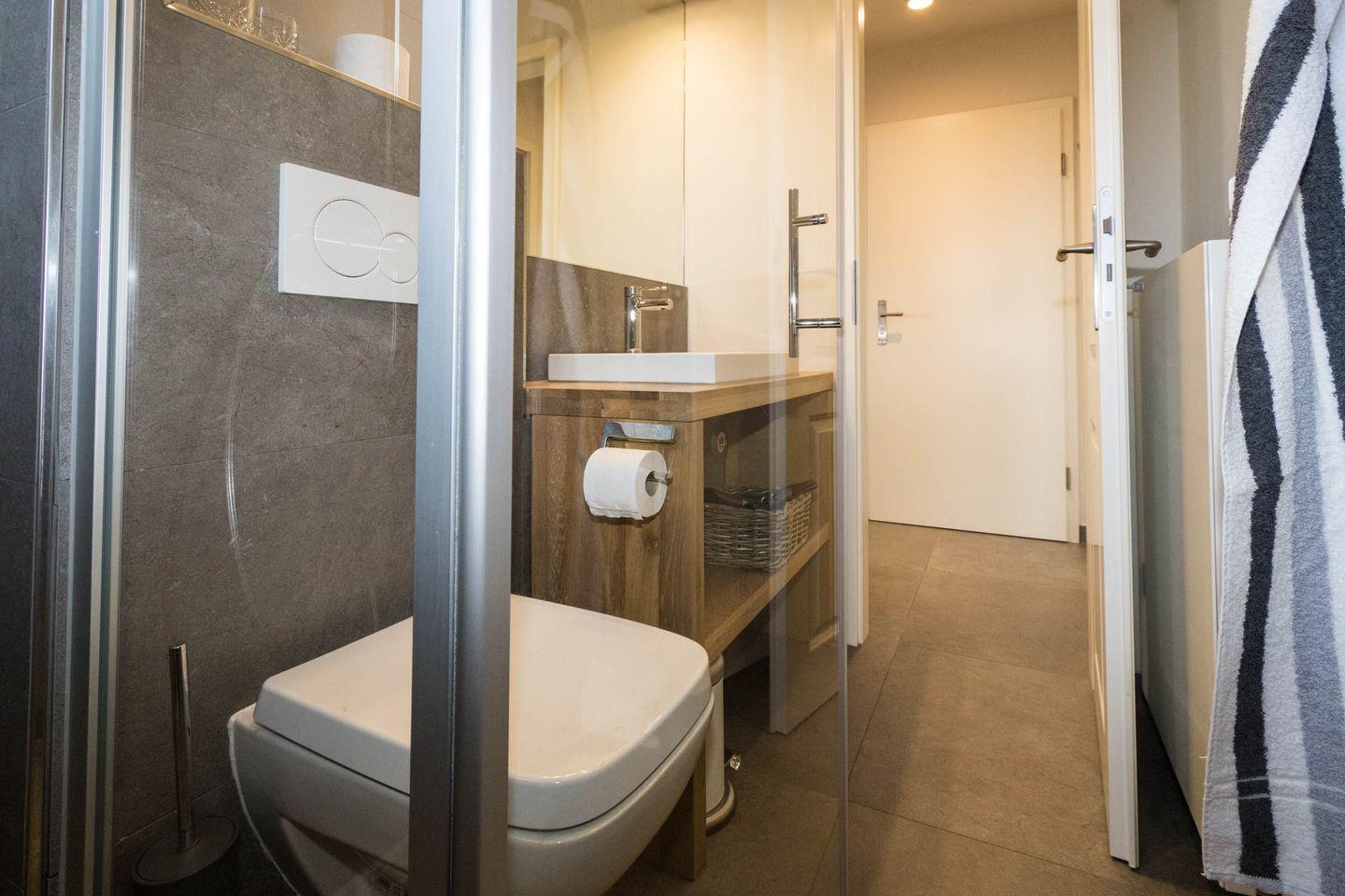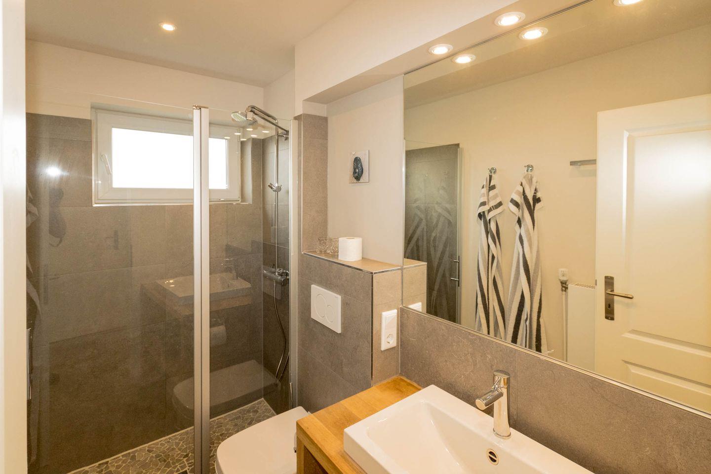 Auf dieser Ebene befindet sich auch das moderne Bad mit Dusche und WC sowie ein Schlafzimmer mit Doppelbett.