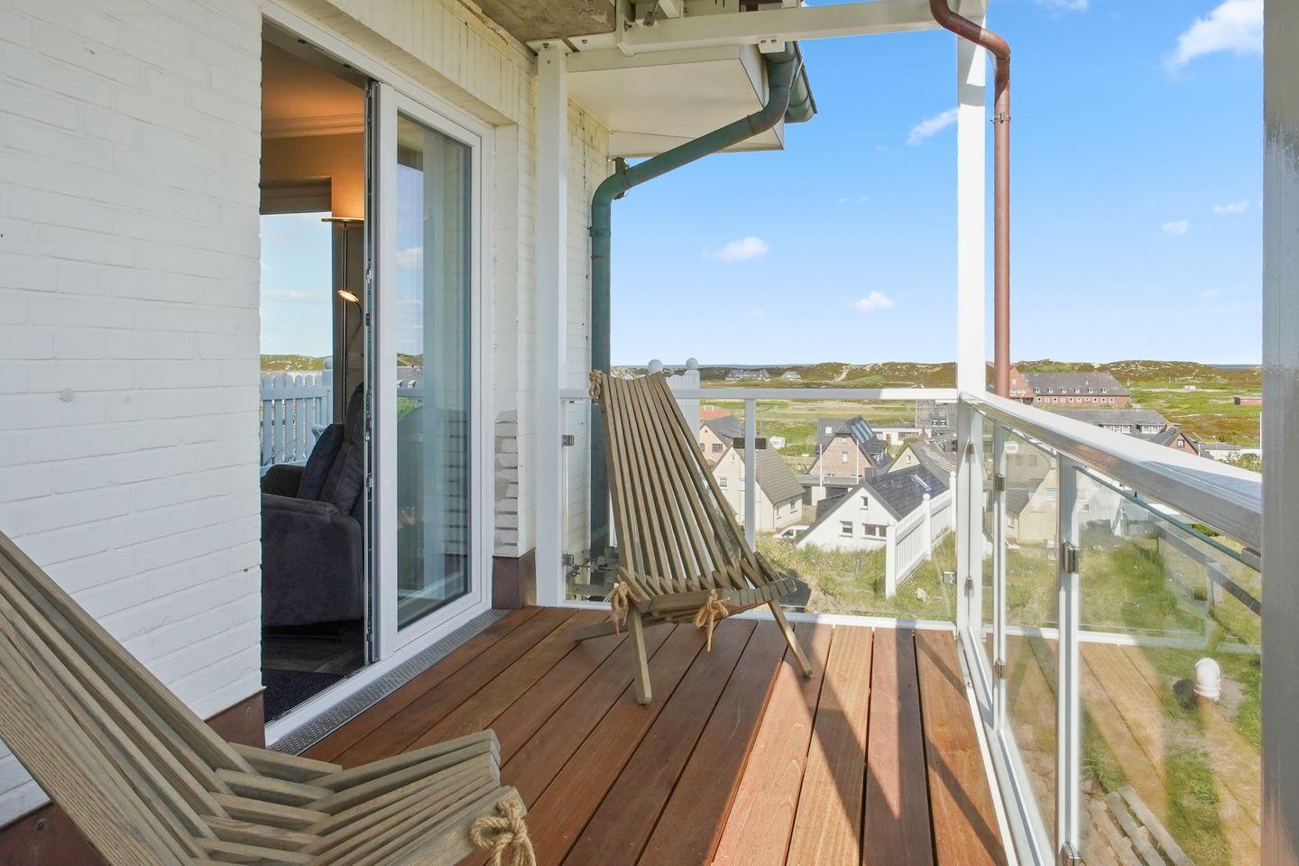Eine geräumige Terrasse lädt zum Frühstücken, Sonnenbaden oder Entspannen ein und bietet einen atemberaubenden Blick zu allen Seiten auf das Meer und die naturgeschützte Dünenlandschaft. Hier können Sie Ihren Urlaub auf Sylt mit einem Frühstück im Freien beginnen oder den Abend bei einem Glas Wein ausklingen lassen. Zudem stehen Ihnen ein kostenfreies WLAN zur Verfügung. Für Ihr Auto gibt es direkt vor dem Haus einen kostenfreien Parkplatz und Ihre Fahrräder können Sie in der geschützten Garage unterstellen.