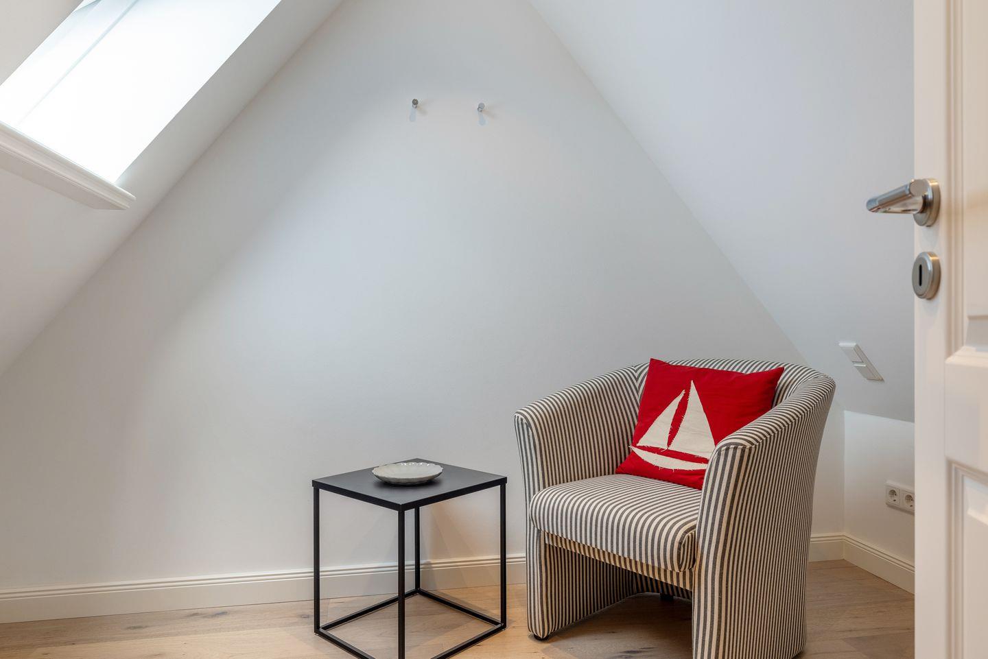 Das Dachgeschoss ist das Reich der "kleinen Leute". Hier befindet sich das im Giebel eingebaute Einzelbett (120x200cm) welches ideal für Kinder ist.