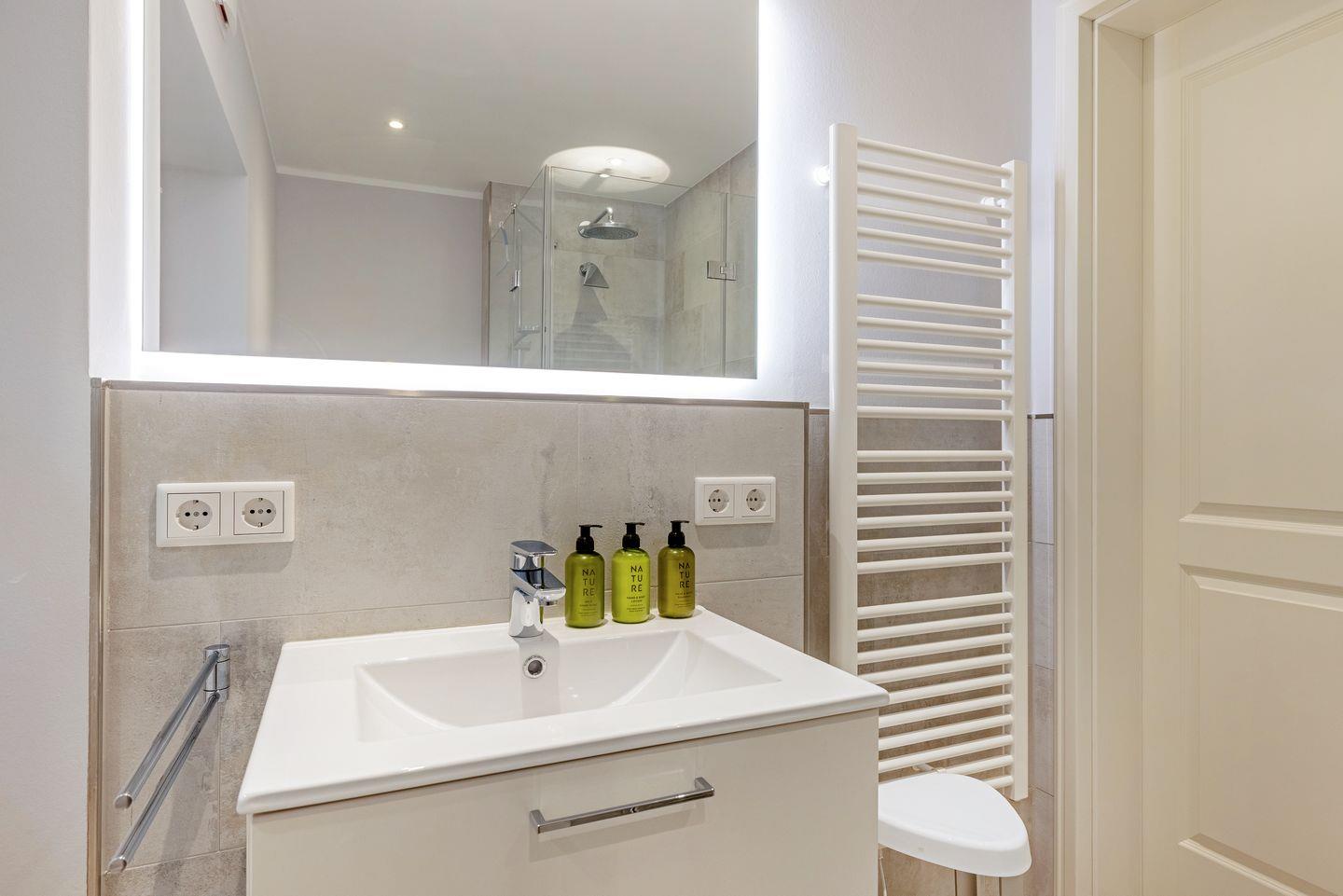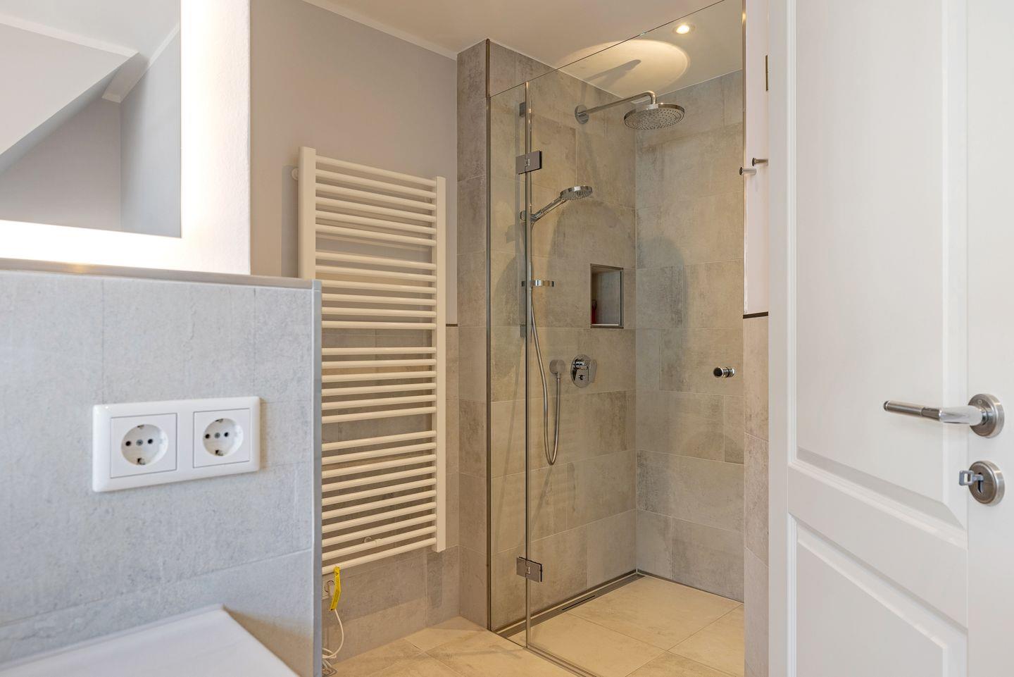 Im Obergeschoss befindet sich ein weiterer Schlafraum mit Doppelbett (180x200cm) und einem weiteren Bad mit Dusche /WC, sowie einem Waschtrockner. In jedem der Bäder haben Sie einen Haartrockner und einen Kosmetikspiegel.