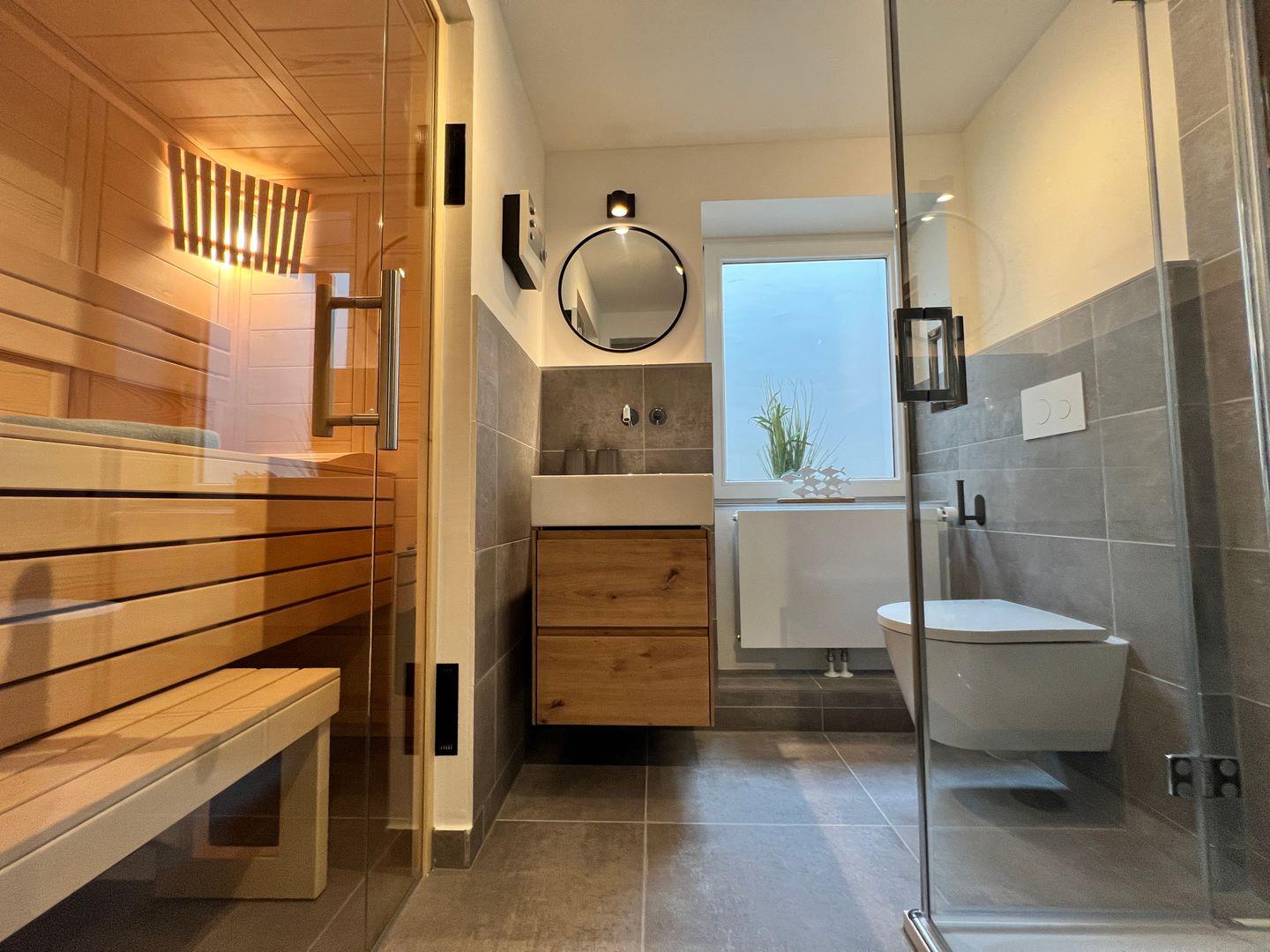 Die Ferienwohnung ist gemütlich eingerichtet und bietet Platz für 4 Personen. Im unteren Bereich der Wohnung finden Sie ein Schlafzimmer, Duschbad sowie die Sauna. Im oberen Bereich liegt das 2.Schlafzimmer mit angrenzendem Badezimmer. Des Weiteren gibt es hier eine neue moderne Küche mit sämtlichen Utensilien. Die große Couchgarnitur im Wohnberiech lädt zum Relaxen ein. Hier gibt es einen direkten Zugang zur großen Terrasse, die zum Südwesten ausgerichtet ist und viel Platz für 4 Personen inkl. einem Strandkorb bietet. Hier kann man die absolute Ruhe mit Blick ins Grüne genießen und die Seele baumeln lassen. Es ist nur 1 Haustier erlaubt und dieser wird mit 8 Euro / Nacht abgerechnet.