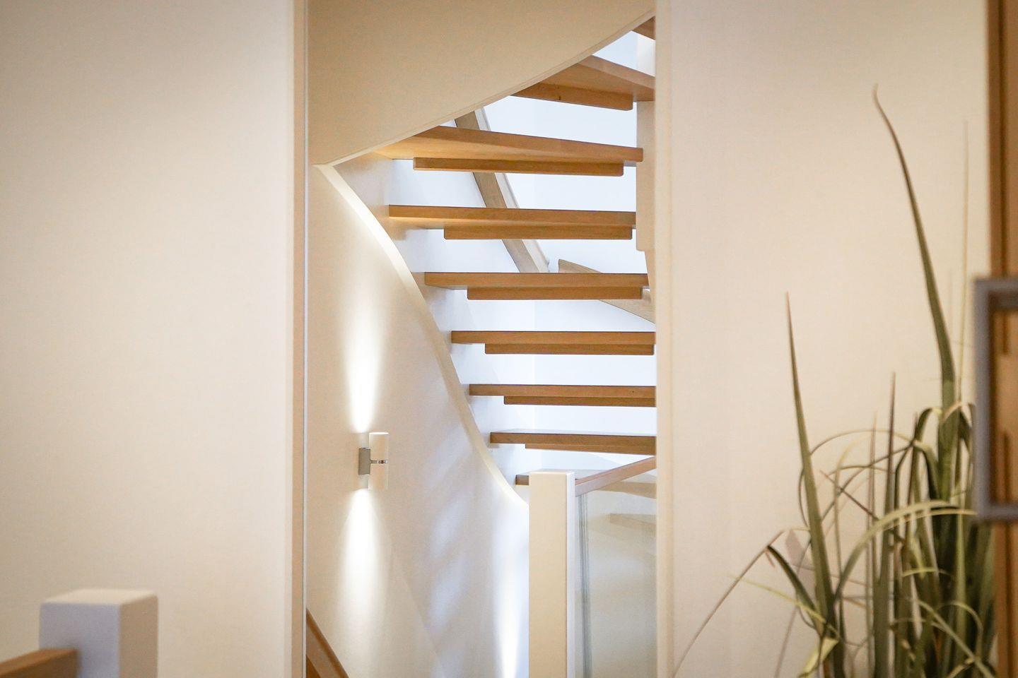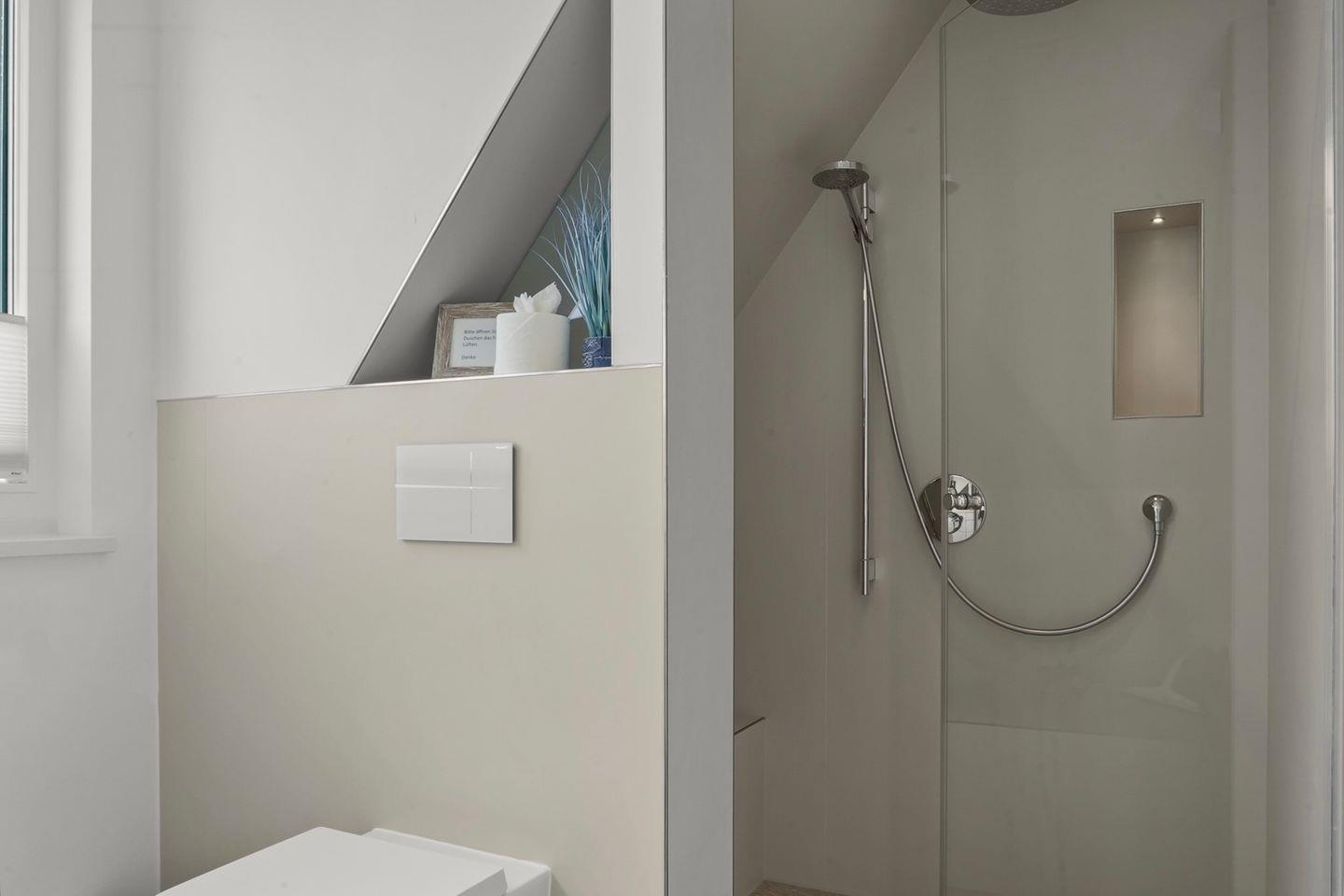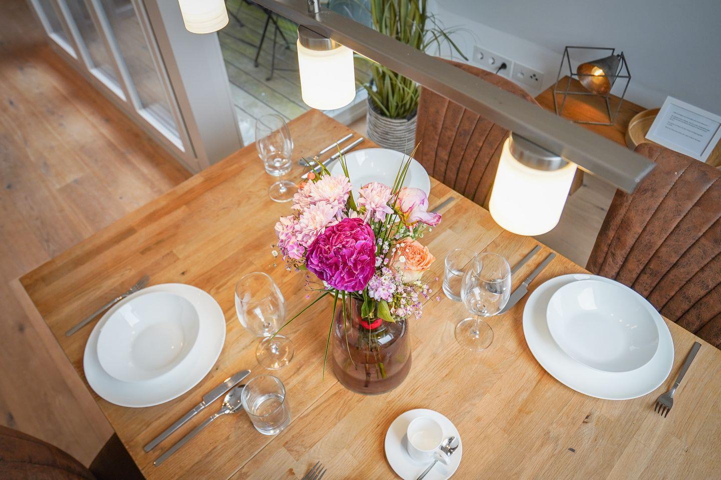 Die Wohnung befindet sich in einem stilvollen Neubau und erstreckt sich über Ober- und Dachgeschoss. Echtholzparkett und zahlreiche elegant integrierte Einbauleuchten sorgen für eine warme, behagliche Atmosphäre. Über die Diele im Erdgeschoss gelangen Sie über eine schöne Holztreppe ins Obergeschoss. Dort empfängt Sie ein offener Wohn- und Essbereich mit viel Tageslicht, ein großzügiges Badezimmer mit Dusche/WC sowie eine hochwertig ausgestattete Küche mit allem, was das Herz ambitionierter Hobbyköche höherschlagen lässt: Induktionskochfeld, Backofen mit integrierter Mikrowelle, Geschirrspüler, Nespresso-Maschine sowie edles Porzellan und Gläser.