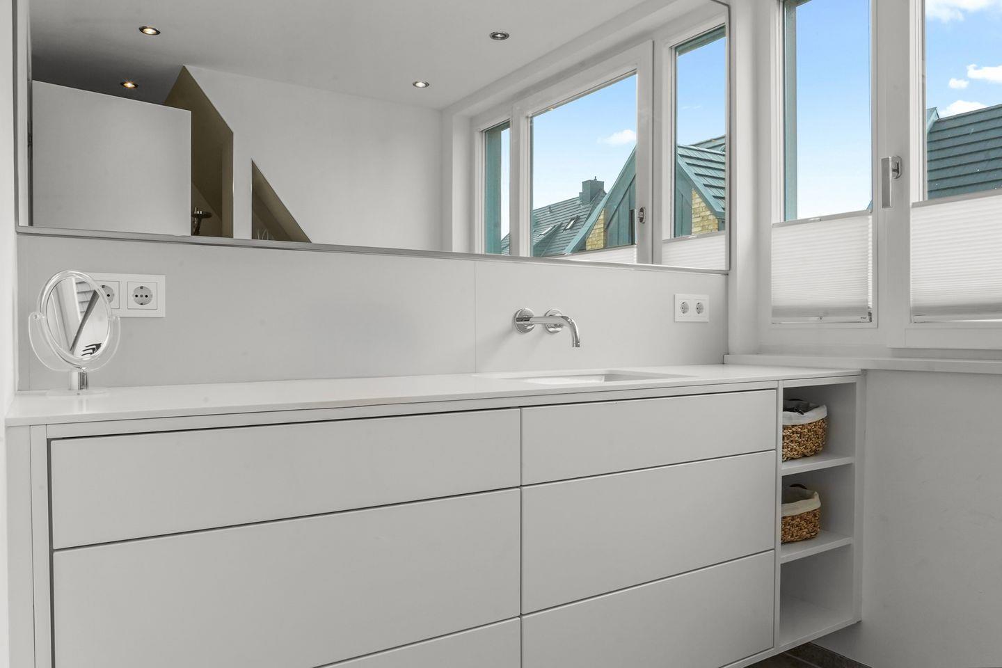 Ein weiteres Highlight erwartet Sie im oberen Geschoss: Das deckenhohe Schlafzimmer mit Ankleide, eigenem Flatscreen-TV sowie einem kleinen Ensuite-Badezimmer (Dusche/WC). Von den Dachfenstern genießen Sie einen traumhaften Blick über die Nordsee und das Wattenmeer – ein perfekter Ort zum Aufwachen und Abschalten.