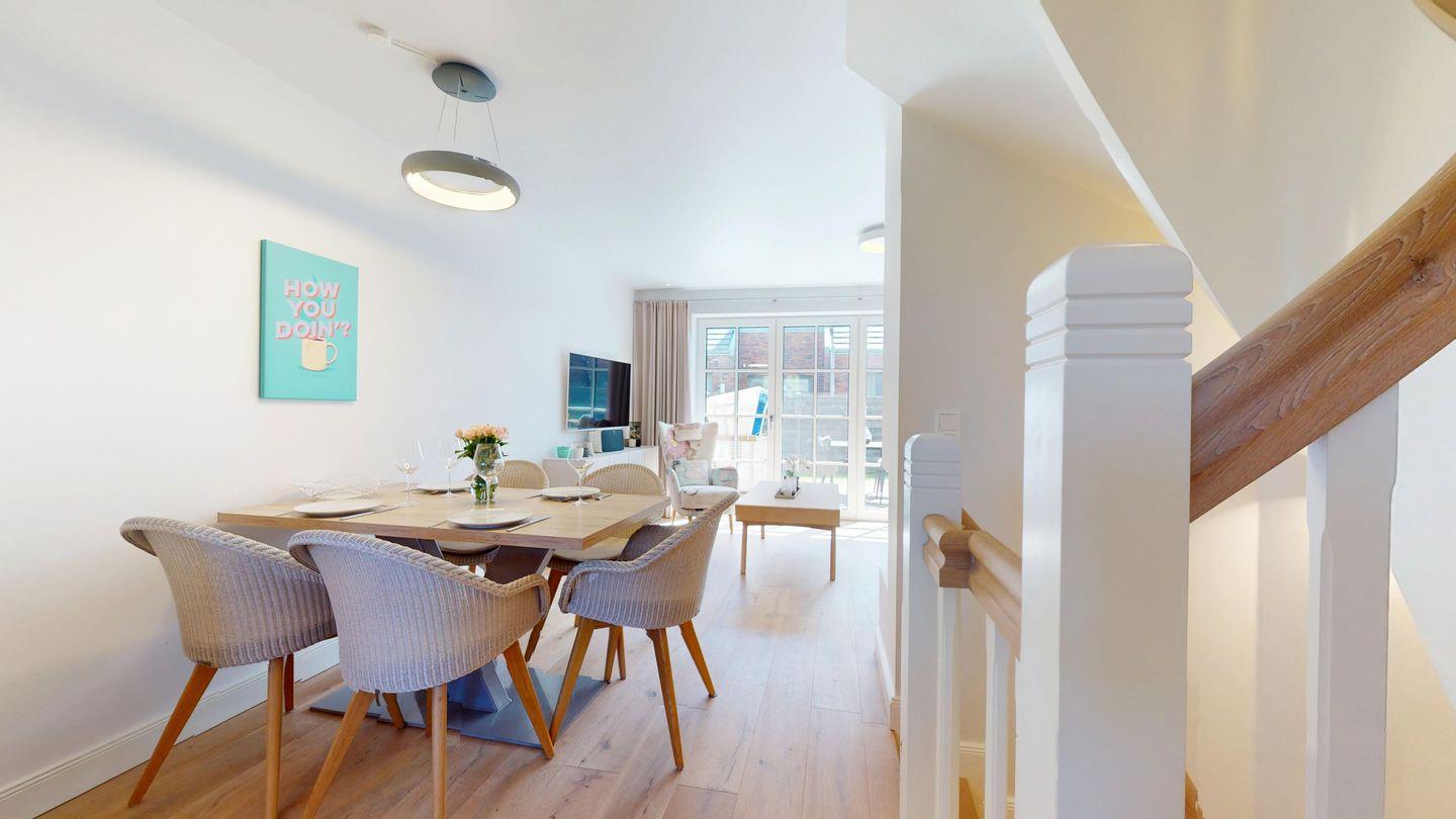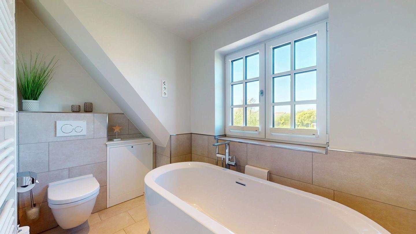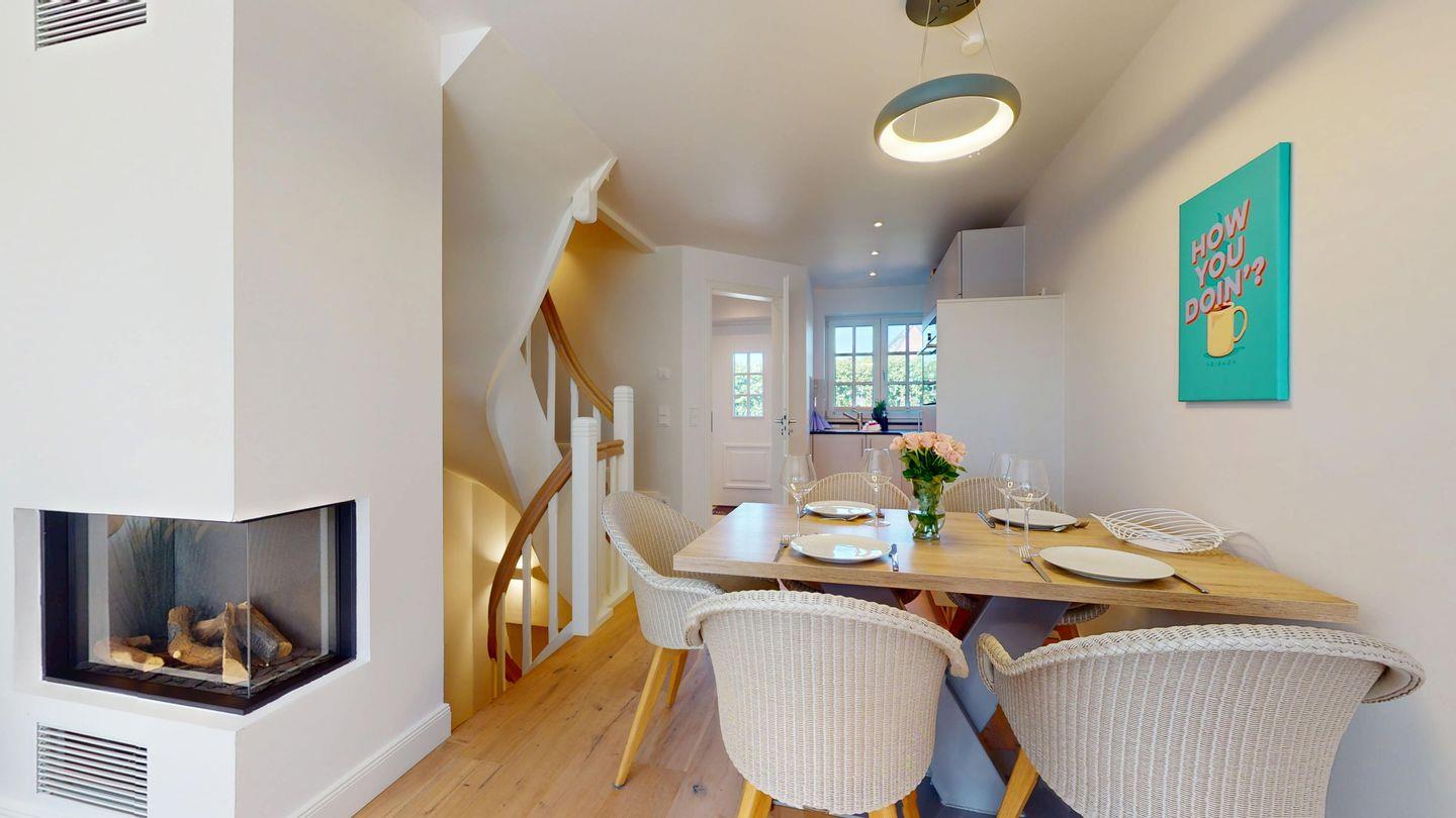 Im Erdgeschoss empfängt Sie ein heller Wohn- und Essbereich mit bodentiefen Fenstern, gemütlicher Sofaecke und Gaskamin – ideal für entspannte Stunden. Die offene Küche ist modern ausgestattet mit Induktionsherd, Geschirrspüler, Nespresso-Maschine und einer Backofen-/Mikrowellenkombination. Von hier gelangen Sie direkt auf die sonnige Terrasse mit Gartenmöbeln und eigenem Strandkorb (April bis Oktober) – perfekt für Frühstück an der frischen Luft oder erholsame Nachmittage. Ein Gäste-WC rundet diese Ebene ab.
