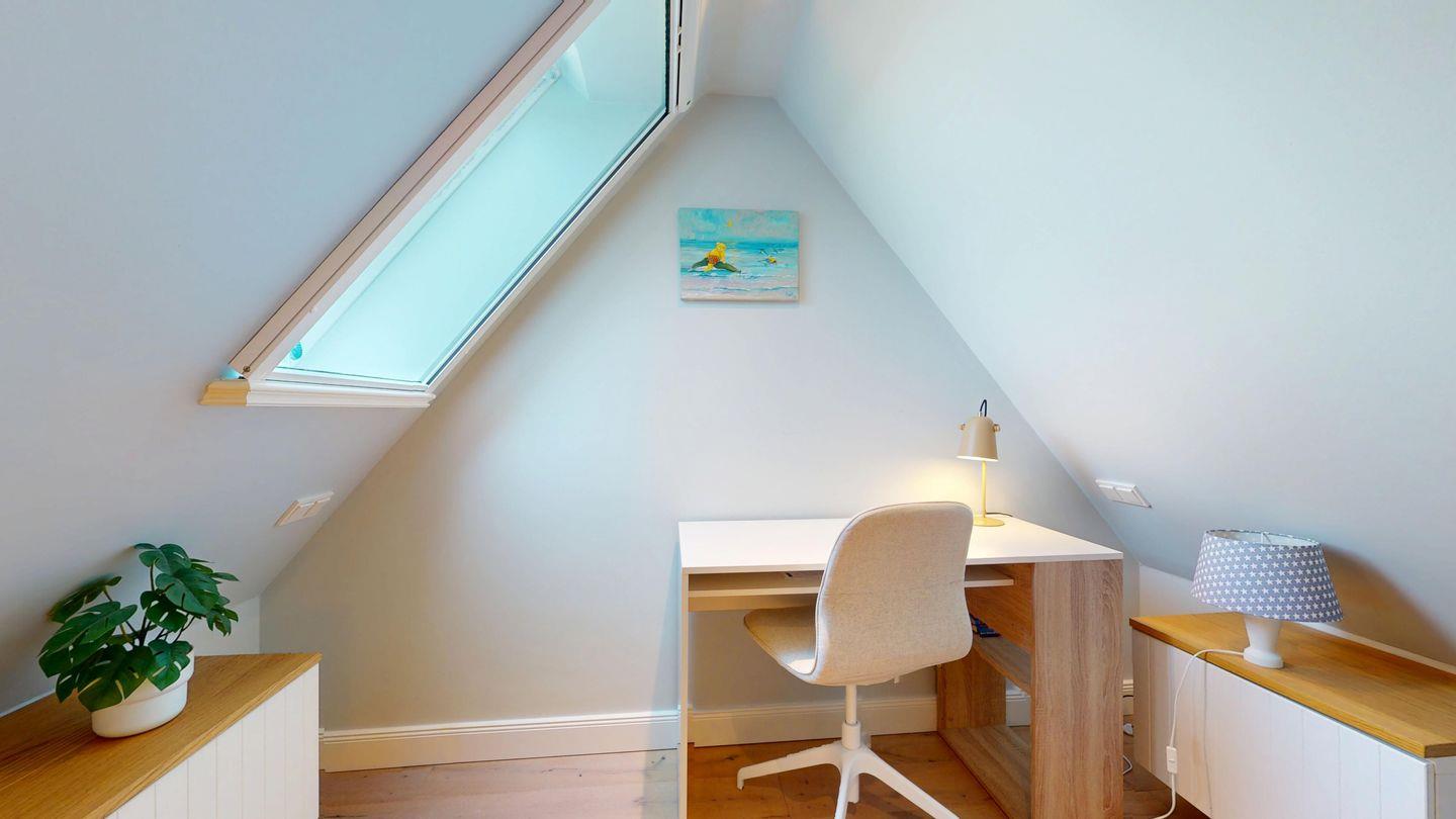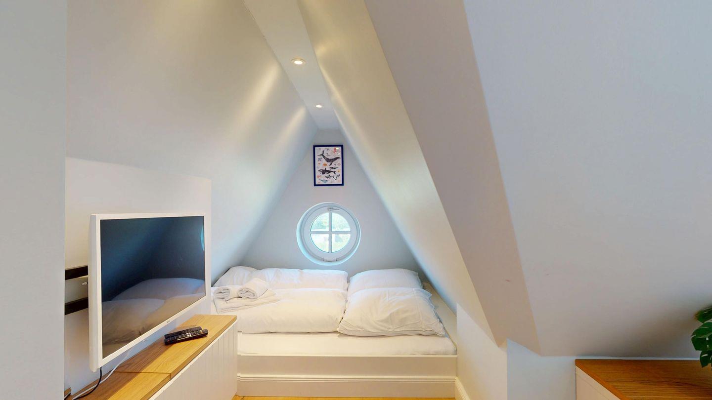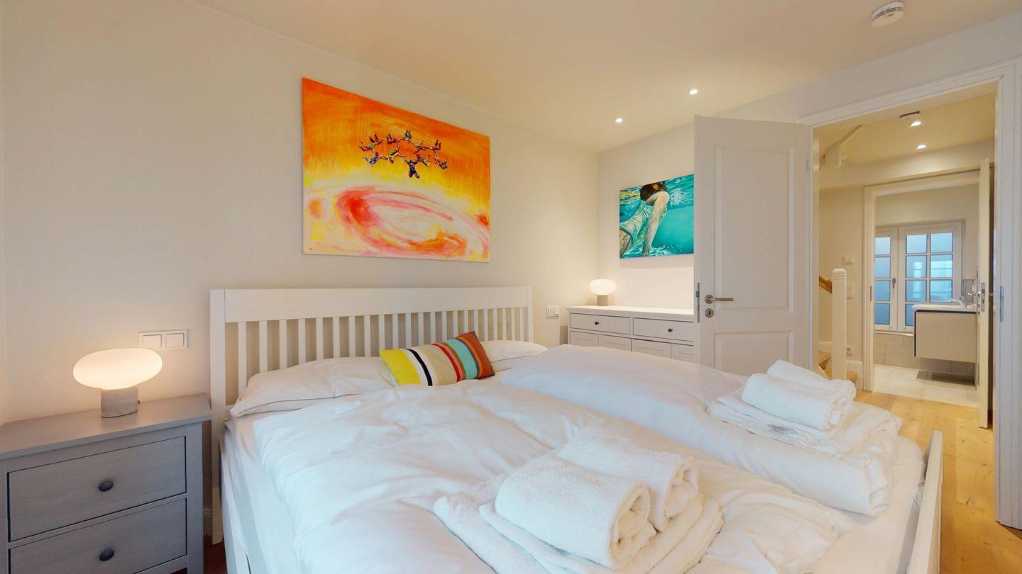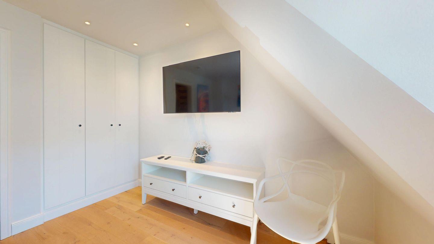 Im Untergeschoss erwartet Sie ein Schlafzimmer mit Doppelbett und Flatscreen-TV sowie Ihre private Sauna und ein modernes Duschbad. Im Obergeschoss befindet sich ein weiteres Doppelzimmer mit Flatscreen-TV und ein stilvolles Badezimmer mit freistehender Badewanne, Dusche und WC. Das Dachgeschoss bietet eine liebevoll gestaltete Nische mit kleinem Doppelbett, Flatscreen-TV und Schreibtisch – ein gemütlicher Rückzugsort für Kinder oder Gäste.