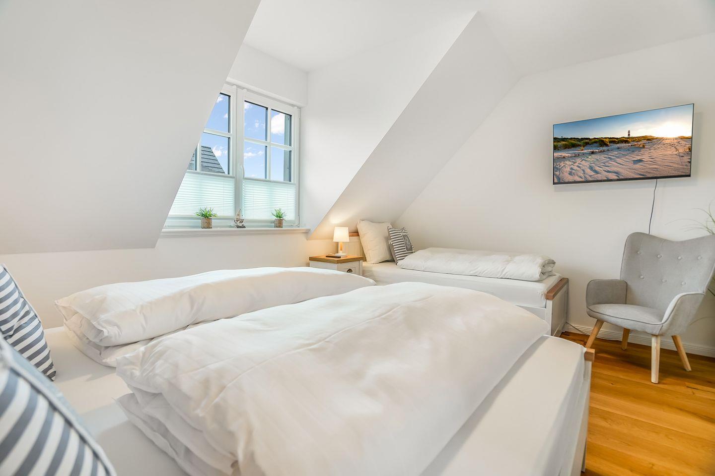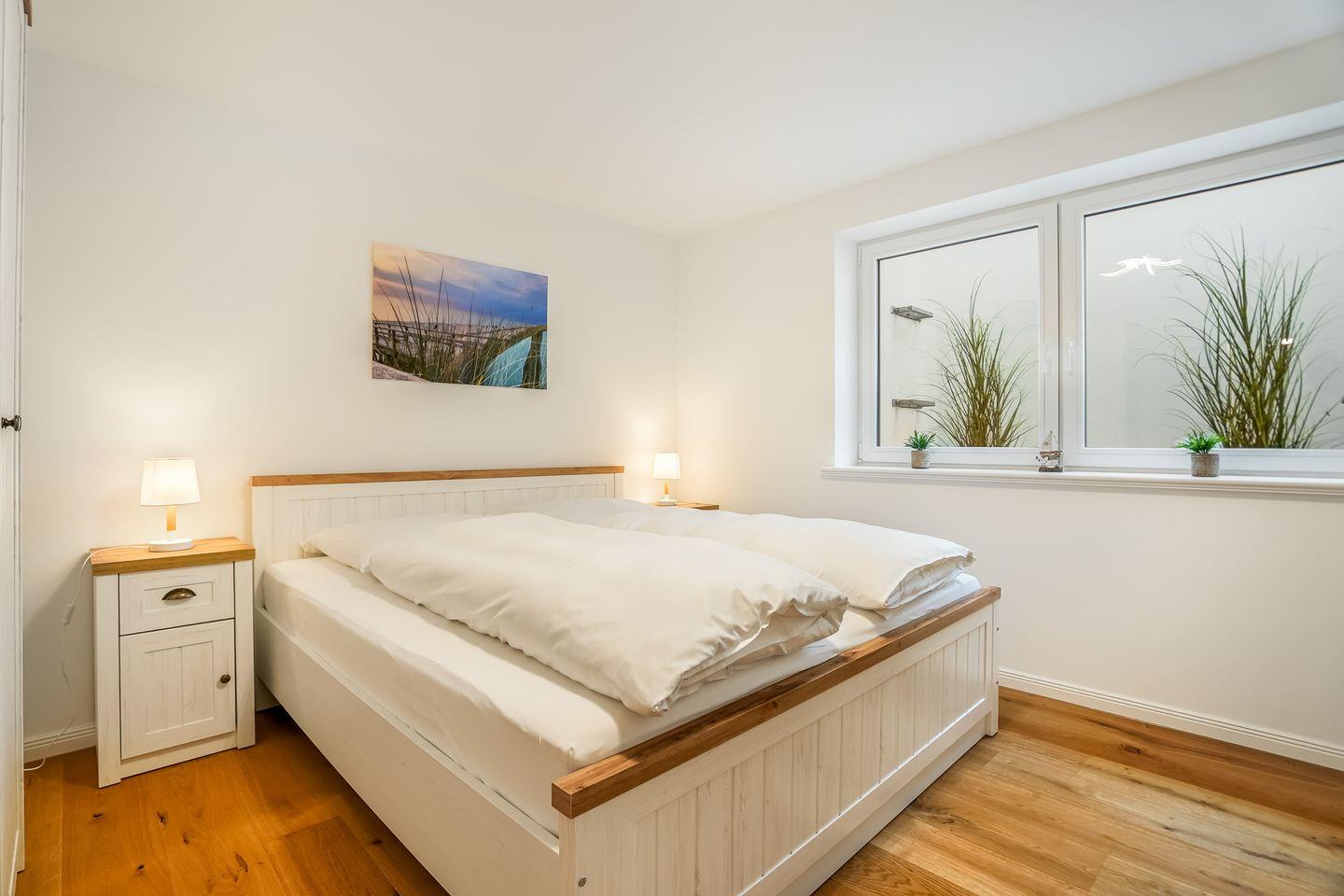 Im Obergeschoss befindet sich ein großzügiges Schlafzimmer mit Doppelbett und zusätzlichem Einzelbett – ideal für Paare, Familien oder Freunde. Das helle Badezimmer mit Dusch-/Badewanne bietet viel Platz und Tageslicht. Im Souterrain finden Sie ein weiteres gemütliches Schlafzimmer mit Doppelbett sowie ein modernes Duschbad. Ein besonderes Highlight: Ihre private Sauna – der perfekte Ort, um nach einem langen Strandspaziergang zur Ruhe zu kommen.