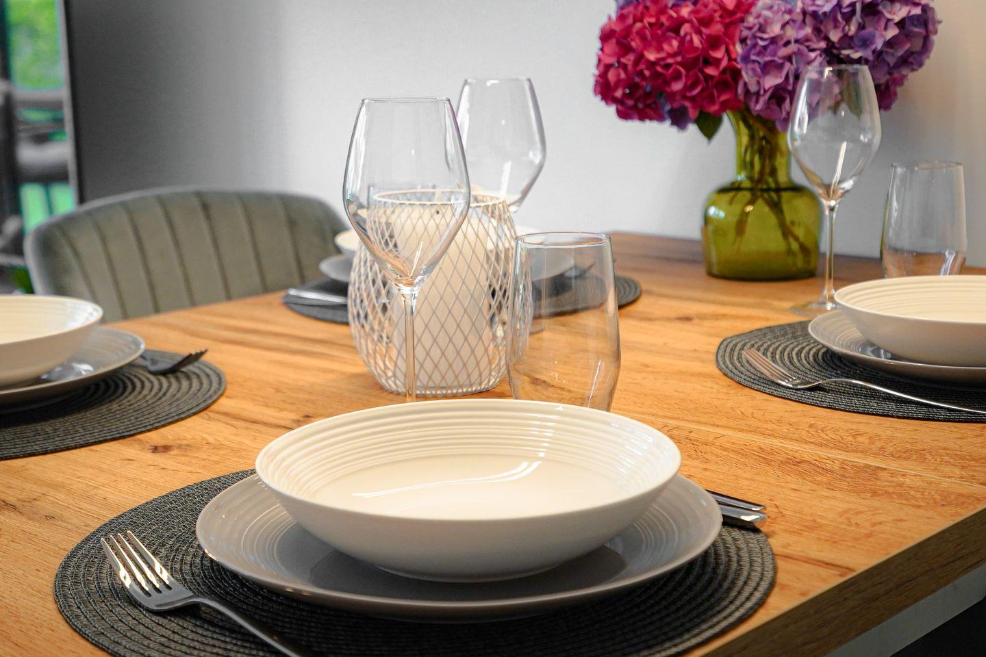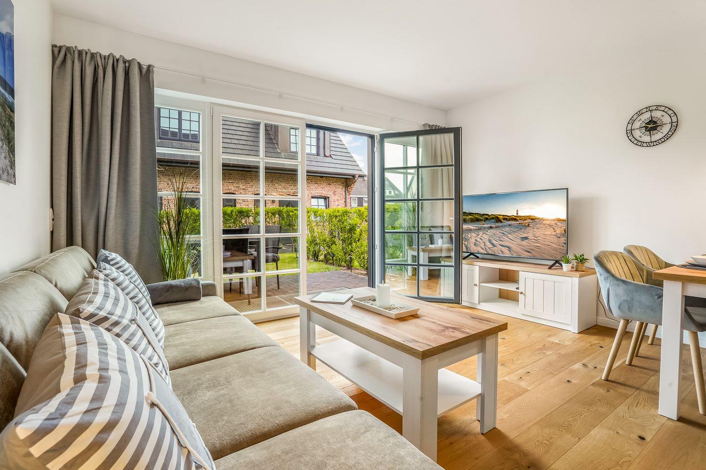 Im Erdgeschoss erwartet Sie ein offen gestalteter Wohn- und Essbereich, der durch seine helle und freundliche Atmosphäre besticht. Die voll ausgestattete Einbauküche lässt keine Wünsche offen und geht nahtlos in den Essbereich über – ideal für gemeinsame Mahlzeiten oder lange Spieleabende. Der angrenzende Wohnbereich mit großem XXL-Sofa und liebevoll maritimer Einrichtung lädt zum Verweilen und Entspannen ein. Durch die bodentiefen Fenster gelangen Sie direkt auf die sonnige Terrasse mit kleinem Garten – perfekt für ein Frühstück unter freiem Himmel oder einen entspannten Tagesausklang. Ab April 2026 erwartet Sie auf der Terrasse ein Strandkorb zum Wohlfühlen.
