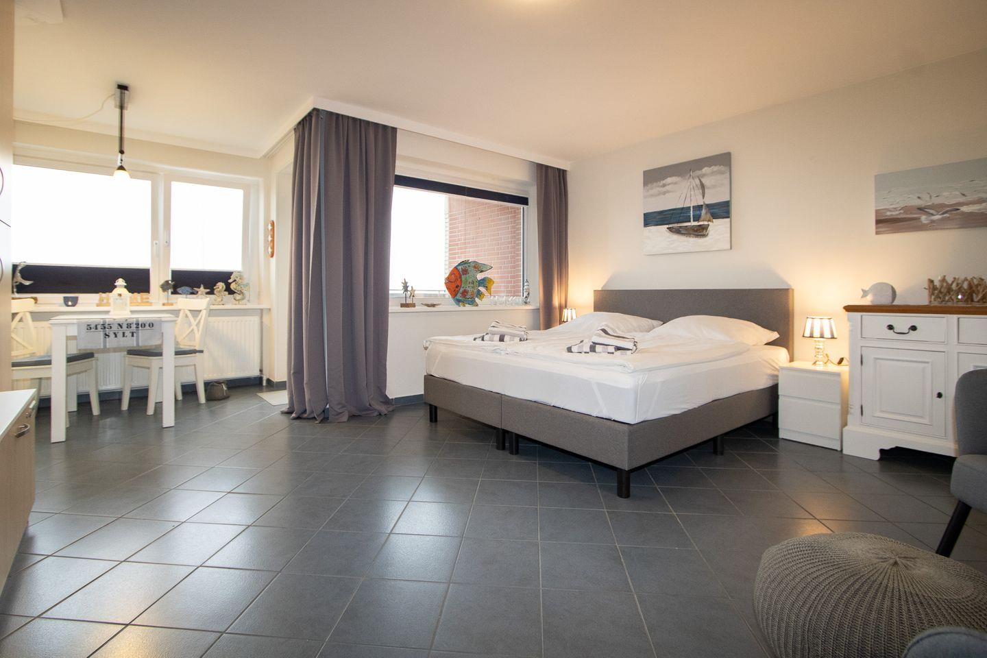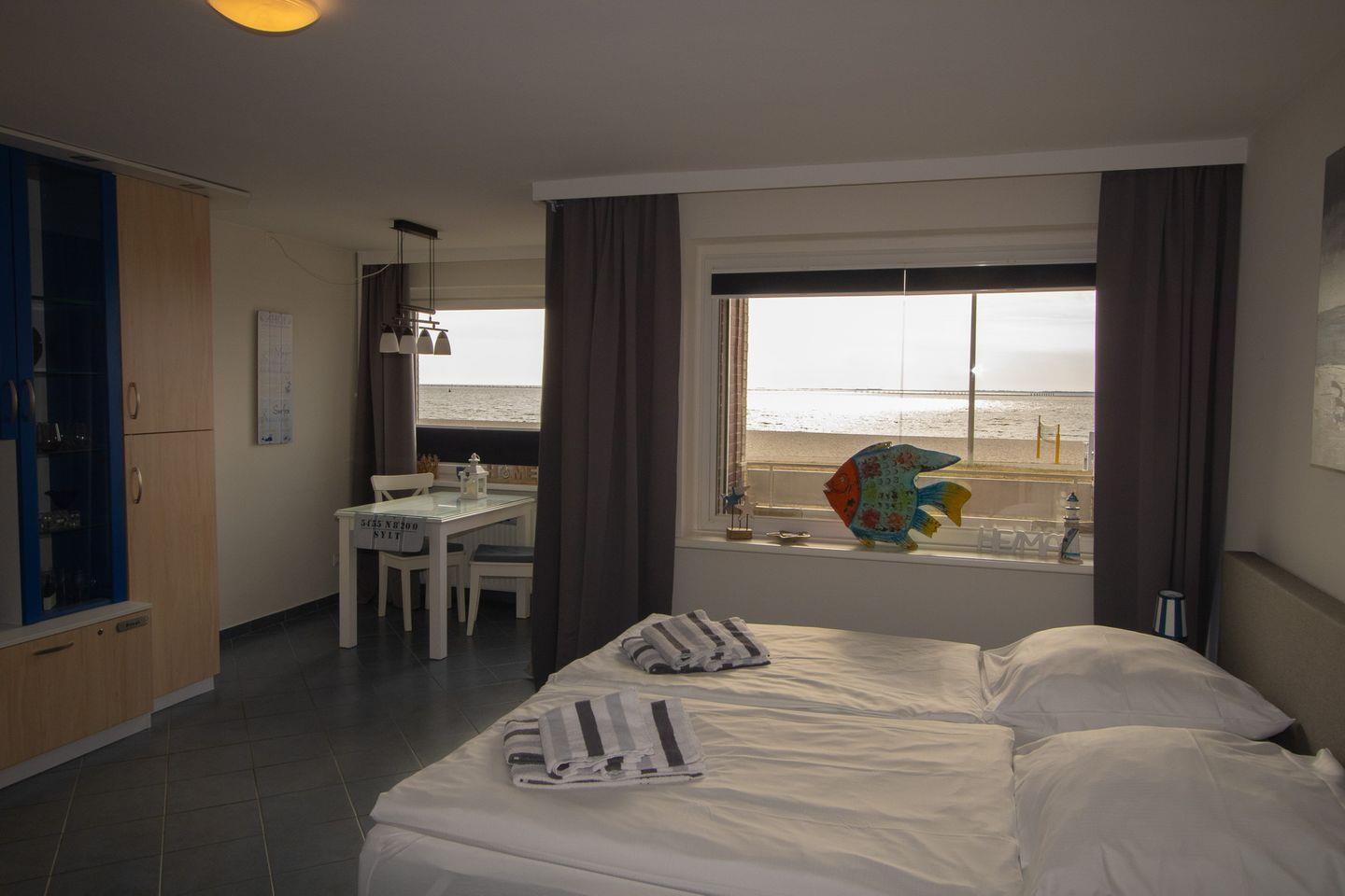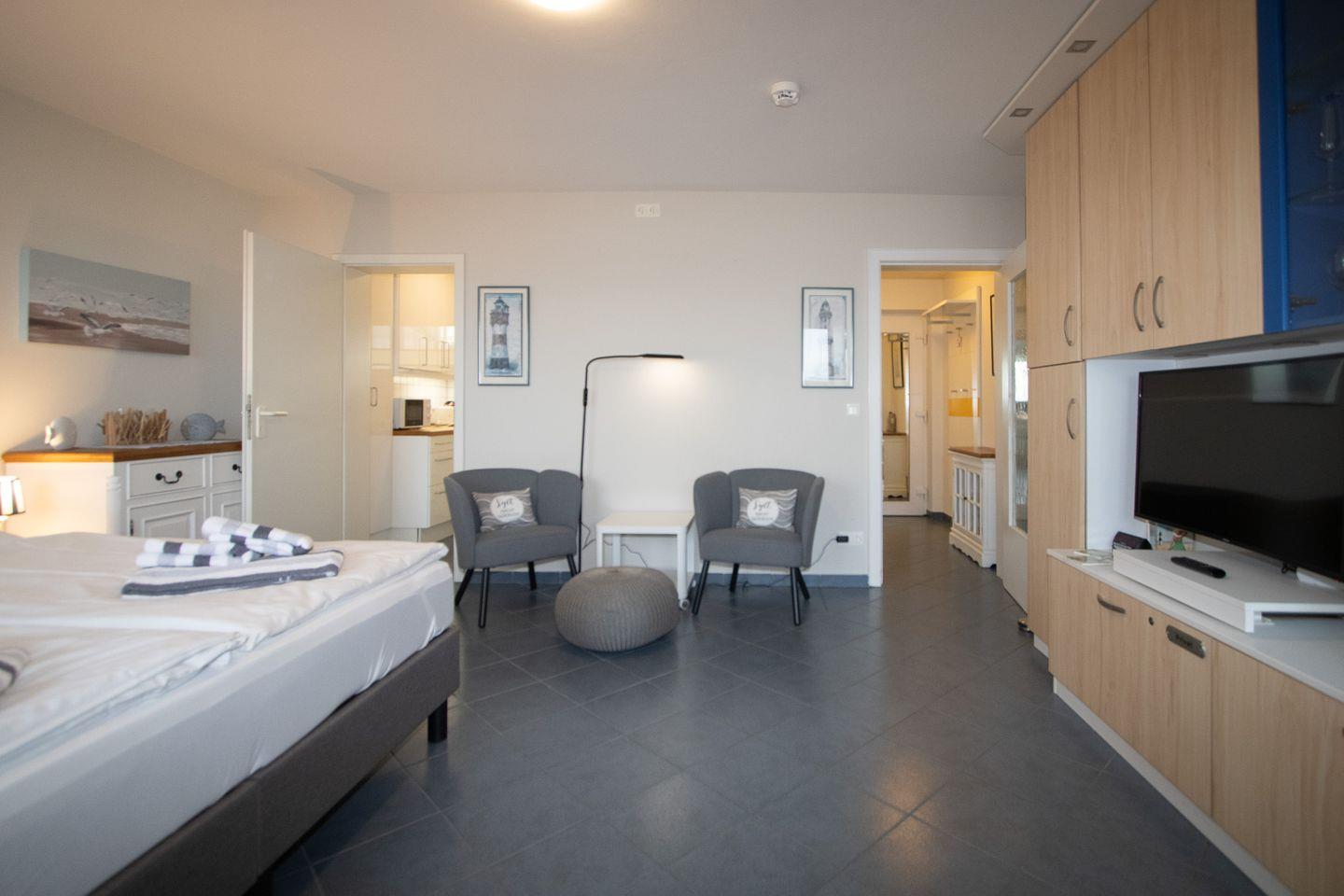 Der Wohnbereich lädt zum Entspannen ein und bietet Möglichkeiten zur individuellen Freizeitgestaltung. Für Ihre Unabhängigkeit sorgt die vorhandene Küche, in der Sie nach Belieben Mahlzeiten selbst zubereiten können. Ein Balkon bietet Ihnen Freiraum an der frischen Nordseeluft – ideal, um den Tag in privater Atmosphäre ausklingen zu lassen oder die inseltypische Ruhe zu genießen.