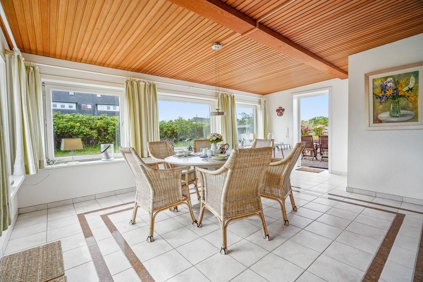 Über 100 Jahre alt und eines der ältesten Reetdachhäuser in Hörnum: ca. 140 m² Wohnfläche, für bis zu 10 Personen, Wohnzimmer mit Kamin, Esszimmer, Küche, Wintergarten, Terrasse mit Strandkörben, 4 Schlafzimmer, 2 Bäder, separates WC. Einfach und traditionell eingerichtet, aber gepflegt und gemütlich. Sehr zentral und dennoch ruhig auf den Dünen gelegen, mit 2 Parkplätzen, Waschmaschine, Trockner und toller Aussicht.