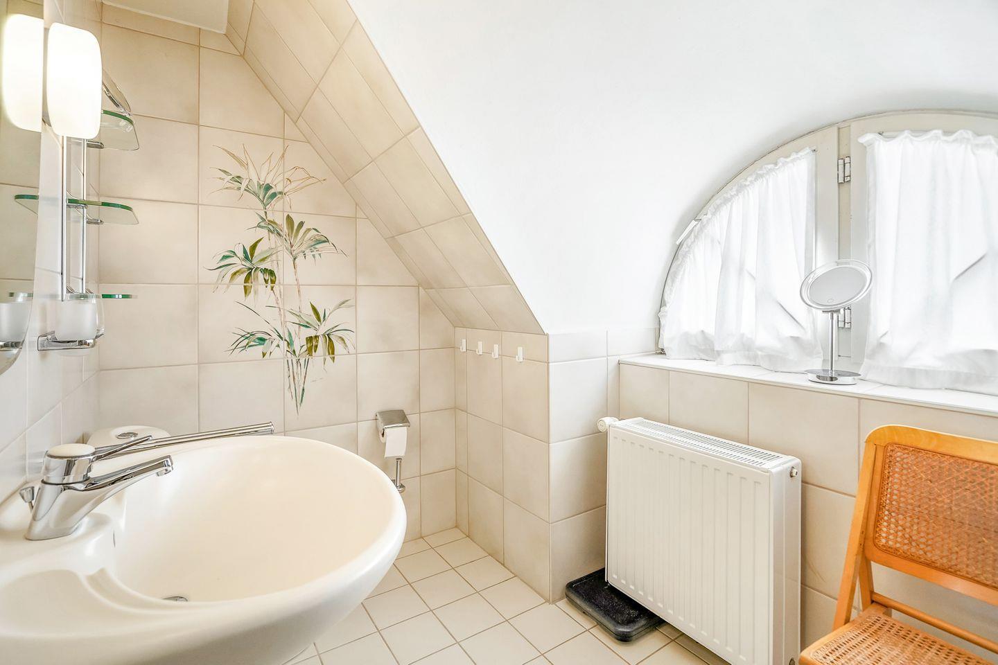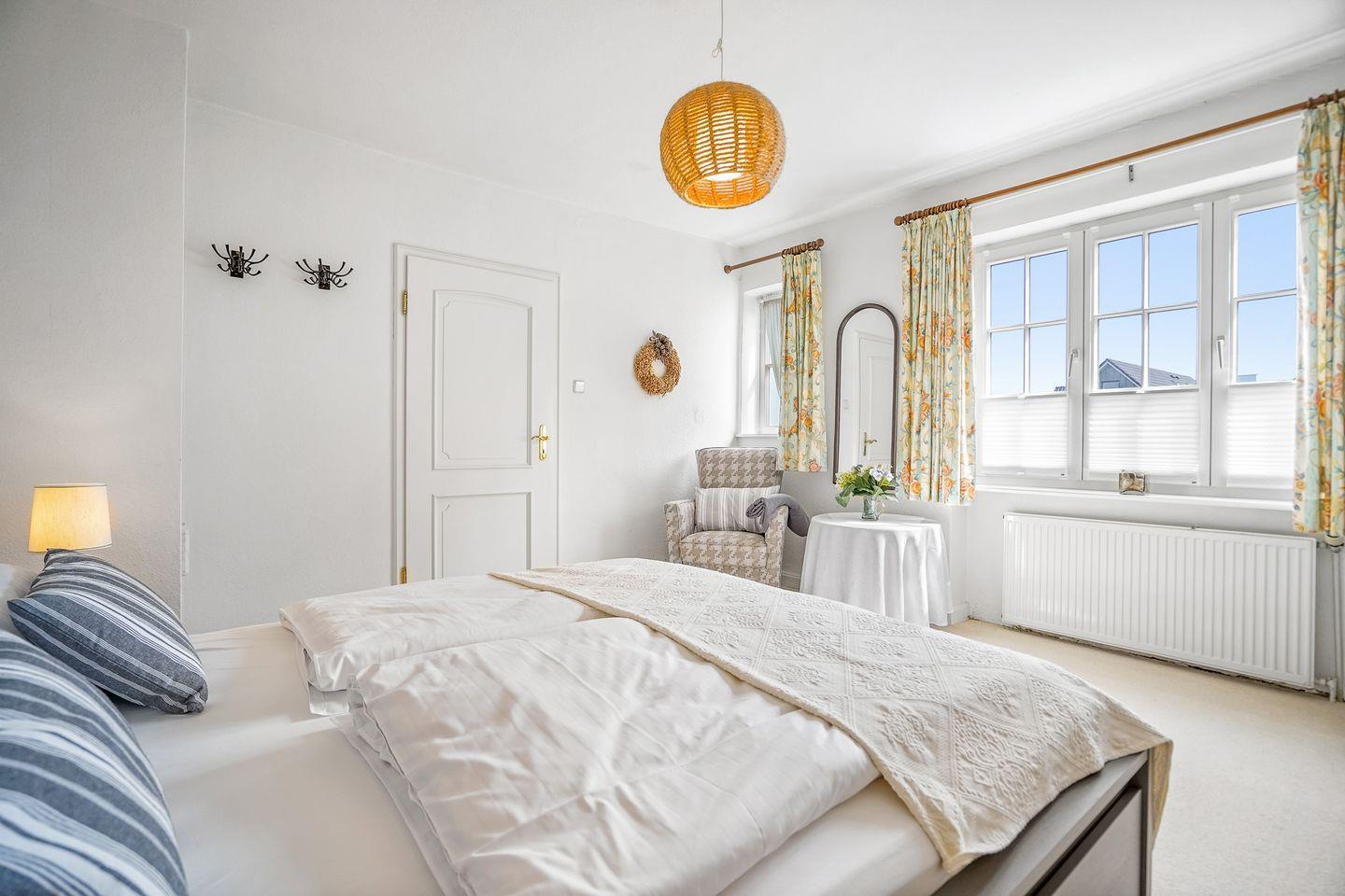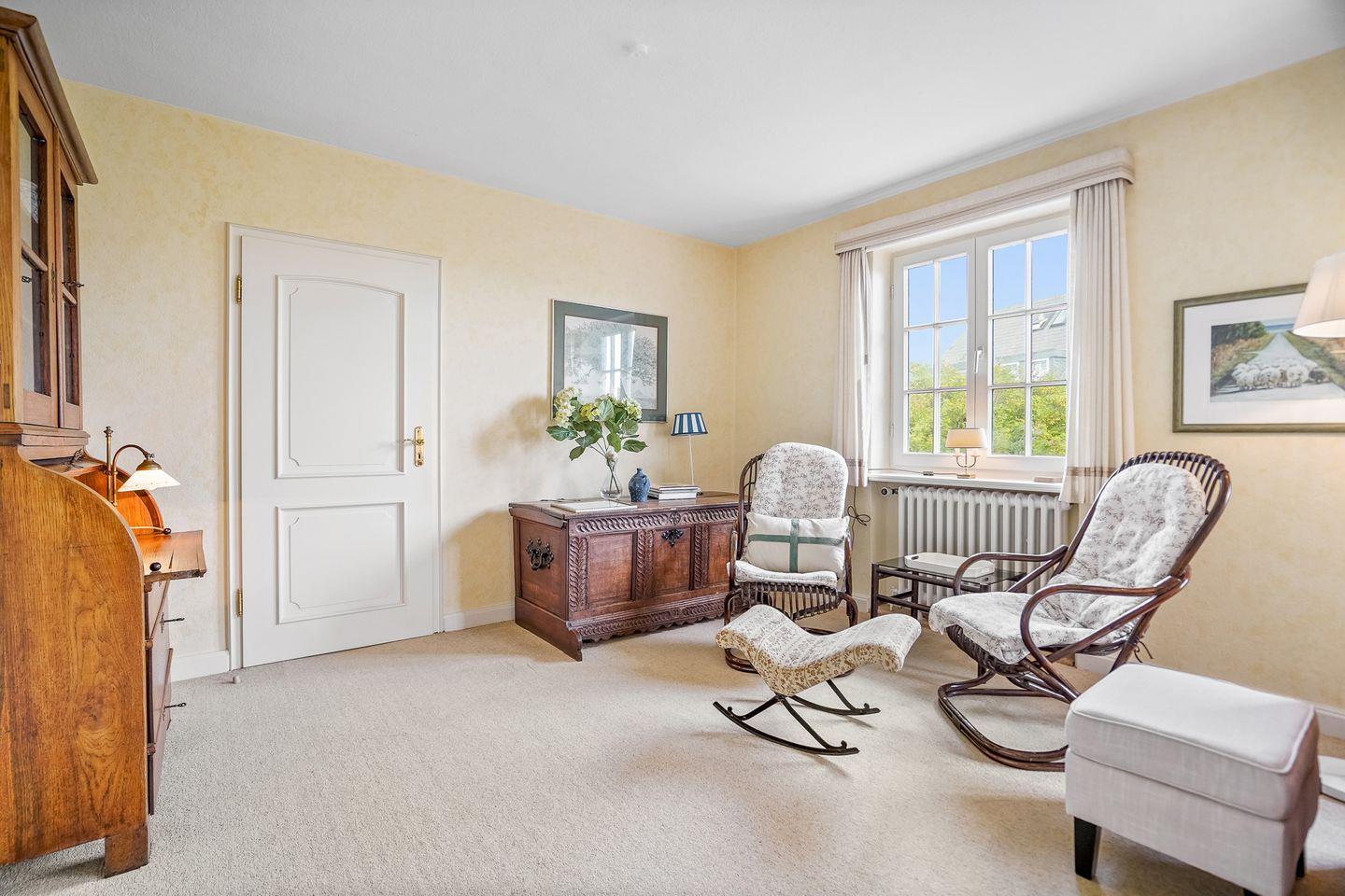 Im Erdgeschoss erwarten Sie ein Wohnzimmer mit Kamin, ein separates Esszimmer, eine gut ausgestattete Küche, zwei Schlafzimmer, ein Badezimmer mit Dusche sowie ein separates WC. Besonders schön ist der helle Wintergarten, von dem Sie direkt auf die Terrasse gelangen – ausgestattet mit zwei Strandkörben, perfekt zum Entspannen.