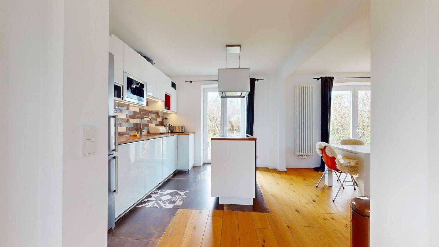 Der offene Küchen- und Wohnbereich besticht durch eine Kochinsel, an der das Kochen zum Erlebnis wird, sowie einen großen Esstisch für gemeinsame Mahlzeiten. Im gemütlichen Wohnzimmer mit Sofaecke und Holzkamin können Sie die Abende entspannt ausklingen lassen.