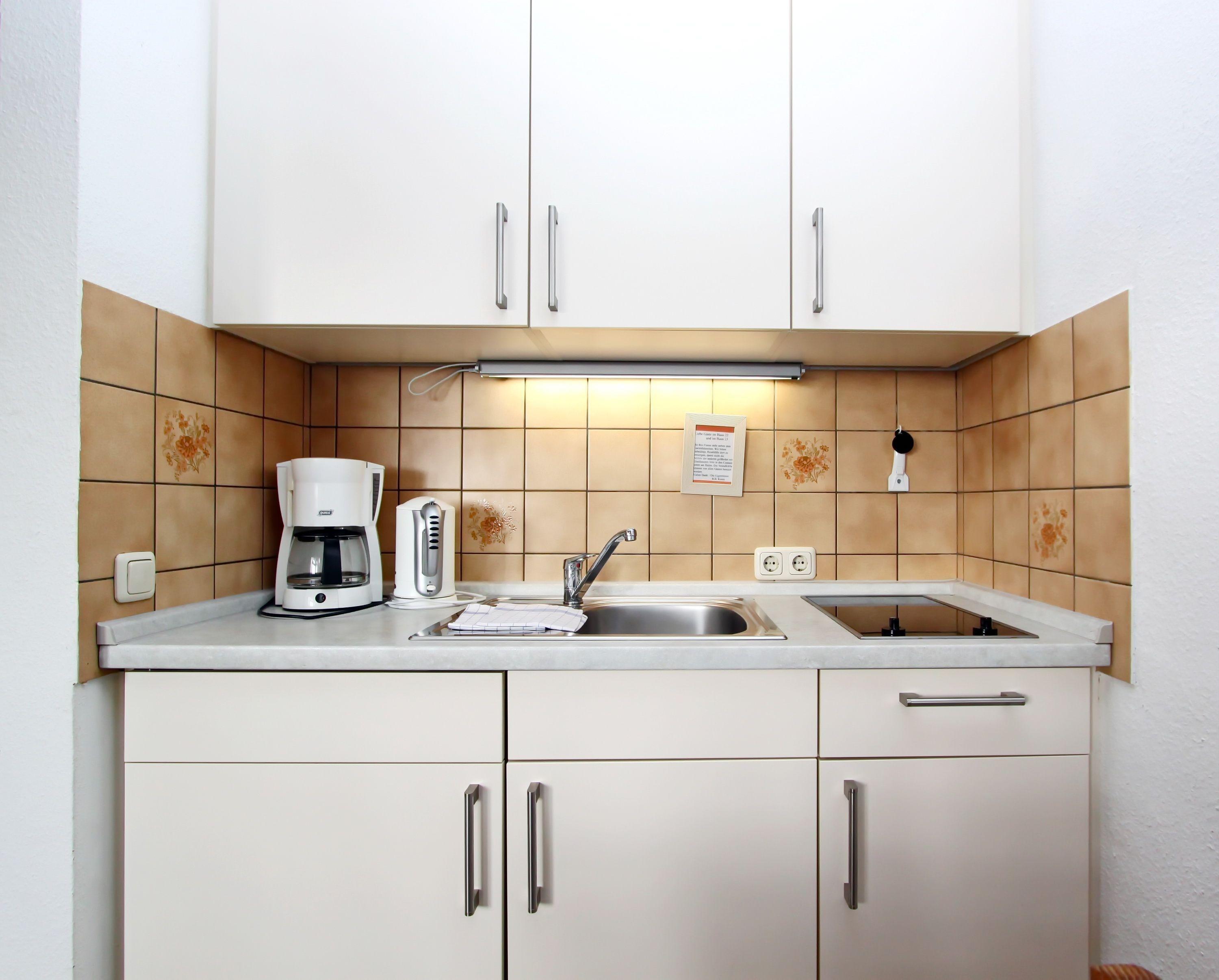 Diese kleine Ferienwohnung für zwei Personen im Haus Meerblick hat zwei getrennte Zimmer, davon ein Schlafzimmer mit Boxspringbett, und ein Wohnzimmer mit Küchenzeile.