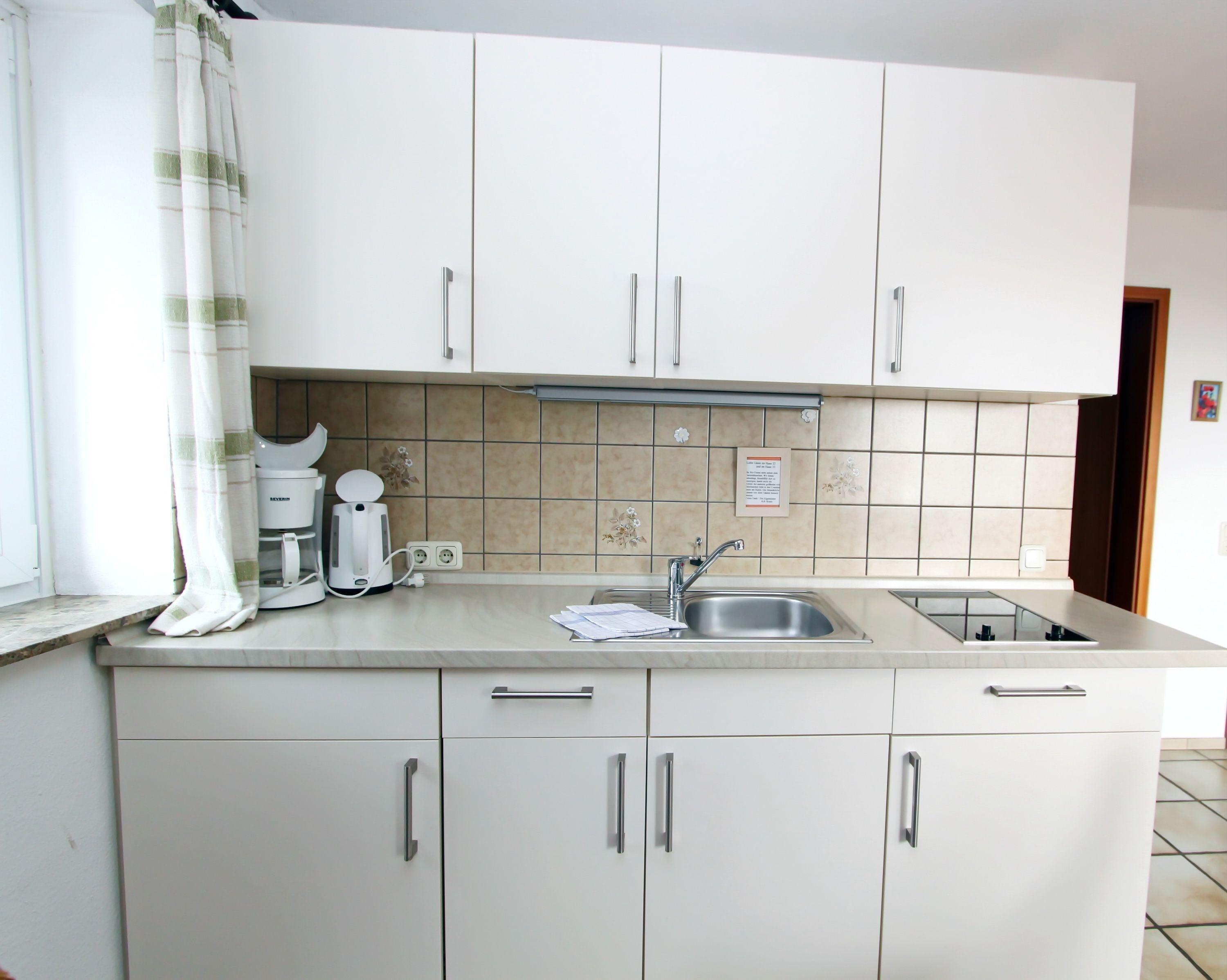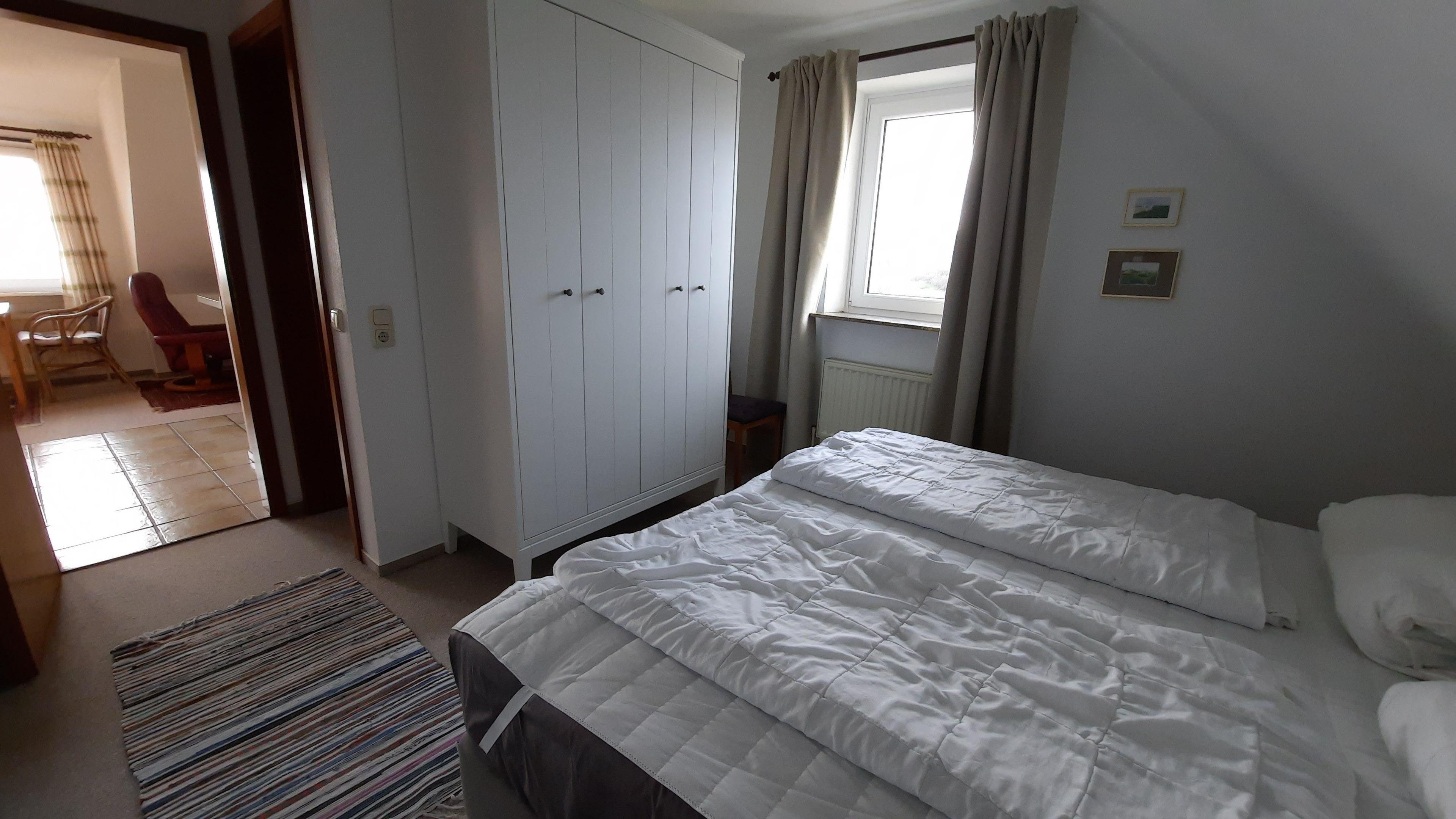 Diese kleine Ferienwohnung für zwei Personen im Haus Meerblick hat zwei getrennte Zimmer, davon ein Schlafzimmer mit Boxspringbett, und ein Wohnzimmer mit Küchenzeile.