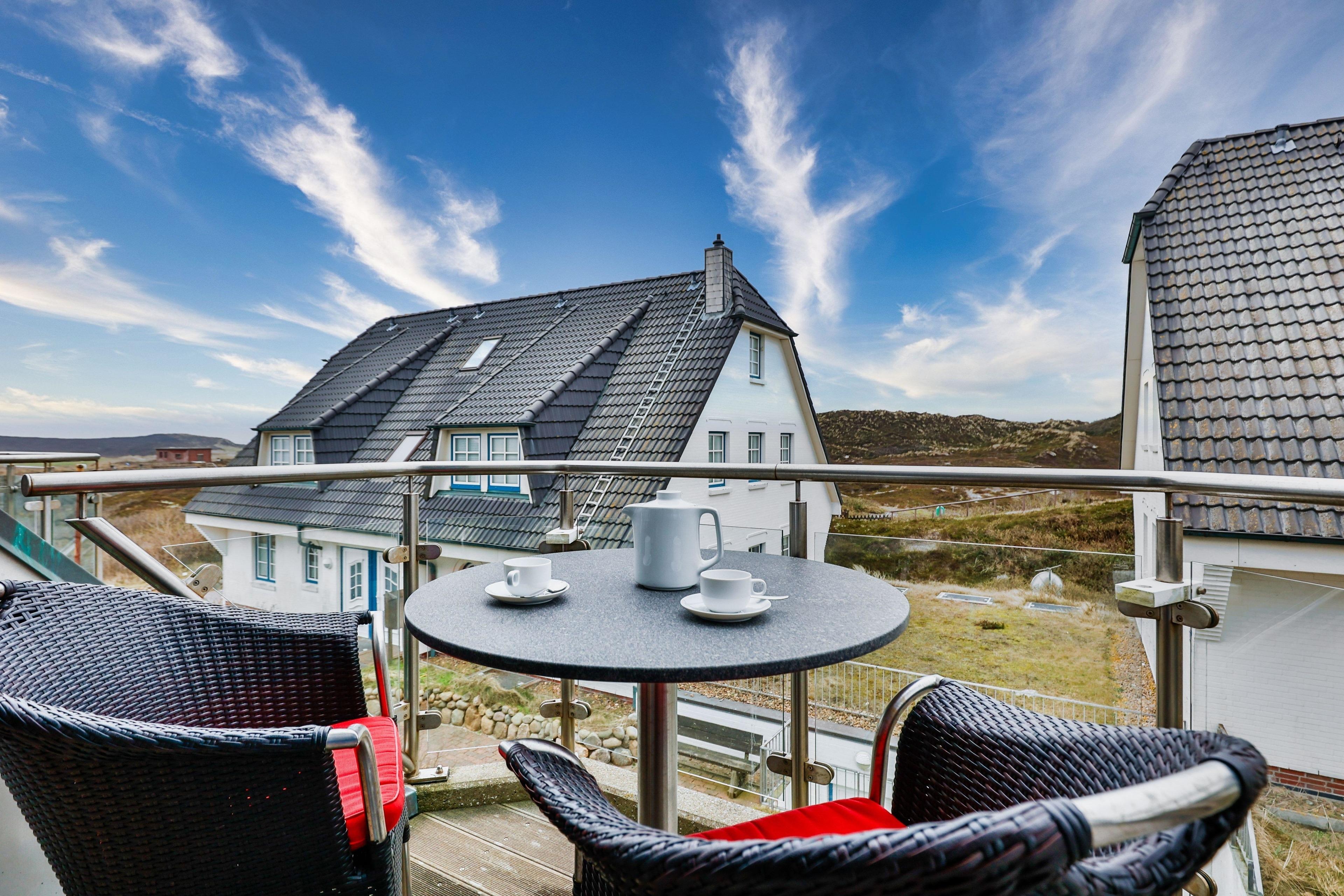 Traumhafte Lage der Ferienwohnung in kleiner Anlage, 2002 erbaut, am Ende einer ruhigen Anliegerstraße in Mitten der Dünen. Der Weststrand ist über einen Brettersteg durch die Dünen nach 200 Metern zu erreichen. Es gibt einen schönen Balkon mit hochwertigen Gartenmöbeln, welcher zum verweilen und entspannen einlädt. Der Blick vom Balkon Richtung Westen zeigt die Dünen und teilweise das Meer, der Blick Richtung Osten lässt auf den Golfplatz Budersand blicken, sowie die Dünen der Ostseite.