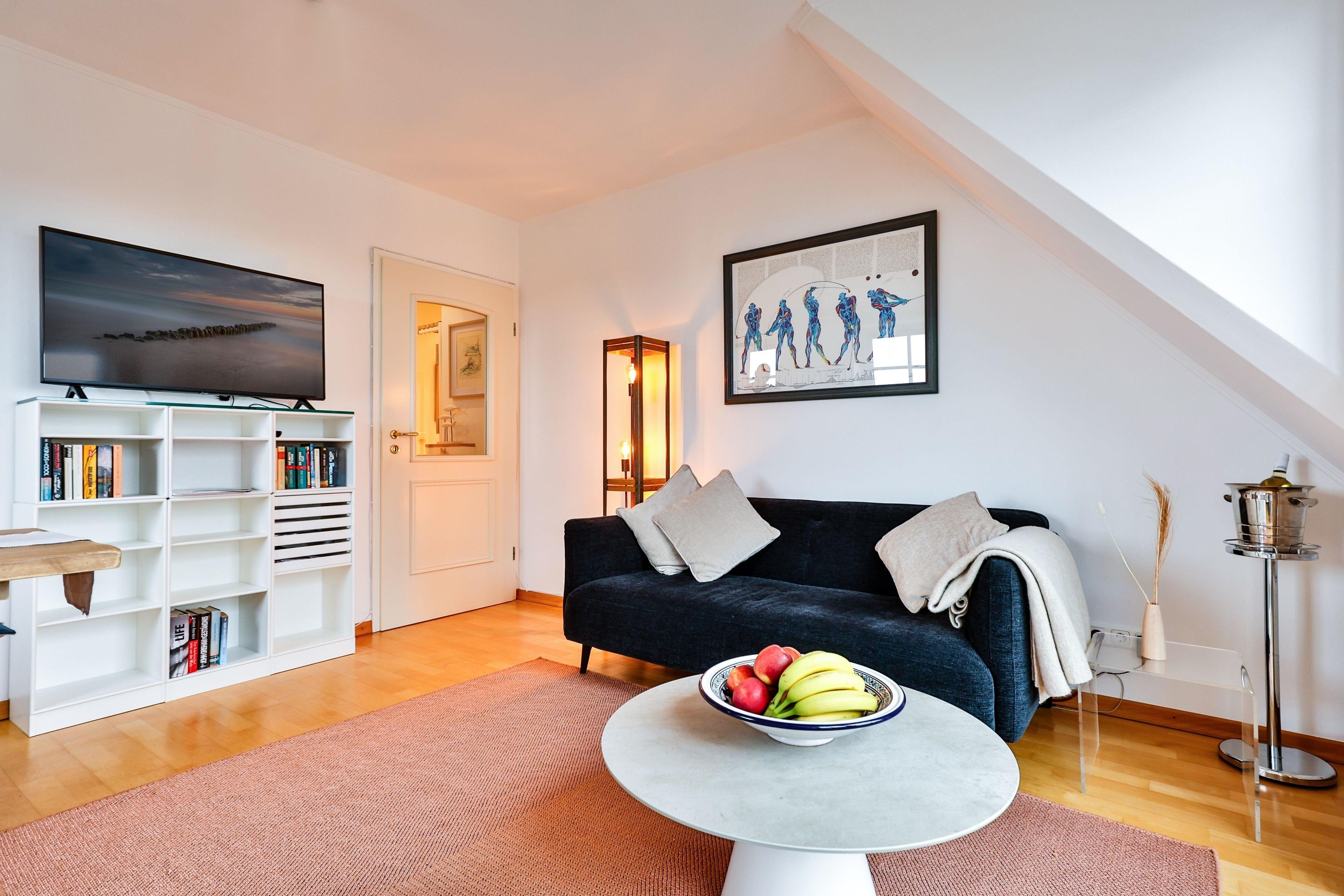 Küche: Komplett eingerichtet mit Kühlschrank, Geschirrspüler, Backofen/Mikrowellenfunktion, Toaster, Wasserkocher, Espresso-Siebträgermaschine (Filterkaffee kann auch gebrüht werden). TV mit Satellitenkanälen im Wohnzimmer. Kostenfreies WLAN.