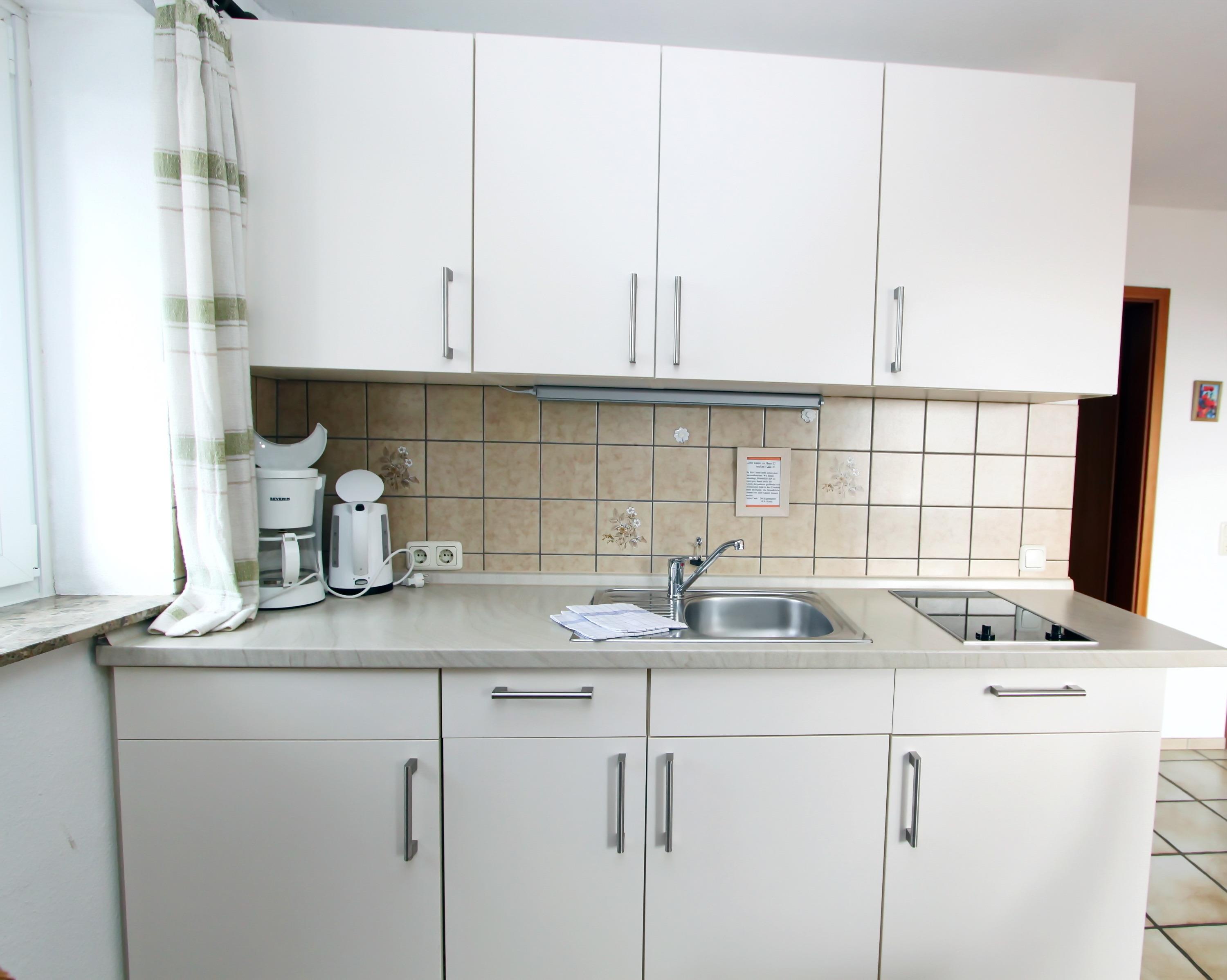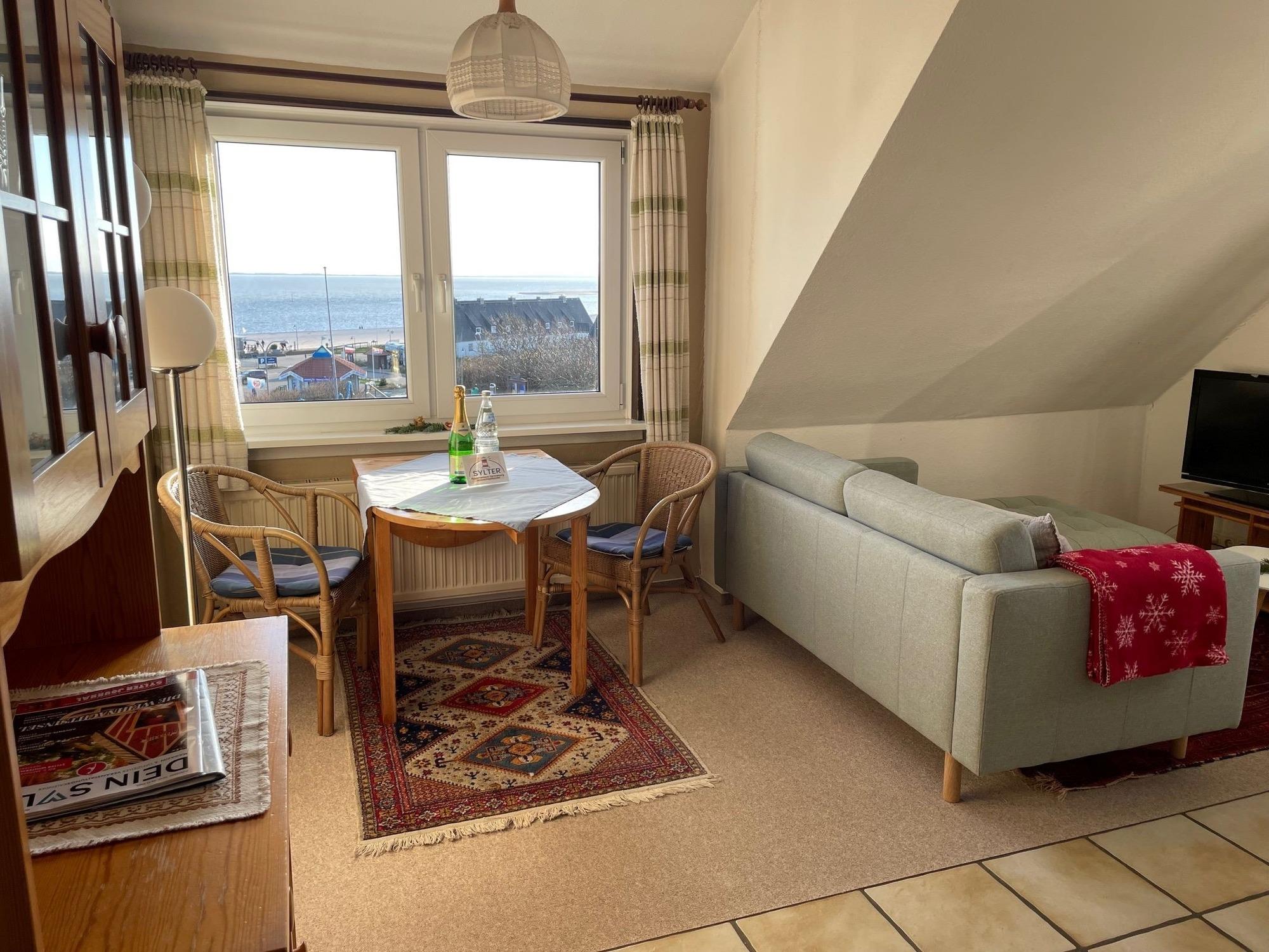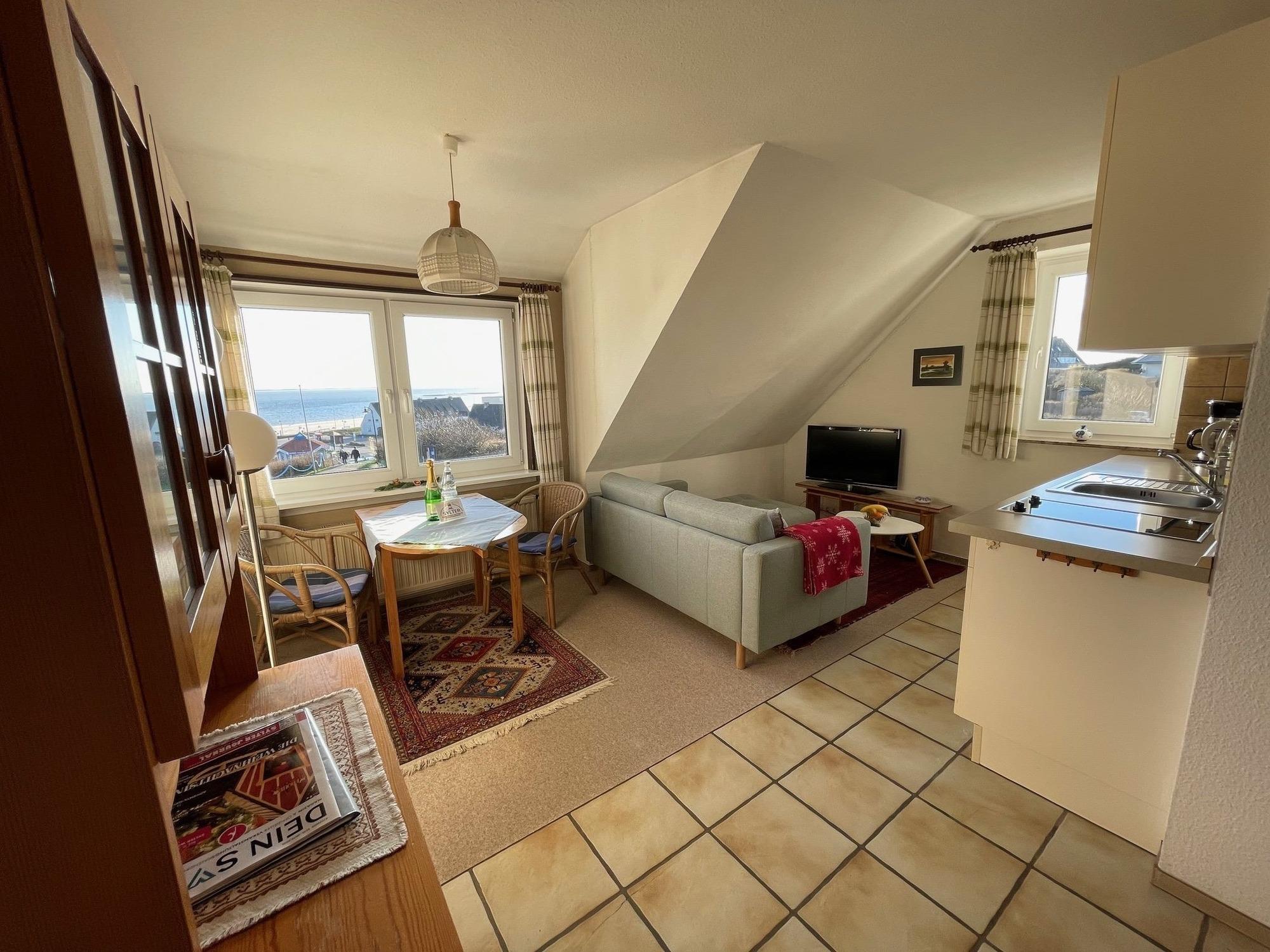 Diese kleine Ferienwohnung für zwei Personen im Haus Meerblick hat zwei getrennte Zimmer, davon ein neues Schlafzimmer mit Boxspringbett, und ein Wohnzimmer mit Küchenzeile.