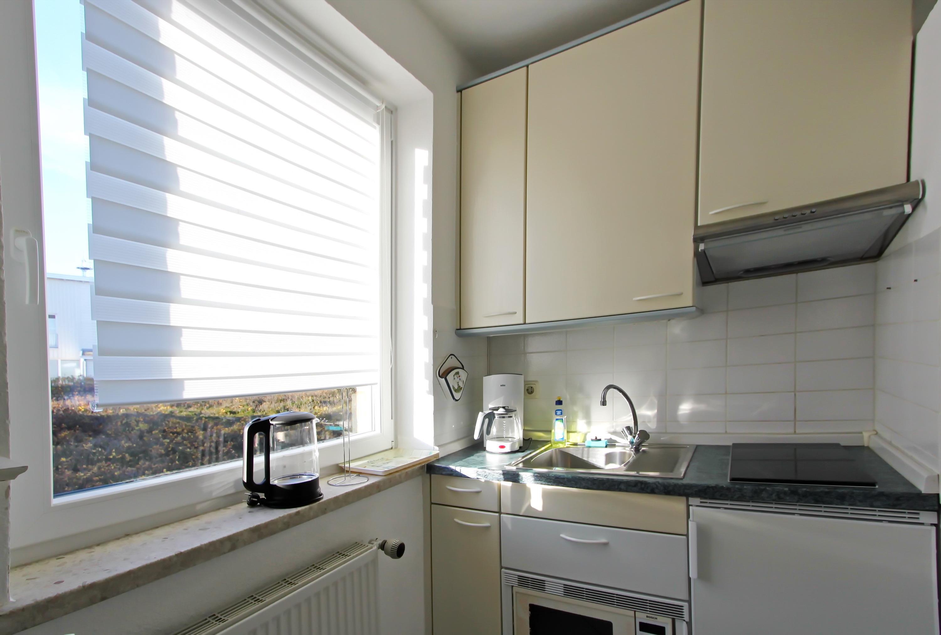 modernes 1 Zimmer Appartement mit ca. 32m² unweit des Hörnumer Golfplatzes; ein Wohn-/Schlafraum mit Doppelschrankbett, Zweisitzer-Couch, 2 Sessel, Tisch, Kommode, Schrank, Sat-TV, Radio mit CD-Player, Zugang zum Westbalkon mit Bestuhlung; kleine separate Pantryküche mit neuem Cerankochfeld (2 Platten), neuer Dunstabzugshaube, Mikrowelle und neuem Kühlschrank mit Gefrierfach; Esstisch für 2 Personen; Flur mit Garderobe und Abstellkammer; neues Duschbad/WC.