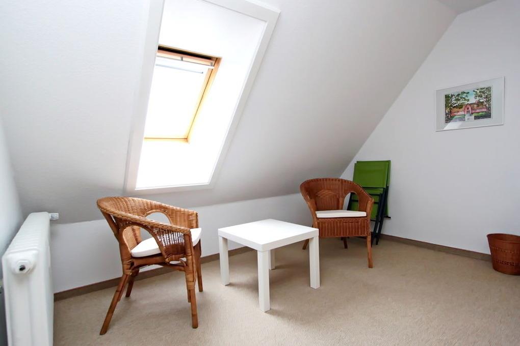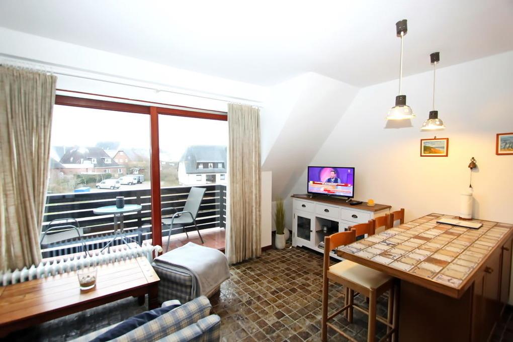 ganz ruhig gelegenes, gepflegtes 3 Zimmer Appartement, für bis zu 4 Personen, über OG/DG, mit ca. 60m². Im OG befindet sich ein Wohnraum mit einer neuen, offenen Einbauküche mit Ceranherd, Geschirrspüler, Kühlschrank mit kleinem Gefrierfach; Esstisch für 4 Personen, Schrank, Sat-Flat-TV, gemütliche Sitzecke mit zwei 2 Sitzer-Couches und Beistellhocker, Tisch, Zugang zum sonnigen Südbalkon mit Balkonmöbel, von dort aus hat man einen fantastischen Blick auf den Leuchtturm und die Fußgängerzone; Duschbad/WC; Flur mit Garderobe; Schlafraum mit Doppelbett (zwei einzelne Matratzen), Nachttische, ein großer Kleiderschrank bietet ausreichend Fläche; über eine Holzwendeltreppe geht es ins DG: dort befindet sich ein weiterer Schlafraum mit Doppelbett, Nachttische, Waschbecken und ein Kleiderschrank.