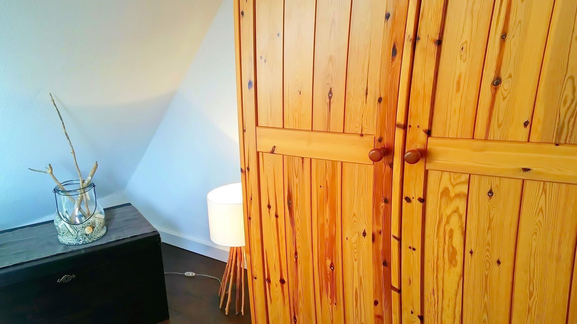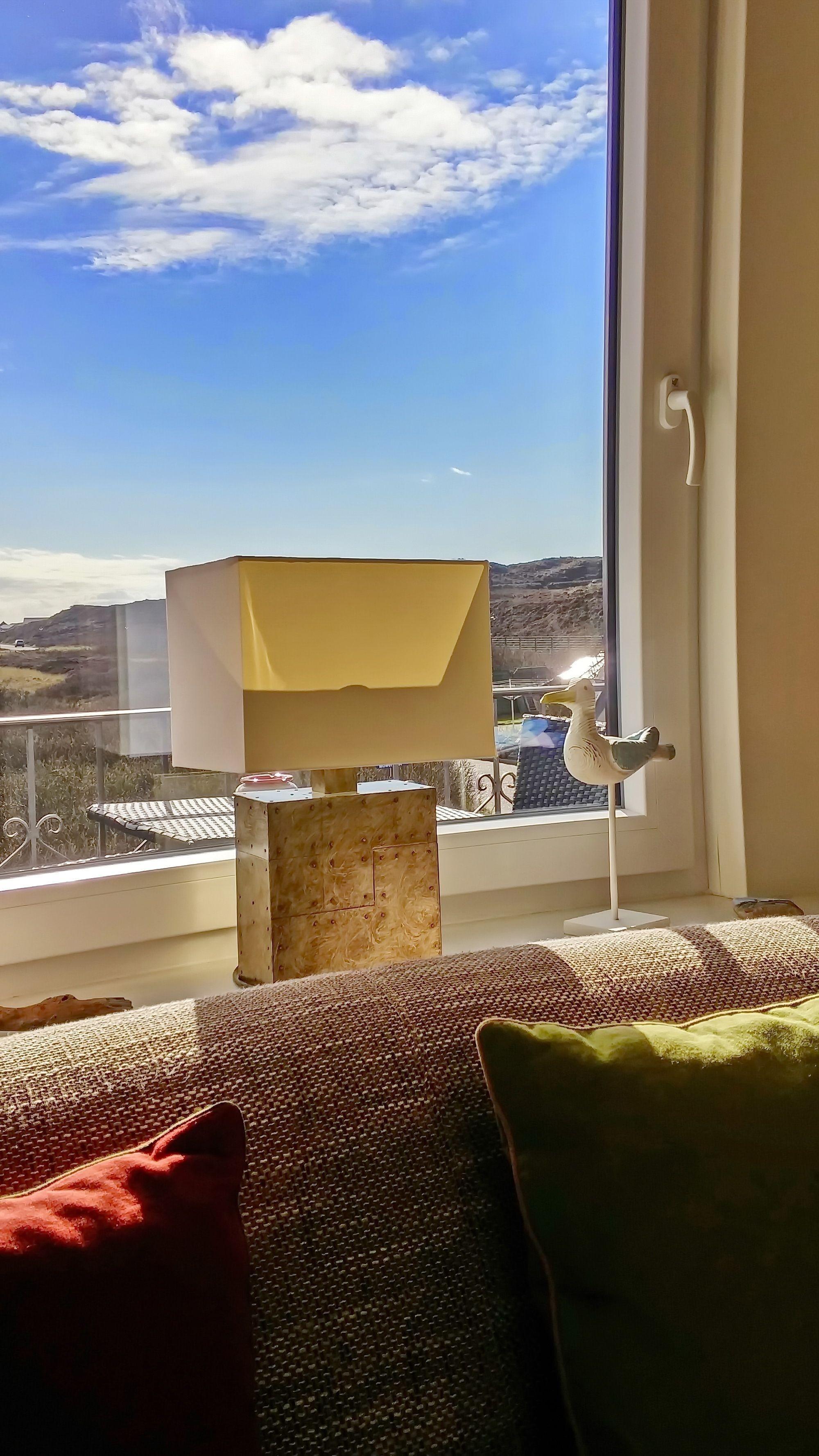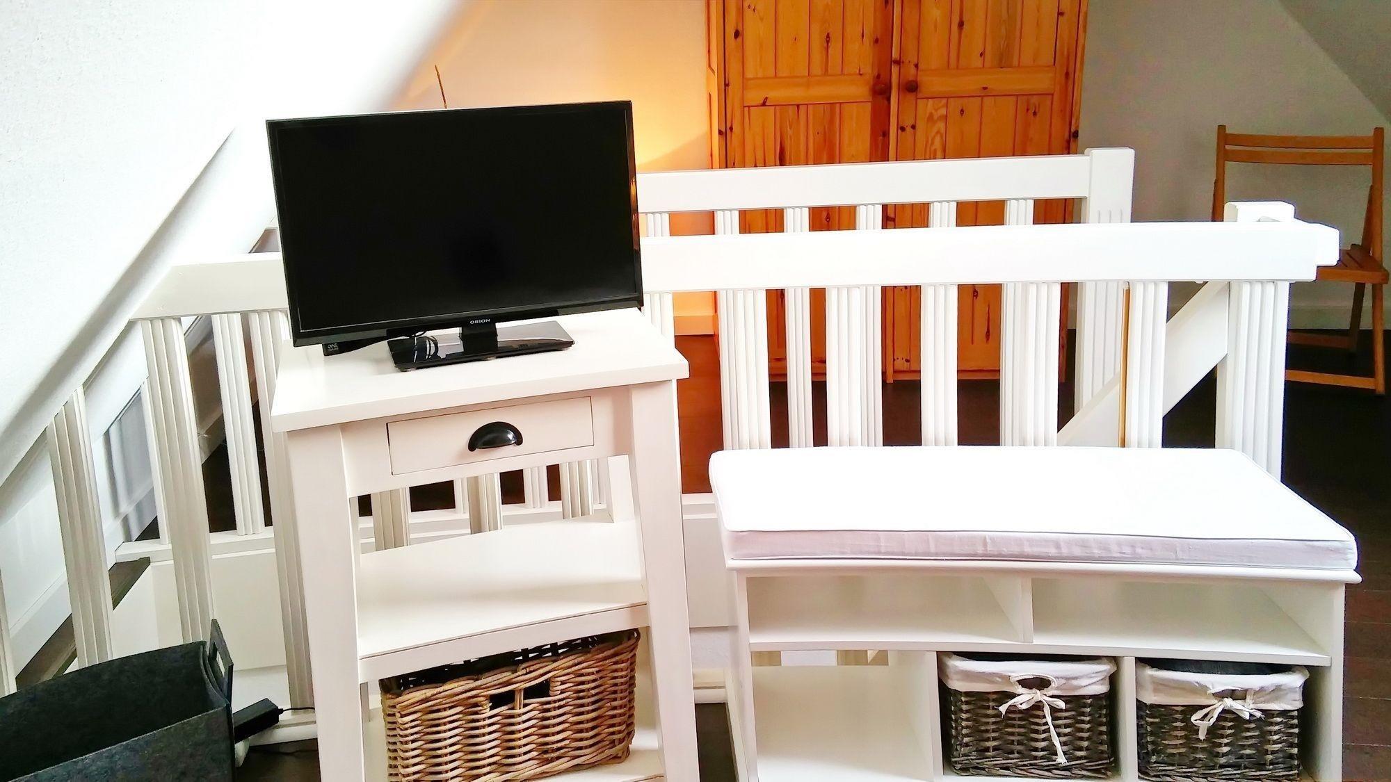 modernes 2 Zimmer Appartement mit ca. 48 m² über OG/DG in Hörnum-Nord; Im OG befindet sich ein Wohnraum mit einem Ecksofa, Tisch, Internet-Radio incl. CD-Funktion, Smart-TV, Glas-Esstisch mit 4 Stühlen im skandinavischen Design, Sideboard mit Mikrowelle, einer Nespresso-Kapselmaschine und Senseo Kaffeepadmaschine, Zugang zum Südbalkon mit Balkonmöbel von dem aus Sie einen fantastischen Blick Richtung Golfplatz und Leuchtturm haben. Separate Küche mit 2 Plattenherd, Kühlschrank mit Gefrierfach sowie ein Eierkocher. DuschbadWC mit Schminkspiegel. Flur mit Garderobe über den eine Wendeltreppe ins DG führt. Dort befindet sich ein Schlafraum mit Doppelbett (zwei einzelne Matratzen), Nachttisch, Sideboard mit kleinem TV und ein Kleiderschrank.