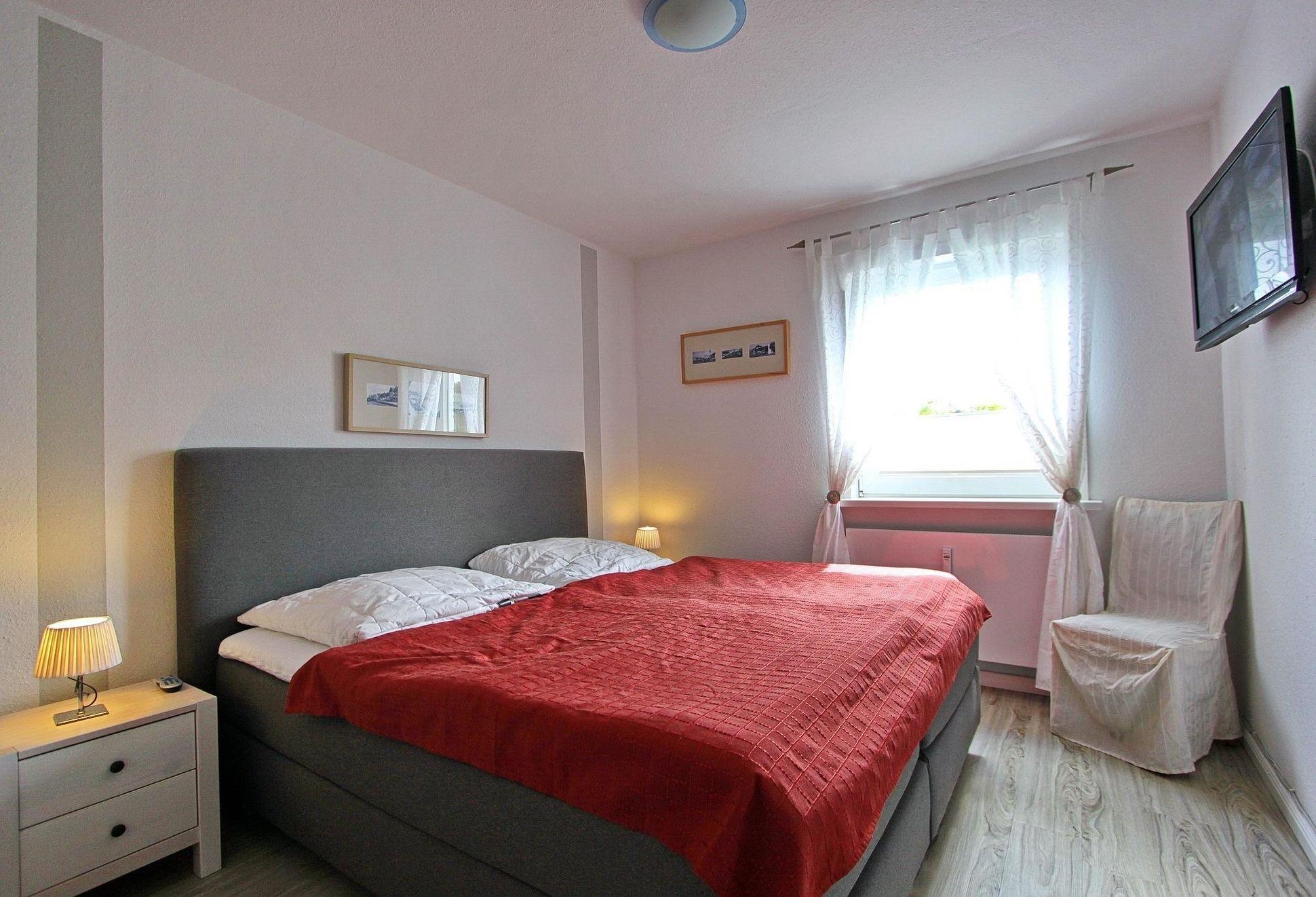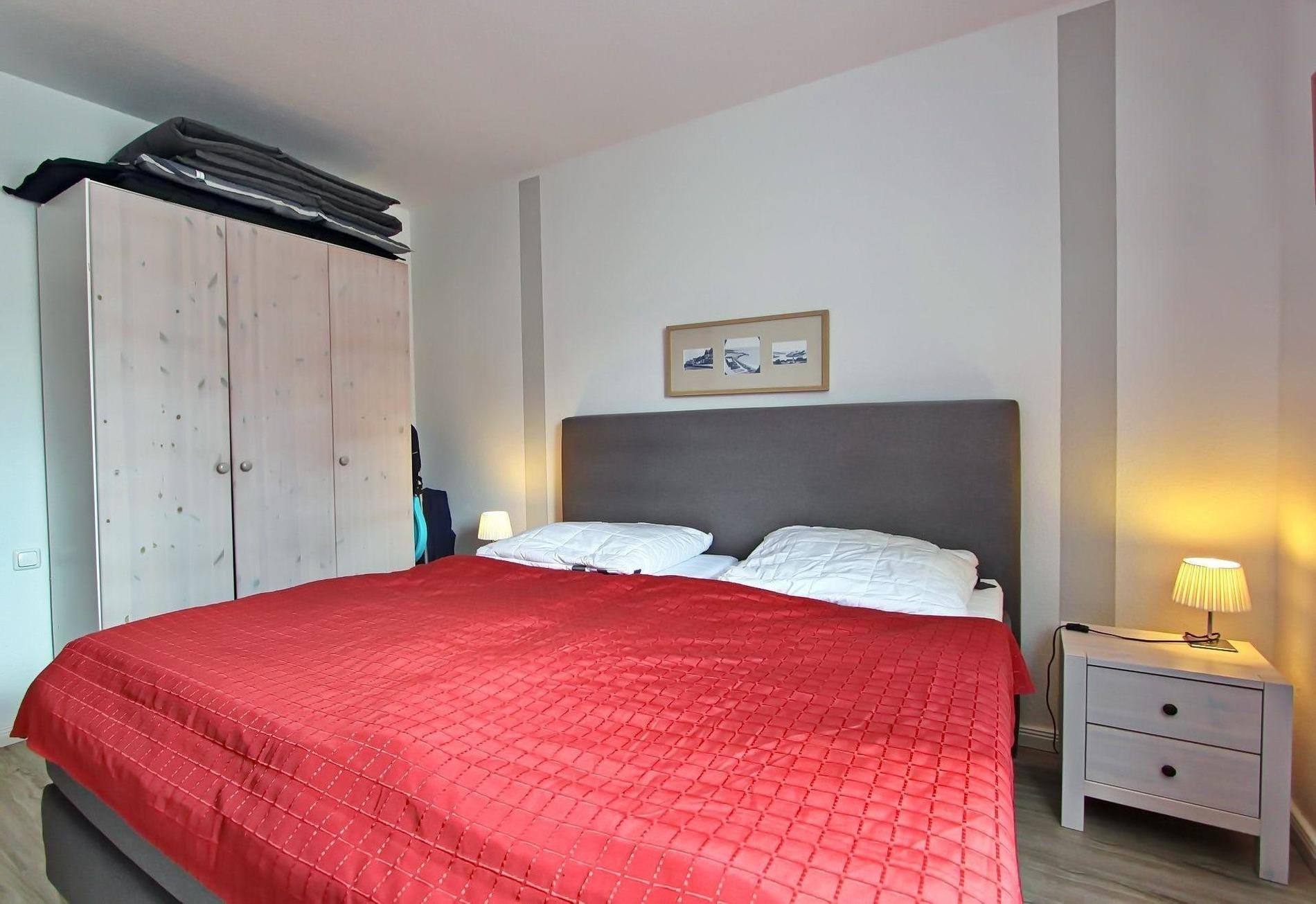 Im kleinen Schlafzimmer befindet sich ein Einzelbett (90 x 200 cm), ein kleiner Nachttisch sowie ein Kindersofa. Im großen Schlafzimmer befindet sich ein Doppelbett (180 x 200 cm) mit zwei Matratzen, Nachtschränke, ein Stuhl sowie ebenfalls ein Flatscreen-TV. Ein 3-türiger Kleiderschrank bietet ausreichend Stauraum. Das Bad verfügt über ein Wannenbad mit Duschtrennwand sowie ein Waschtisch und das WC.
