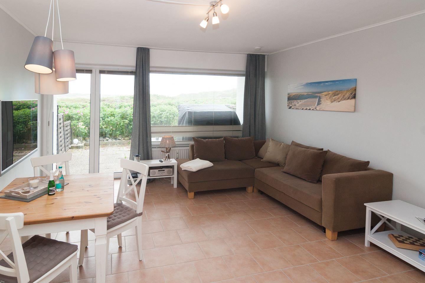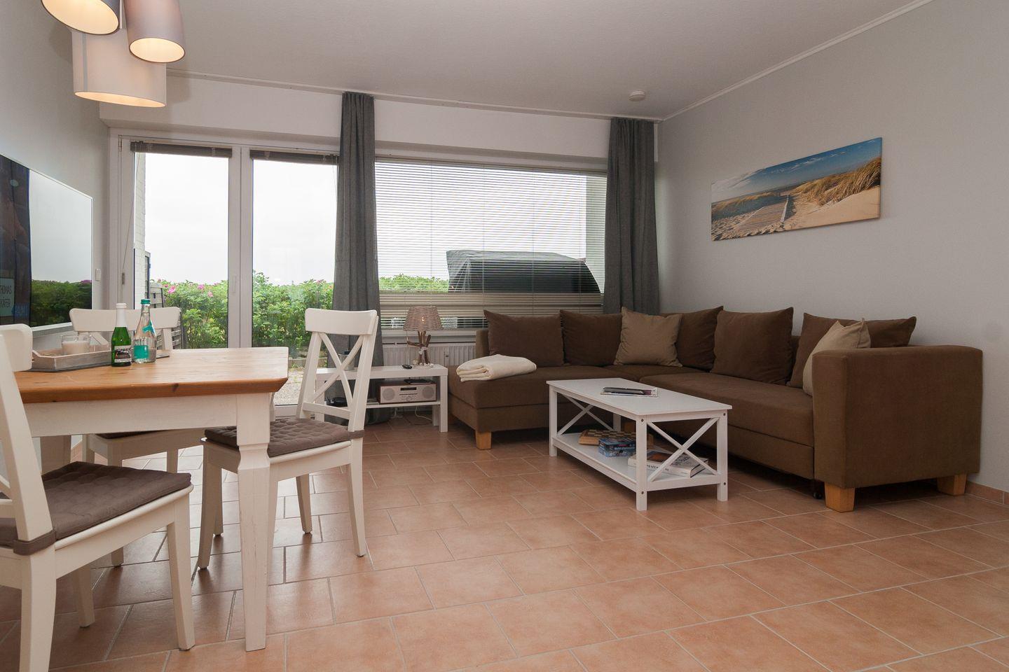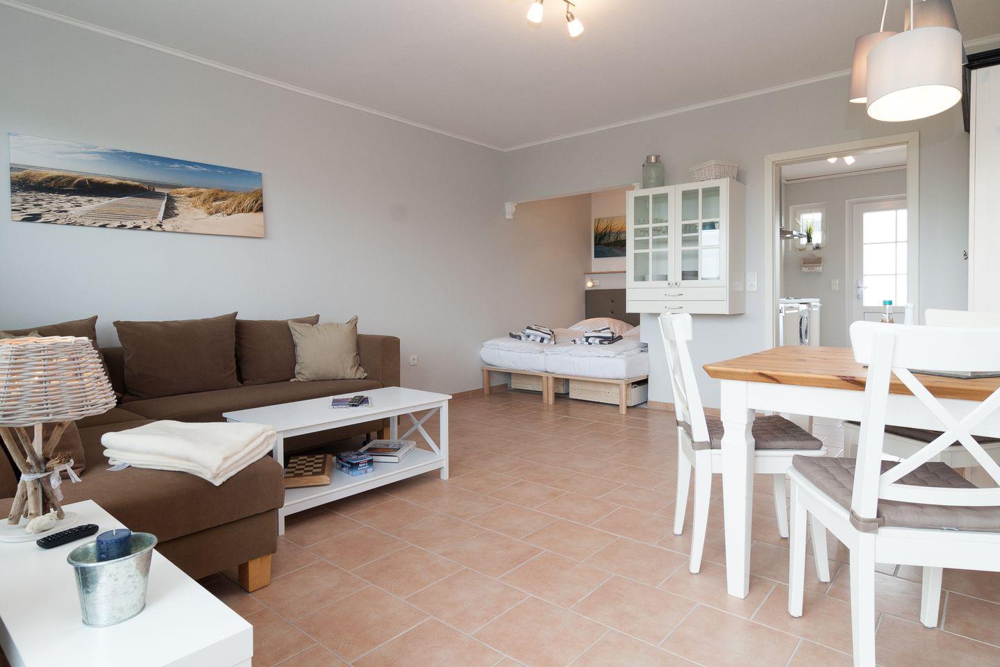 Moderne und helle Ferienwohnung mit einem Duschbad und einer separaten Küchenzeile. Im Wohnraum befinden sich eine gemütliche Sofaecke mit Flachbildschirm und einem gemütlichen Essbereich. Vom Doppelbett können Sie auch die abendlichen Nachrichten im Fernsehen genießen. Das Appartement verfügt über eine Süd-Terrasse mit Strandkorb mit einem wunderschönen Ausblick in Richtung Süden. Zum Appartement gehört ein Pkw-Stellplatz.