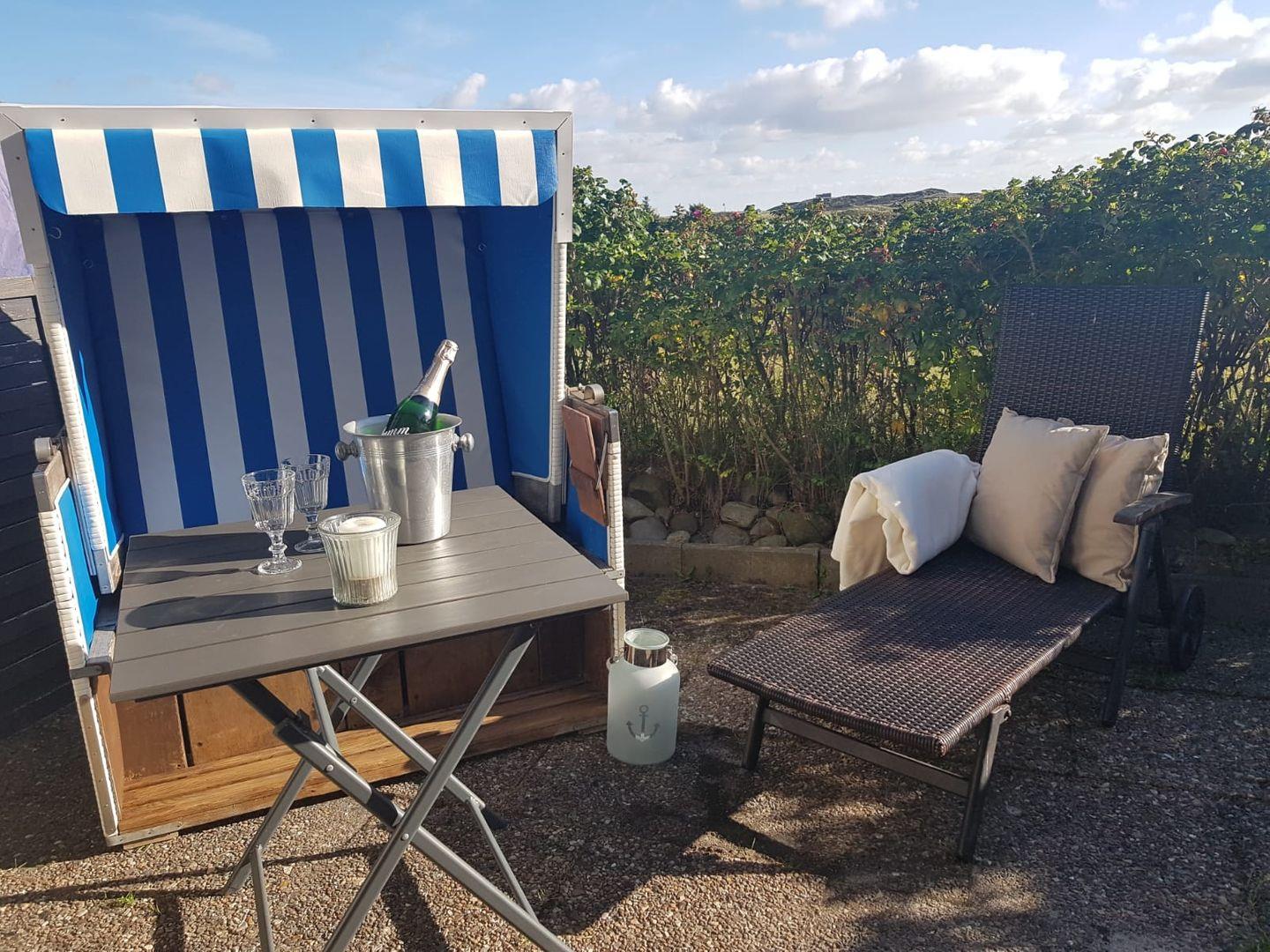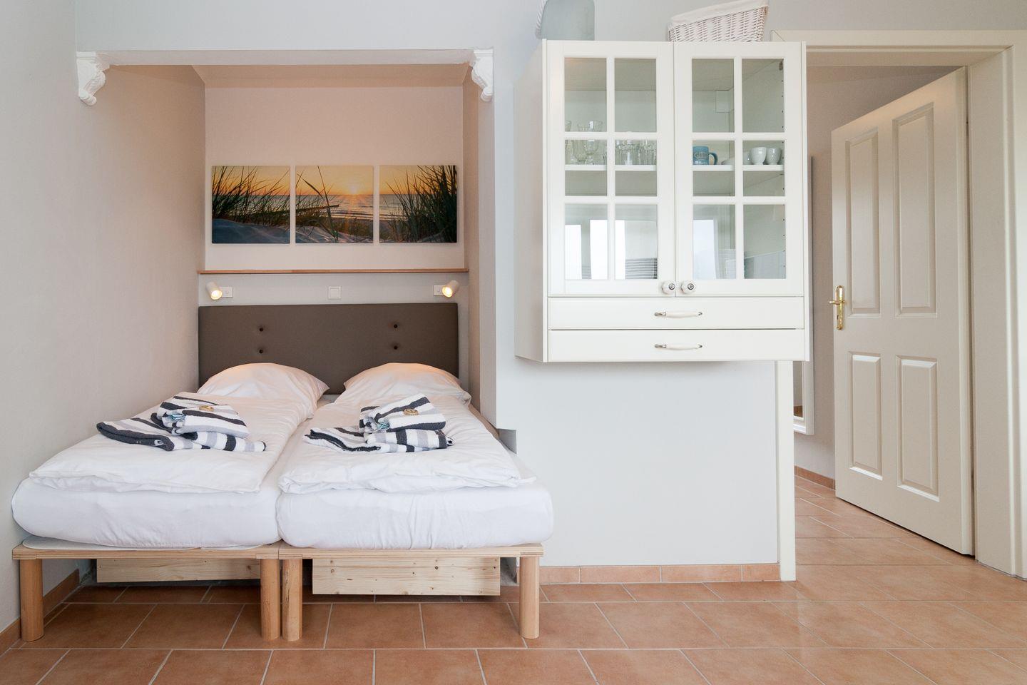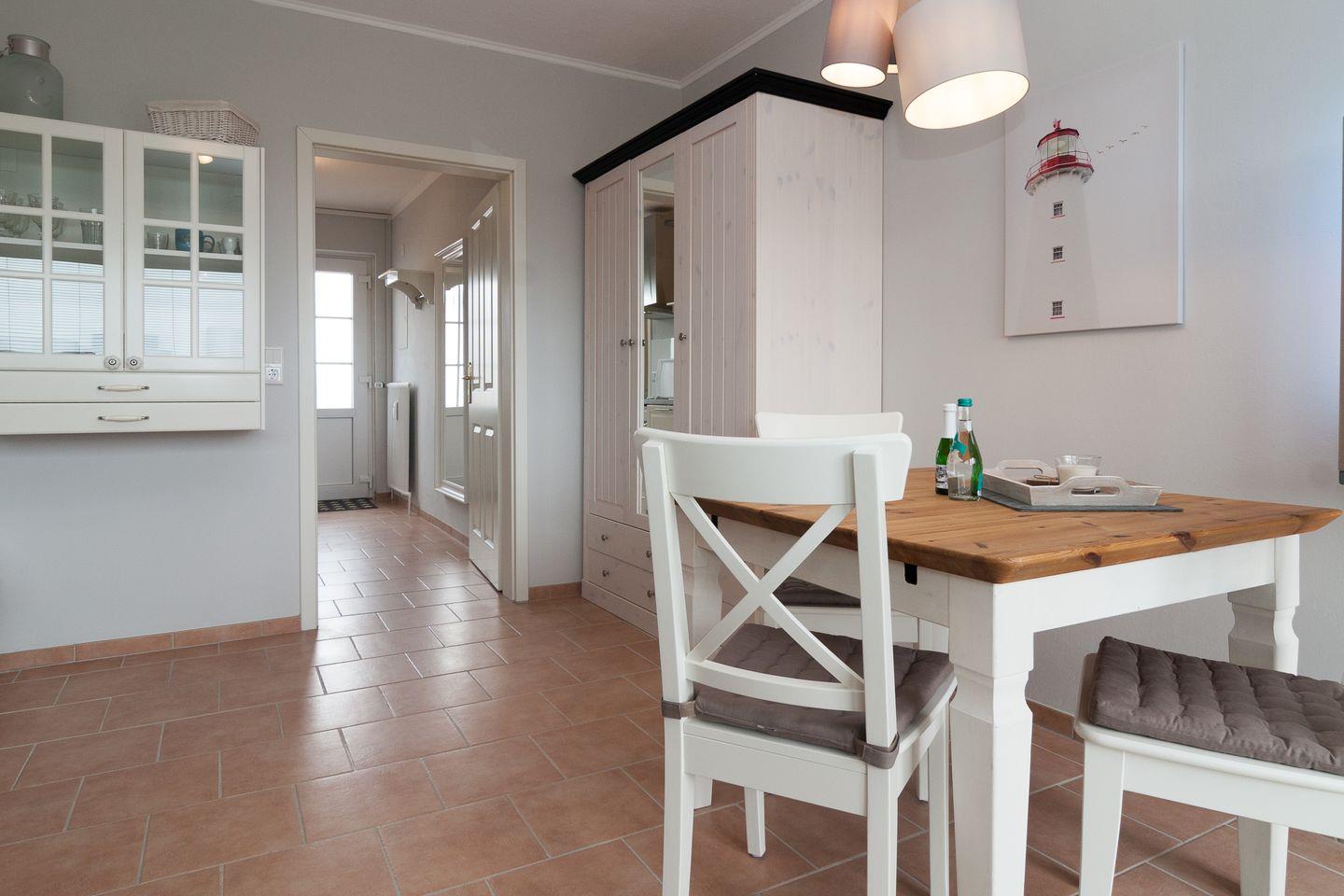 Moderne und helle Ferienwohnung mit einem Duschbad und einer separaten Küchenzeile. Im Wohnraum befinden sich eine gemütliche Sofaecke mit Flachbildschirm und einem gemütlichen Essbereich. Vom Doppelbett können Sie auch die abendlichen Nachrichten im Fernsehen genießen. Das Appartement verfügt über eine Süd-Terrasse mit Strandkorb mit einem wunderschönen Ausblick in Richtung Süden. Zum Appartement gehört ein Pkw-Stellplatz.