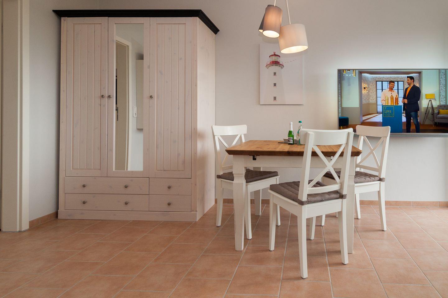 Moderne und helle Ferienwohnung mit einem Duschbad und einer separaten Küchenzeile. Im Wohnraum befinden sich eine gemütliche Sofaecke mit Flachbildschirm und einem gemütlichen Essbereich. Vom Doppelbett können Sie auch die abendlichen Nachrichten im Fernsehen genießen.