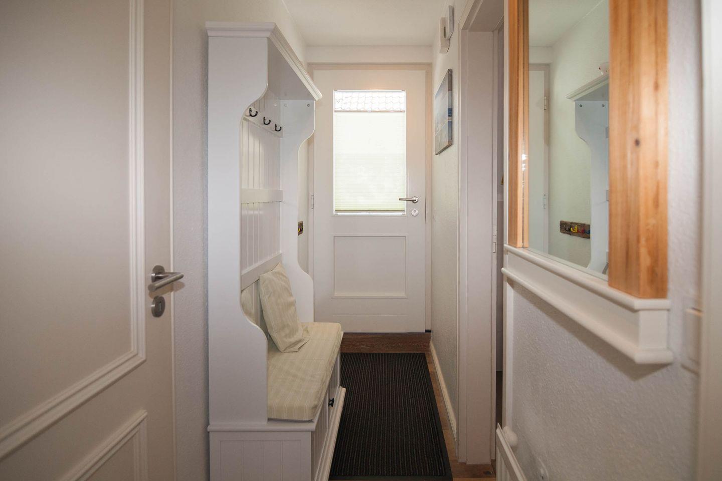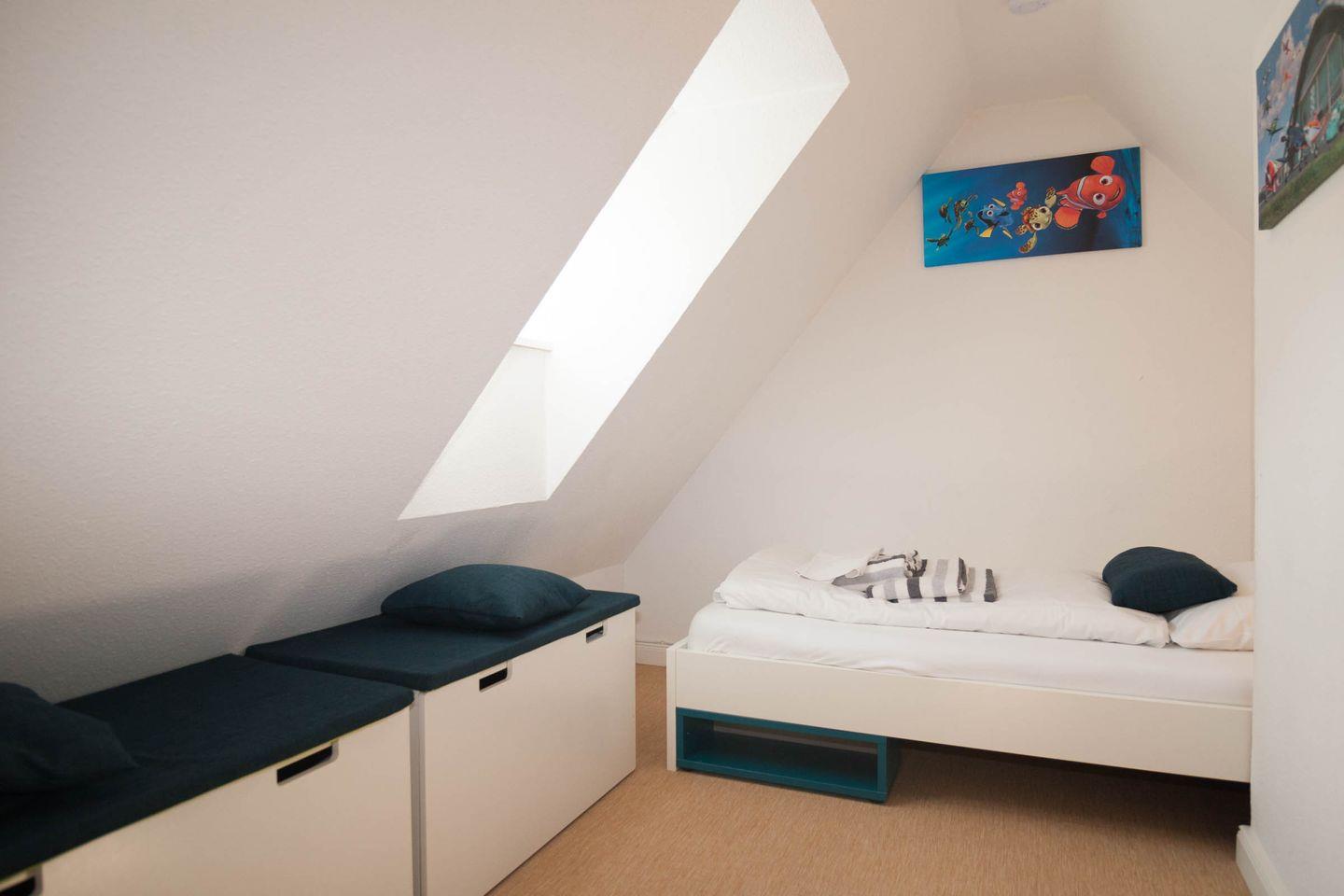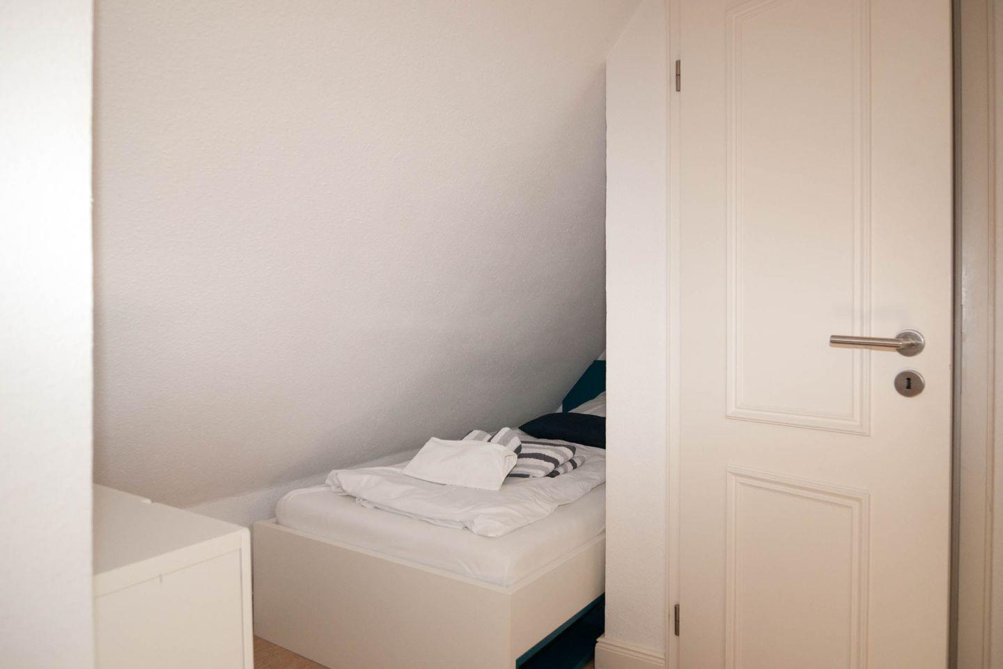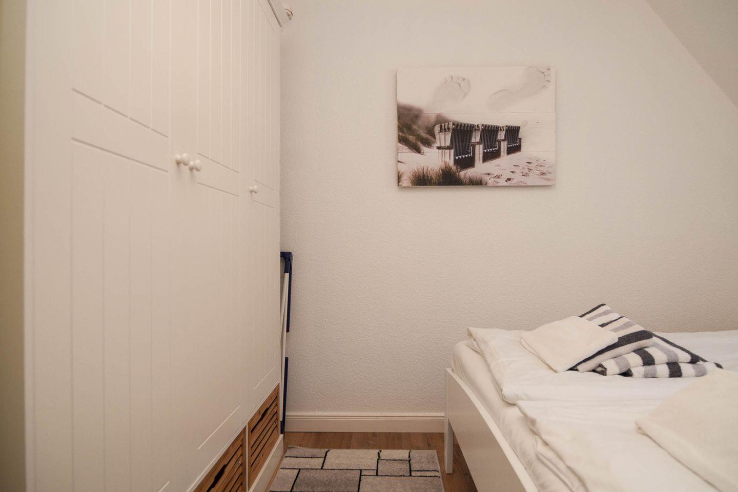In dieser Ferien-Maisonette im Herzen von Hörnum ist an alles gedacht. Vom Flurbereich gelangen Sie in das Schlafzimmer mit Doppelbett kuschelig unter der Dachschräge.