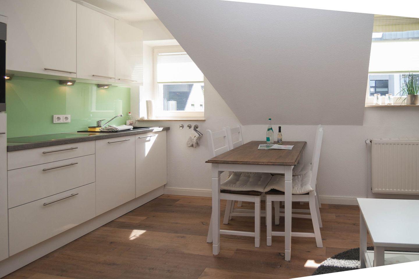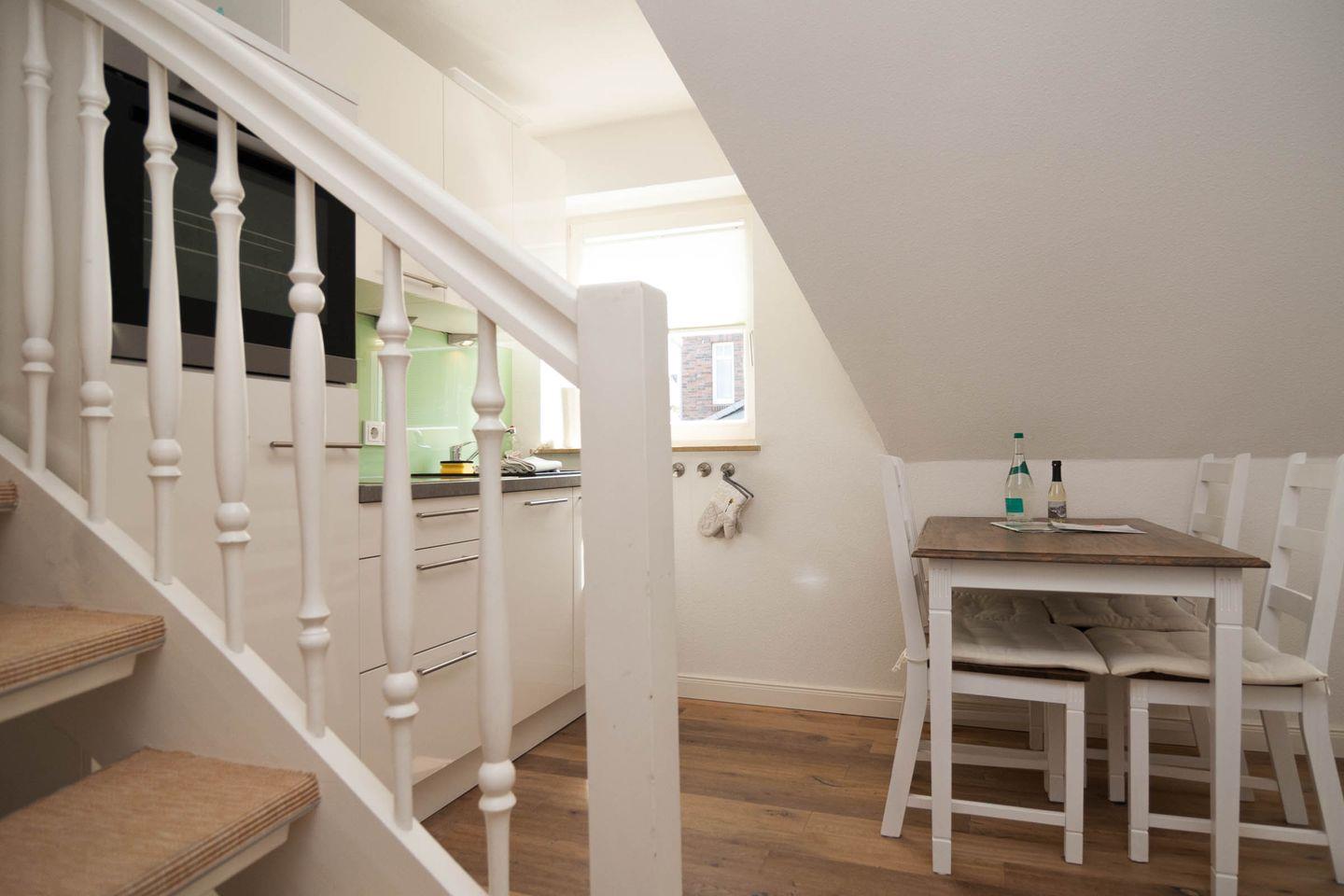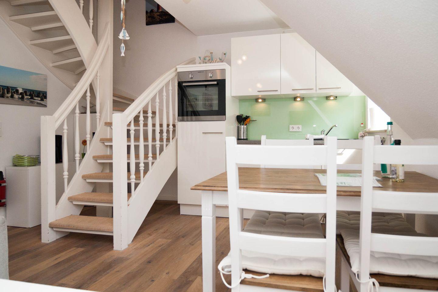 Gegenüber befindet das moderne Duschbad und geradeaus der komfortable Wohnraum mit Esstisch und Küchenzeile. Von dort geht es über die offene Treppe in das 2. Schlafzimmer unter dem Dach, mit Doppelbett, das Erwachsene wie auch Kinder lieben werden.