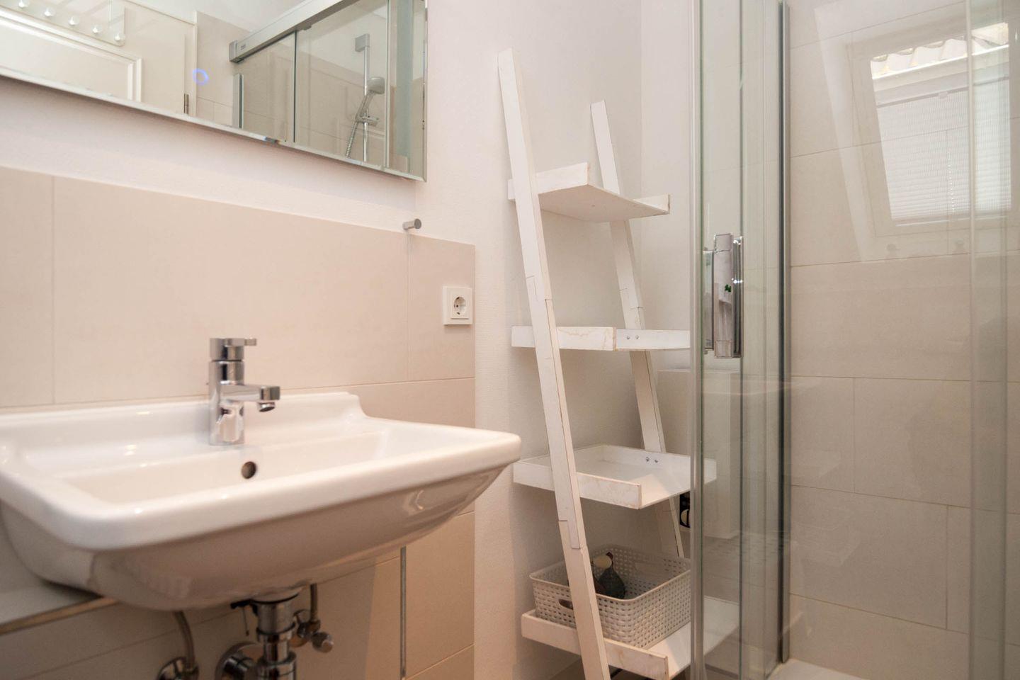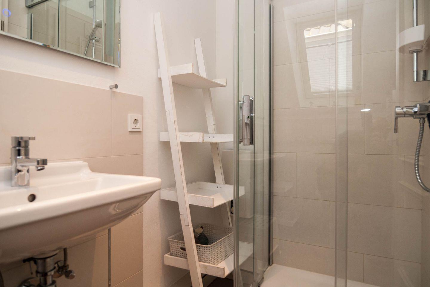 Desweiteren ist die Küche mit Wasserkocher, Toaster, Nespresso-Kapselmaschine, Milchschäumer, WMF Kaffeemaschine, Mixer, Pürierstab und Küchenwaage ausgestattet. Weiterhin stehen Ihnen in der Wohnung ein Föhn, Bügeleisen, Bügelbrett, Wäscheständer und Staubsauger zur Verfügung.