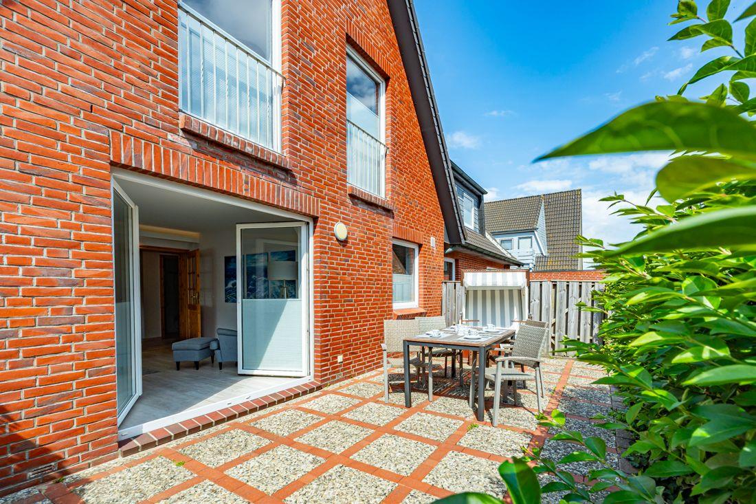 Vom Wohnbereich erreichen Sie die eigene Terrasse mit Gartenmöbeln und Strandkorb (Saisonal)