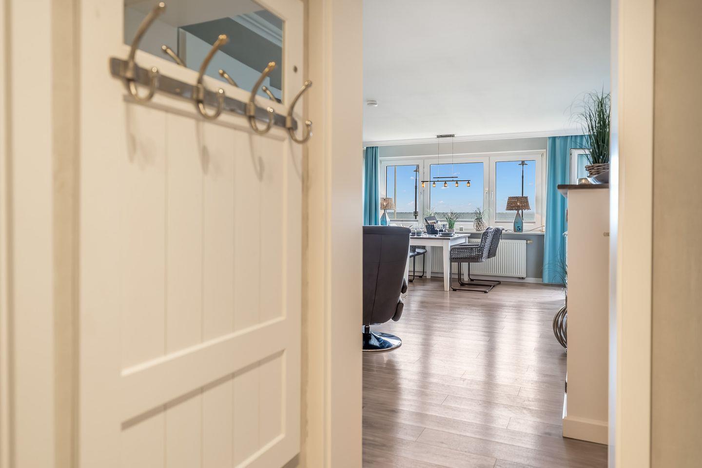 Die moderne Ferienwohnung „Strand und Meer“ ist etwas für Inselliebhaber, die einen fantastischen Ausblick auf das Meer suchen. Der hell gestaltete Wohnbereich verfügt über eine gemütliche Sitzgelegenheit, TV sowie einem Essbereich von wo aus Sie freie Sicht auf die Hörnumer Promenade haben. Vom Wohnbereich gelangen Sie direkt zum angrenzenden Balkon. Das Hauptschlafzimmer der 70qm großen Wohnung verfügt über ein gemütliches Doppelbett sowie einem Kleiderschrank.