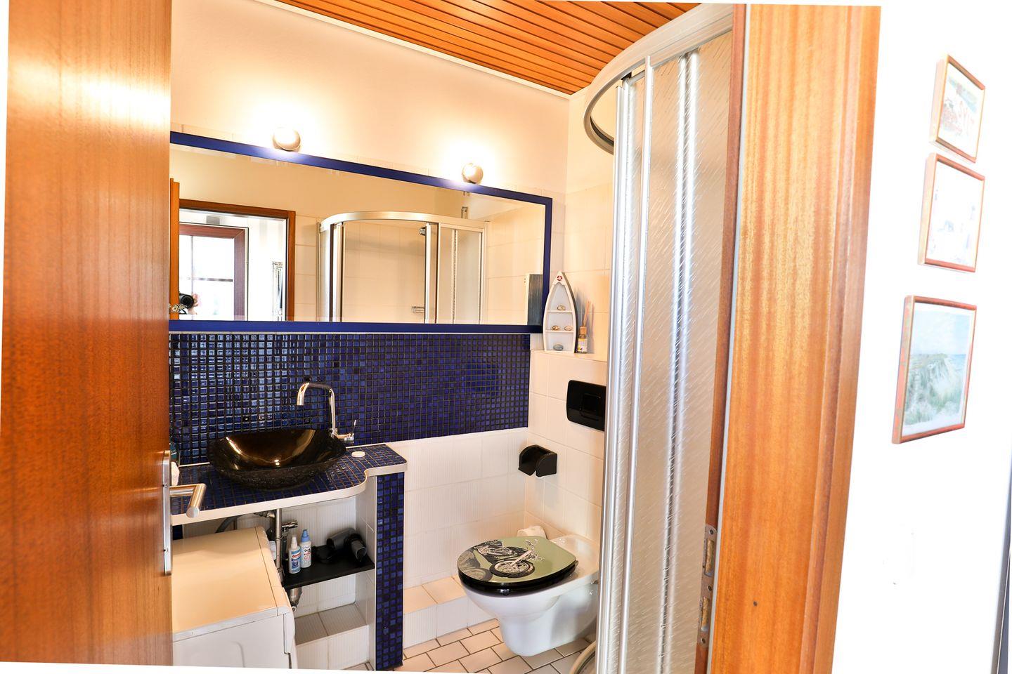 Spiegel, Dusche, Waschmaschine und WC. Durch den Flur mit großzügigem Stauraum,