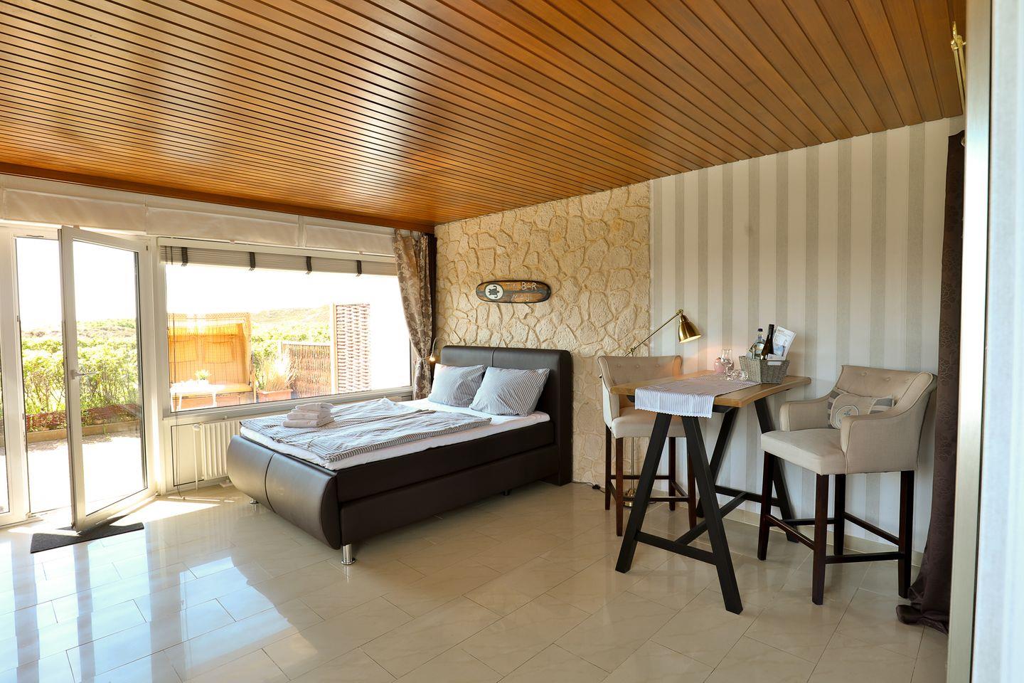 gelangen Sie in das Wohn- /Schlafzimmer mit großer Fensterfront. Ausgestattet