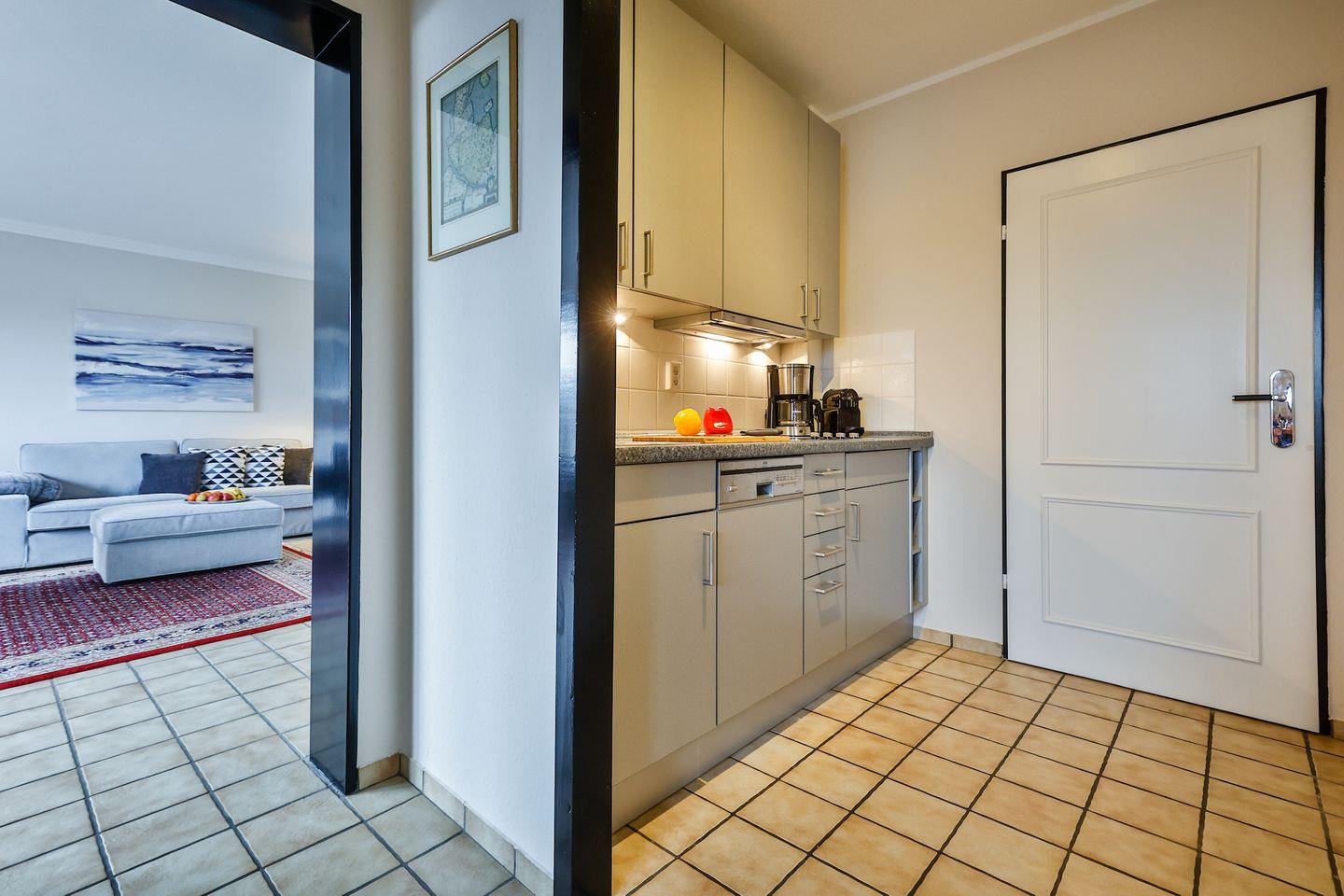 Im Eingangsbereich befindet sich eine moderne, voll ausgestattete Küchenzeile