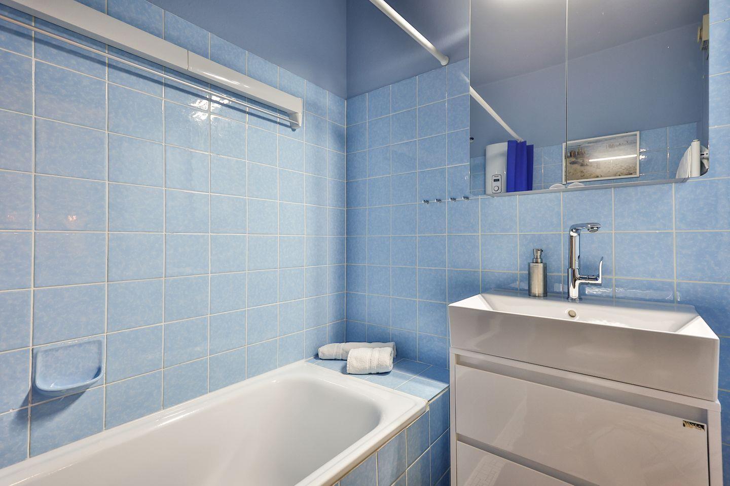 einigen Ablagemöglichkeiten erreicht man das maritime Badezimmer mit Badewanne,