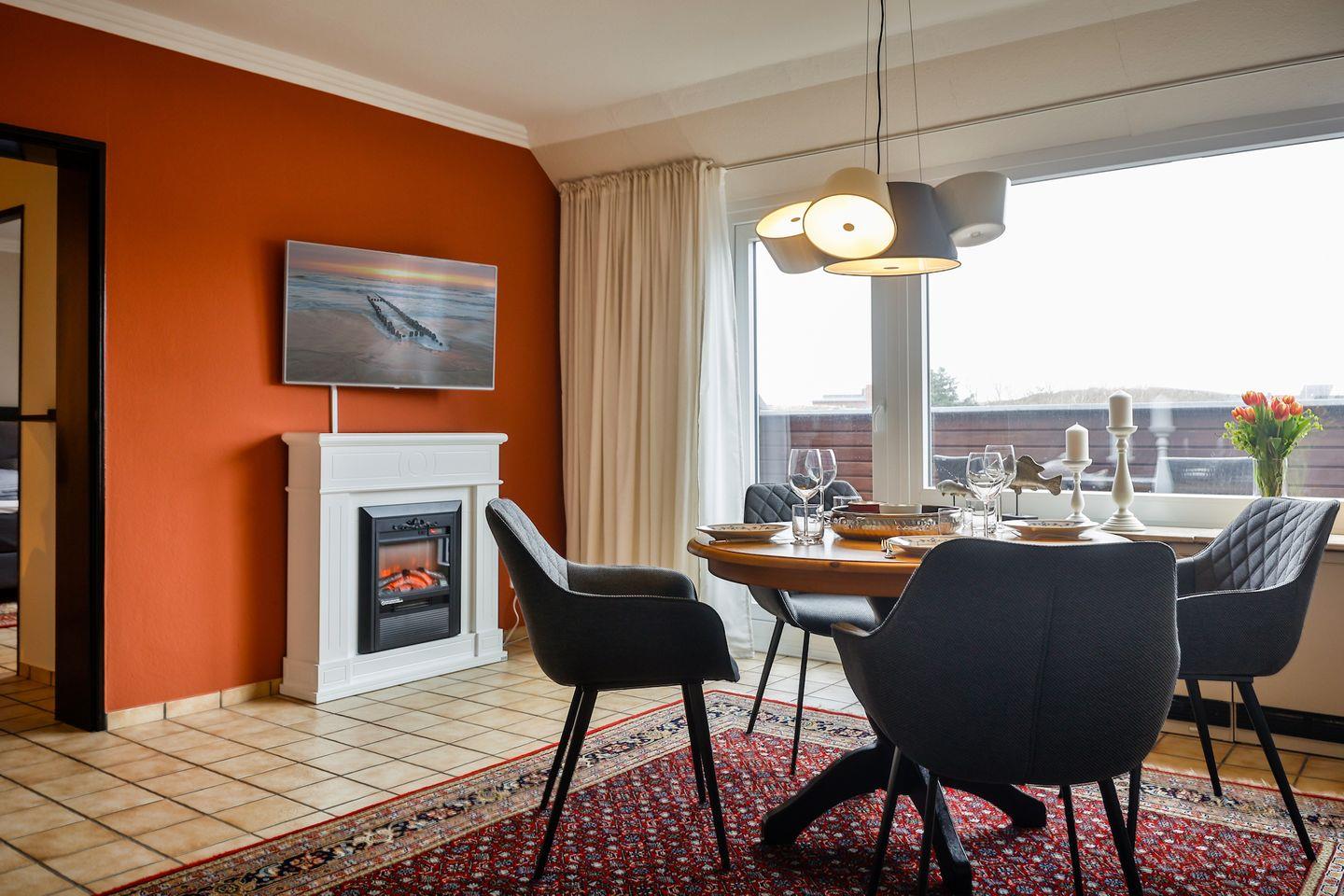 der Wohnbereich mit einem Elektrokamin sowie einem Fernseher.
