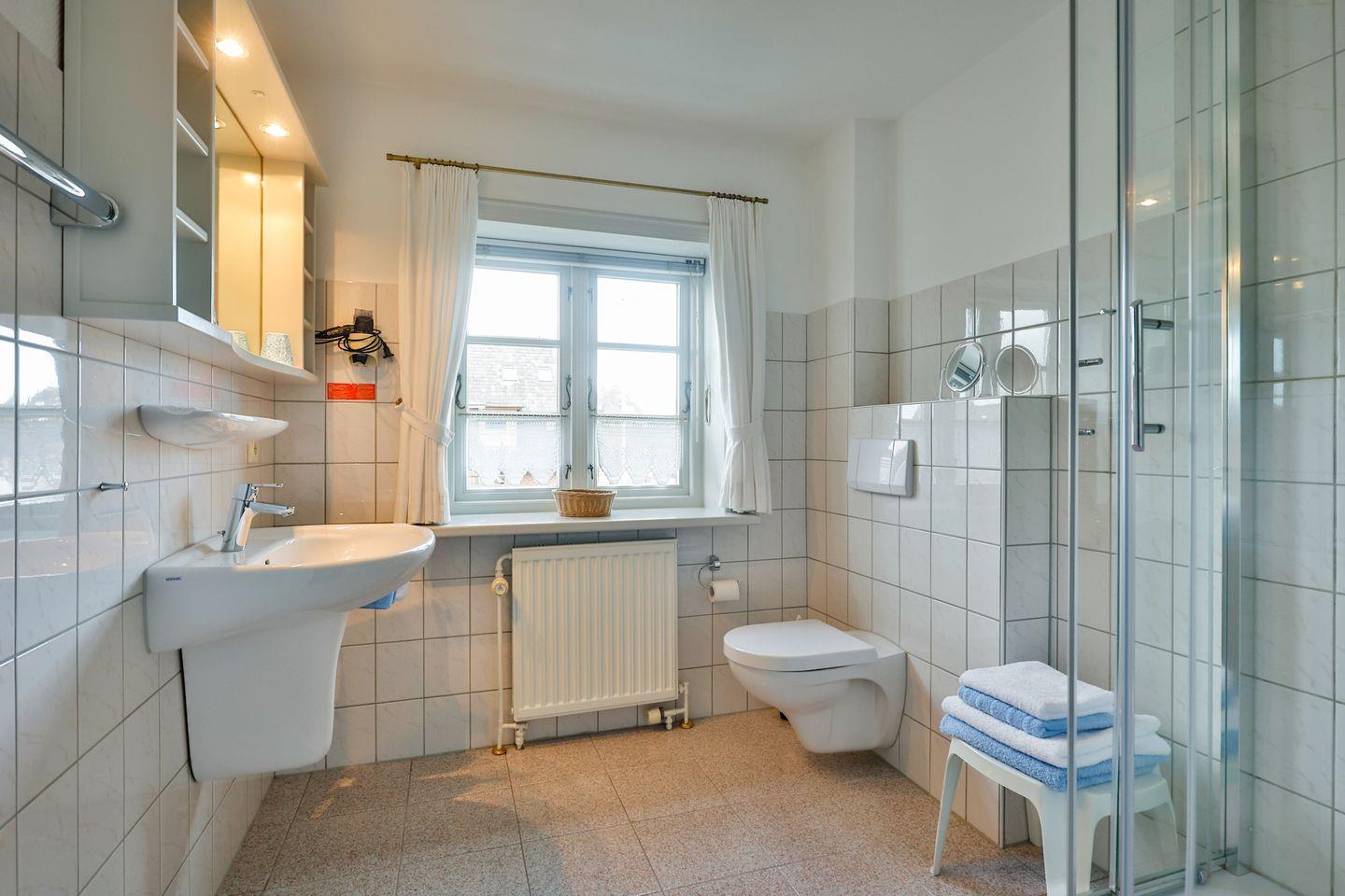 Das großzügige Tageslichtbad verfügt über eine Dusche sowie ein WC und