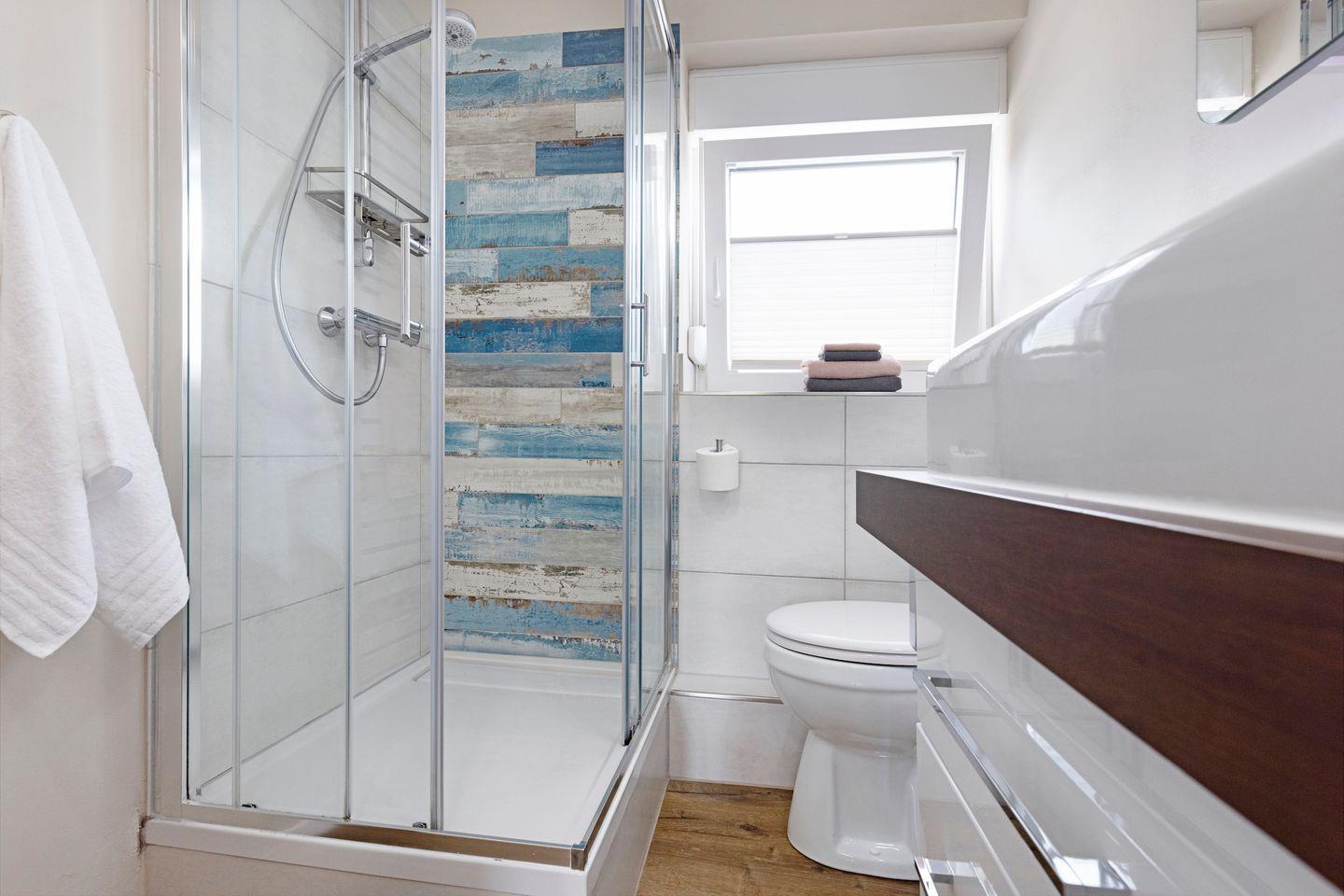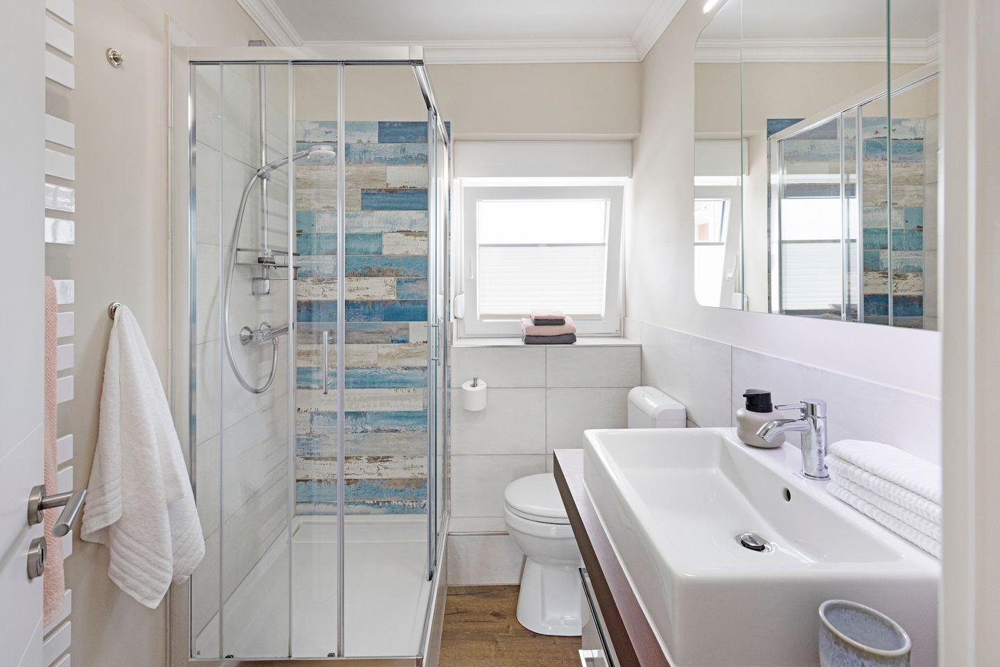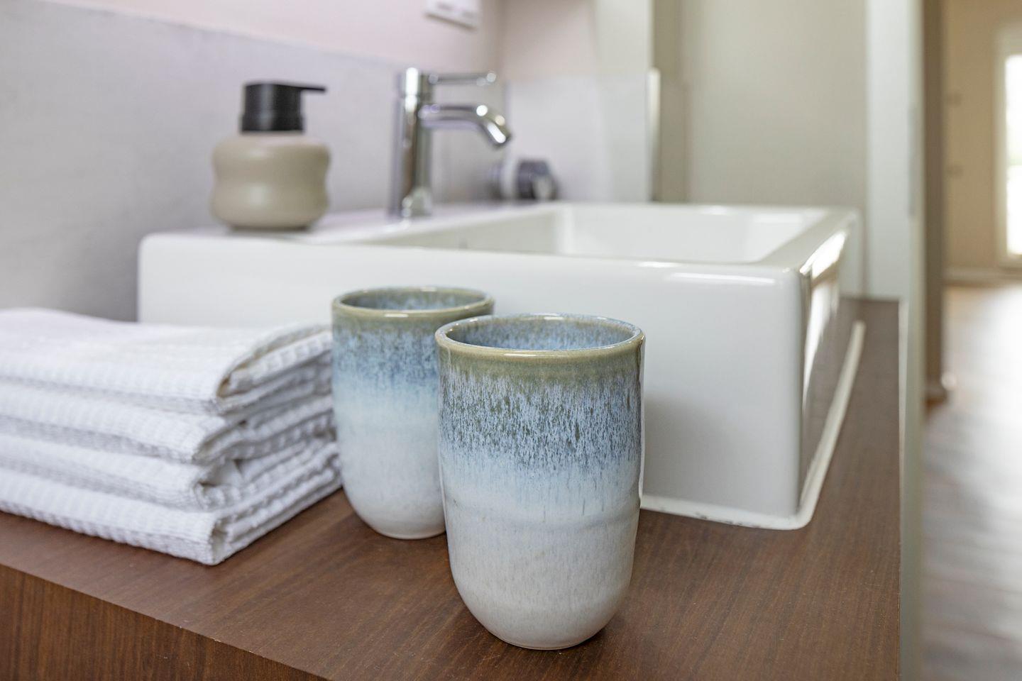 Beginnen Sie Ihren Urlaubstag im stilvollen Tageslichtbad. Dieses verfügt über
