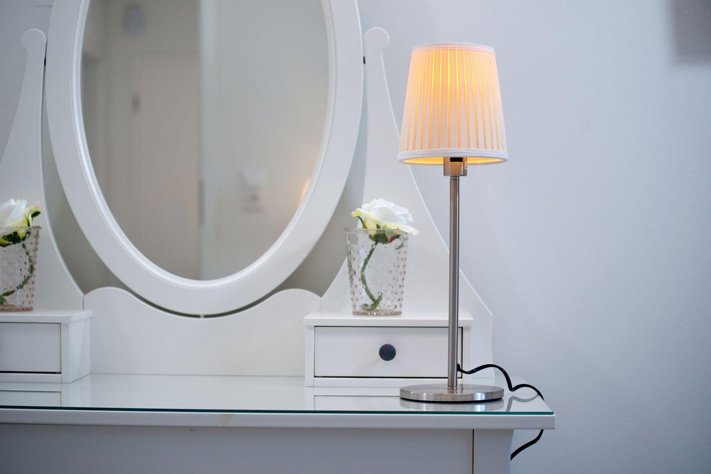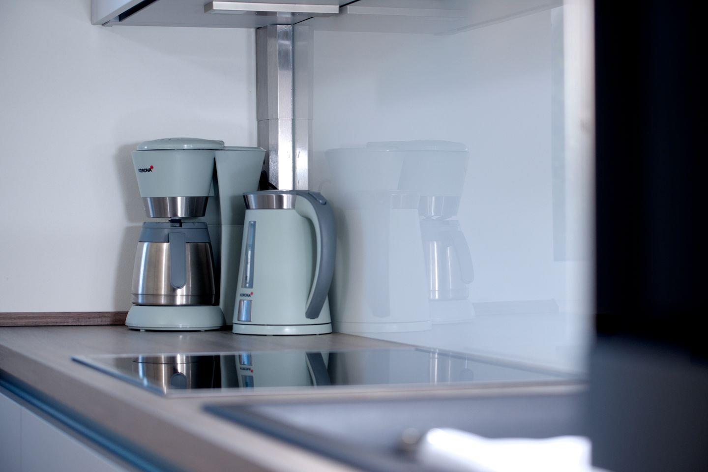 Die Wohnung verfügt über eine separate Küche, die vollständig eingerichtet ist und einen kleinen Frühstücksplatz mit Morgensonne bietet. Das moderne Design der Wohnung setzt sich auch hier in der Küche fort. Das Badezimmer der Wohnung beeindruckt mit einer Kombination aus dunklen Fliesen, Weiß, Glas und einer bodenebenen Dusche. Die beiden getrennten Schlafzimmer sind jeweils mit einem Doppelbett und einem Schrank ausgestattet, ergänzt durch einen Frisiertisch und eine Kommode.