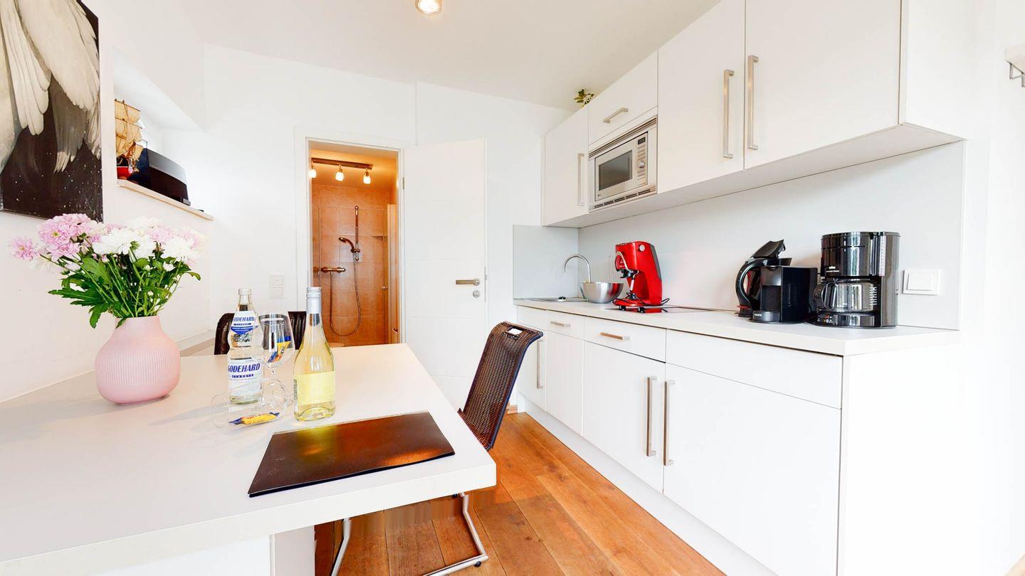 Haus mit 4 Wohnungen. Diese Wohnung liegt im Ergeschoss auf der linken Seite. Massivholzdielen in gekalkter Eiche, Küchenzeile mit Essplatz, Küche mit Geschirrspüler, Cerankochfeld, Kühlschrank, Mikrowelle, Kaffeemaschine, Espressomaschine mit neuem Geschirr und Töpfen pp. Kleines Schlafzimmer mit Doppelbett, Flatscreen, Internet-Zugang mit W-lan, Telefonfestnetzflatrate, CD, DVD, Radio, Ipod-Anschluss.