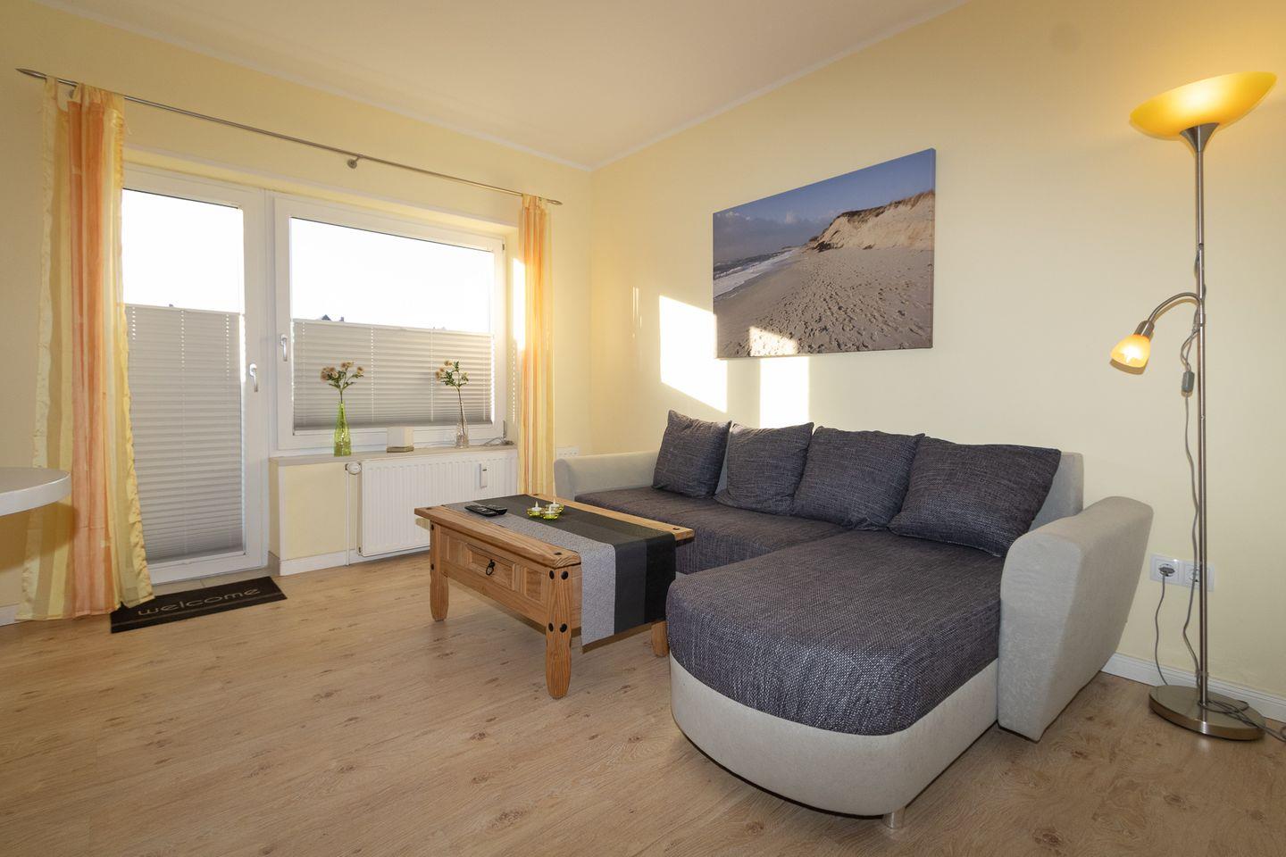 Gemütlich und modern eingerichtetes Appartement mit Wlan. Die Wohnung hat einen Wohnraum (mit Sitz- und Essecke, Sat-Fernsehen und Radio mit CD-Player). Der Schlafraum ist abgeteilt vom Wohnraum. Die Küche ist separat und komplett ausgestattet mit Waschmaschine, Geschirrspüler , 4 Plattenherd, Backofen, Kaffeemaschine usw. Das Bad ist mit einer Dusche ausgestattet. Lage in (Hörnum - Nord) in einer Seitenstraße unterhalb der Dünen zum Weststrand. Zum Badestrand sind es 5 Gehminuten.