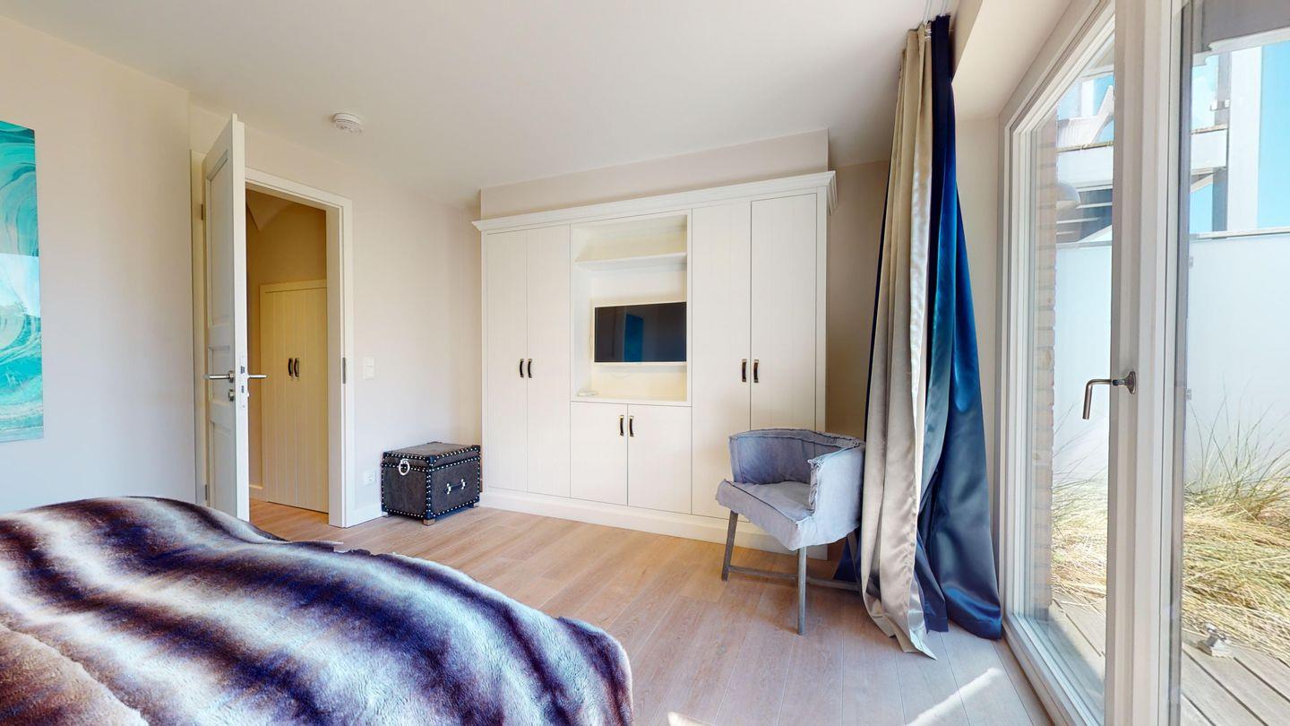 Die Wohnung verfügt über zwei Schlafzimmer, die Ihnen angenehme Ruhe und Privatsphäre bieten. Das Hauptschlafzimmer ist mit einem einladenden Doppelbett ausgestattet, von dem aus Sie direkt auf Ihre eigene Terrasse gelangen. Auf dieser Terrasse können Sie entspannte Stunden im Strandkorb verbringen, die salzige Meeresluft genießen und den Blick über die Umgebung schweifen lassen. Ein perfekter Ort, um den Tag zu beginnen oder abzuschließen.